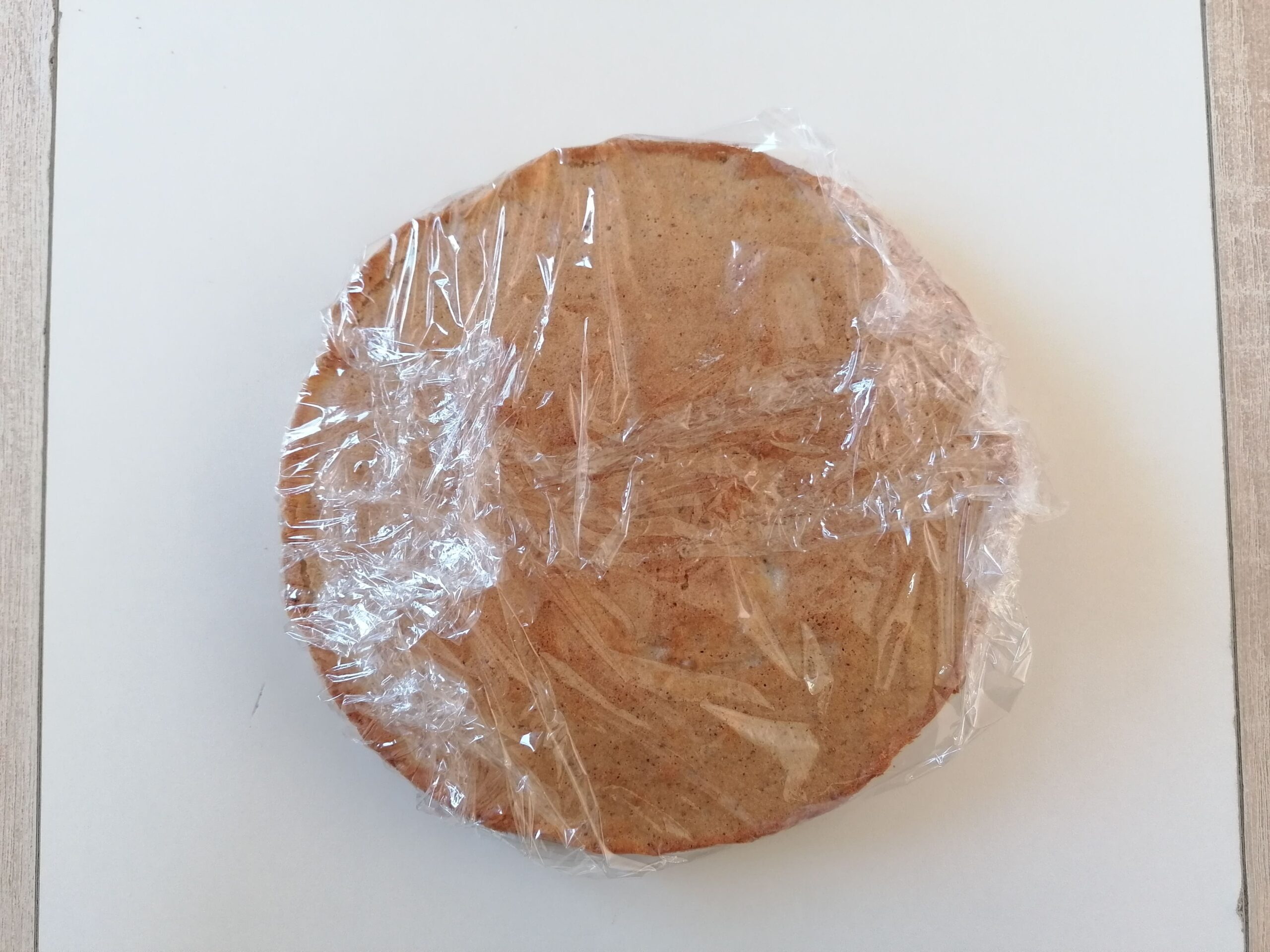 - Filmer le biscuit pain de Gênes en l’emprisonnant entièrement dans du film étirable puis le réserver au froid minimum 2h, voir 1 nuit, ceci afin de facilité sa découpe qui sera alors plus nette à froid.