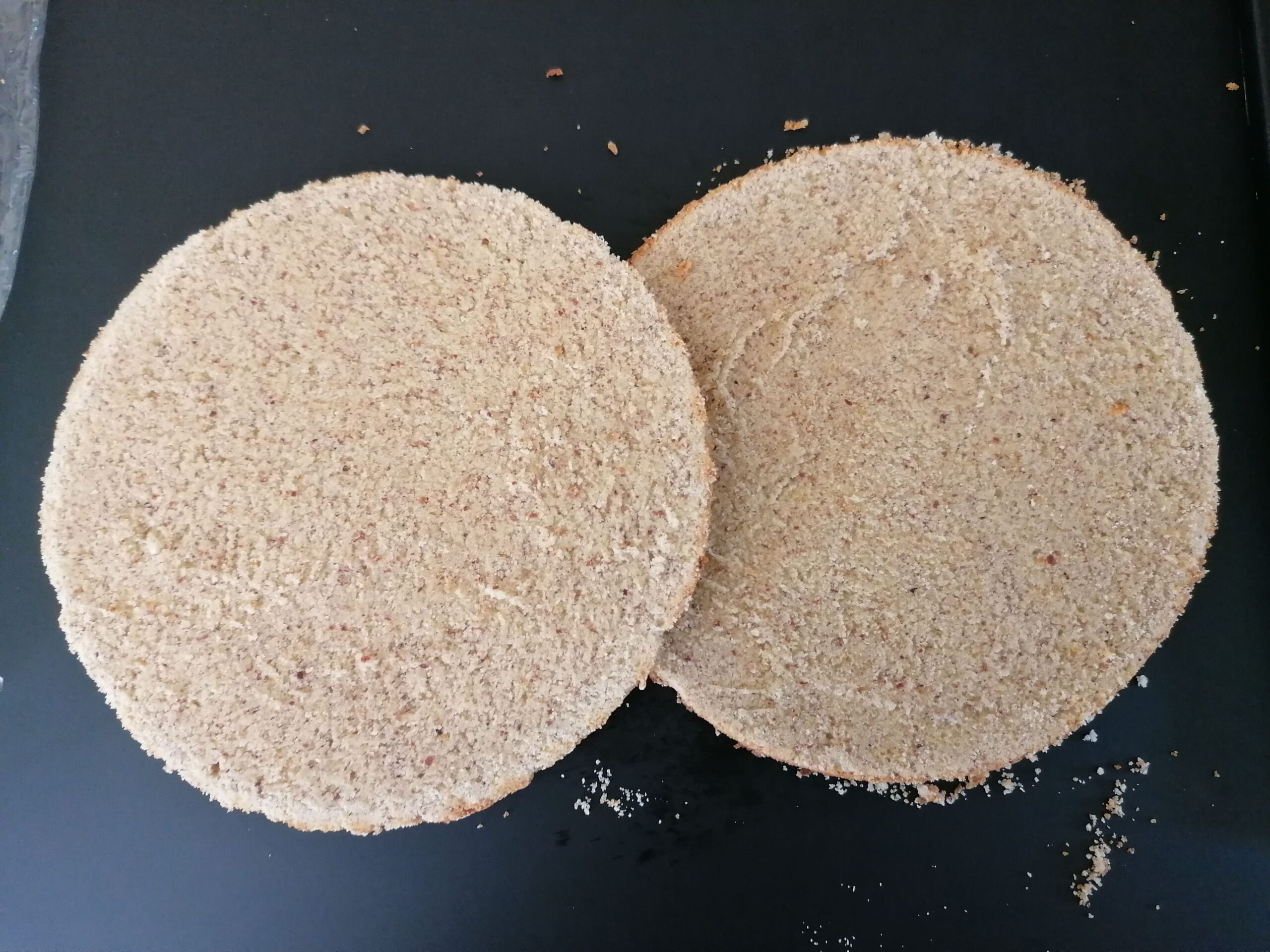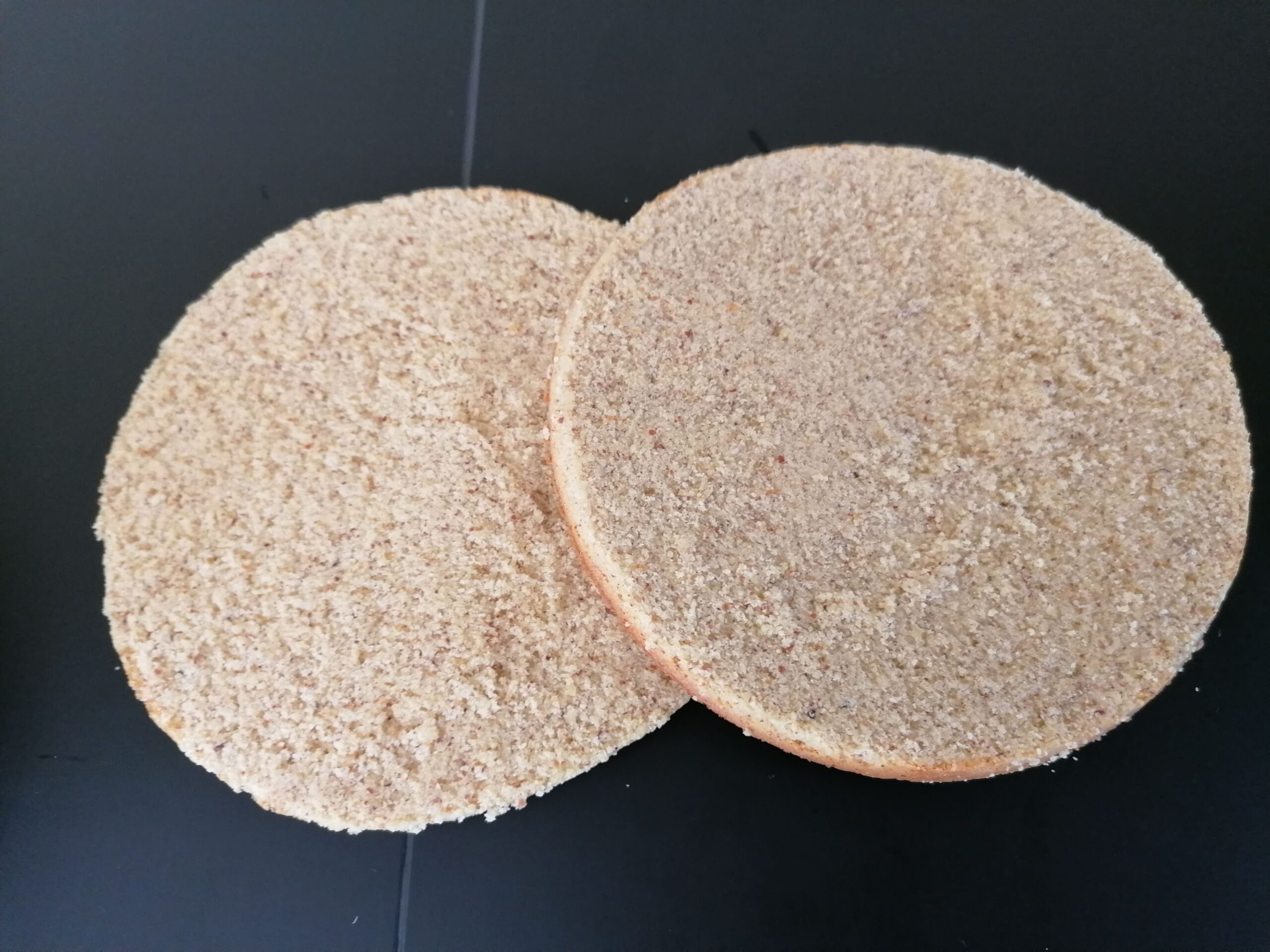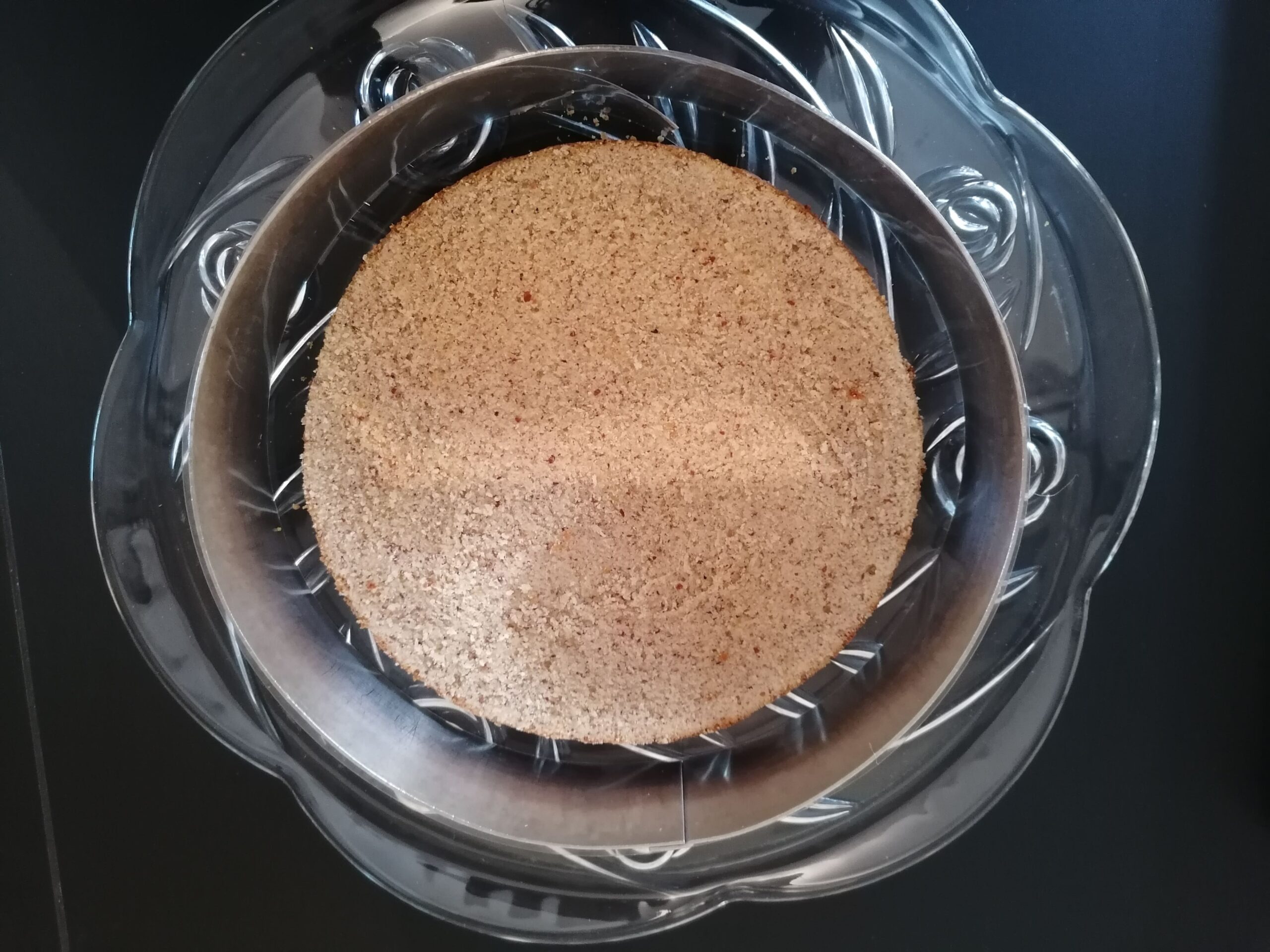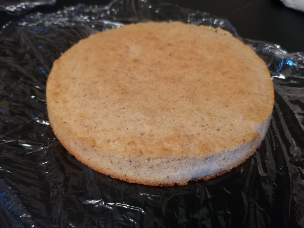 - Récupérer le biscuit pain de Gênes laissé au froid puis retirer le film étirable l’entourant.