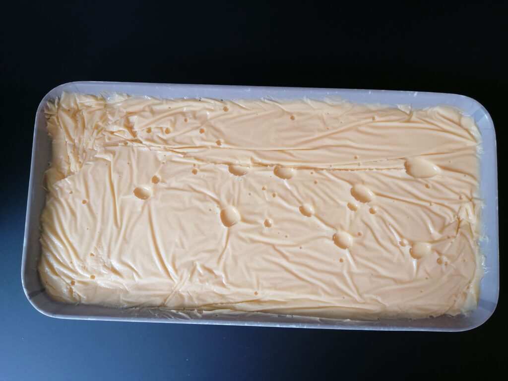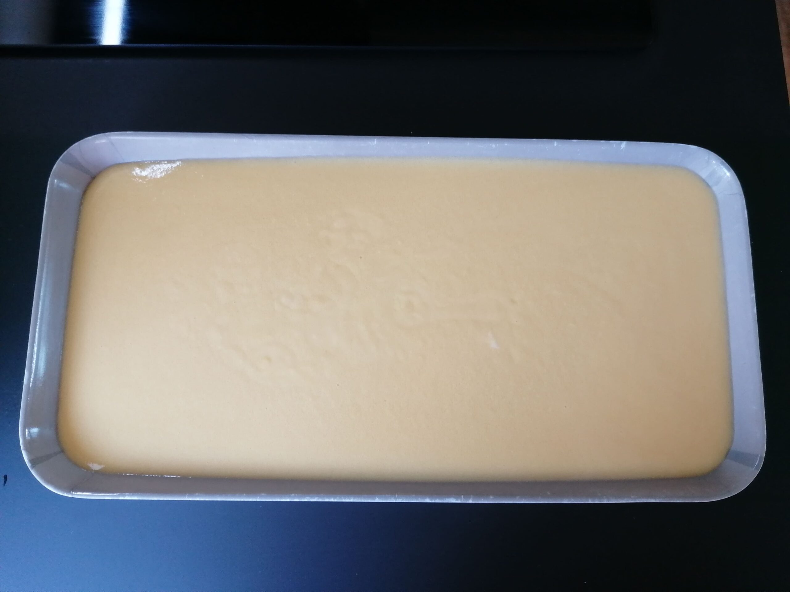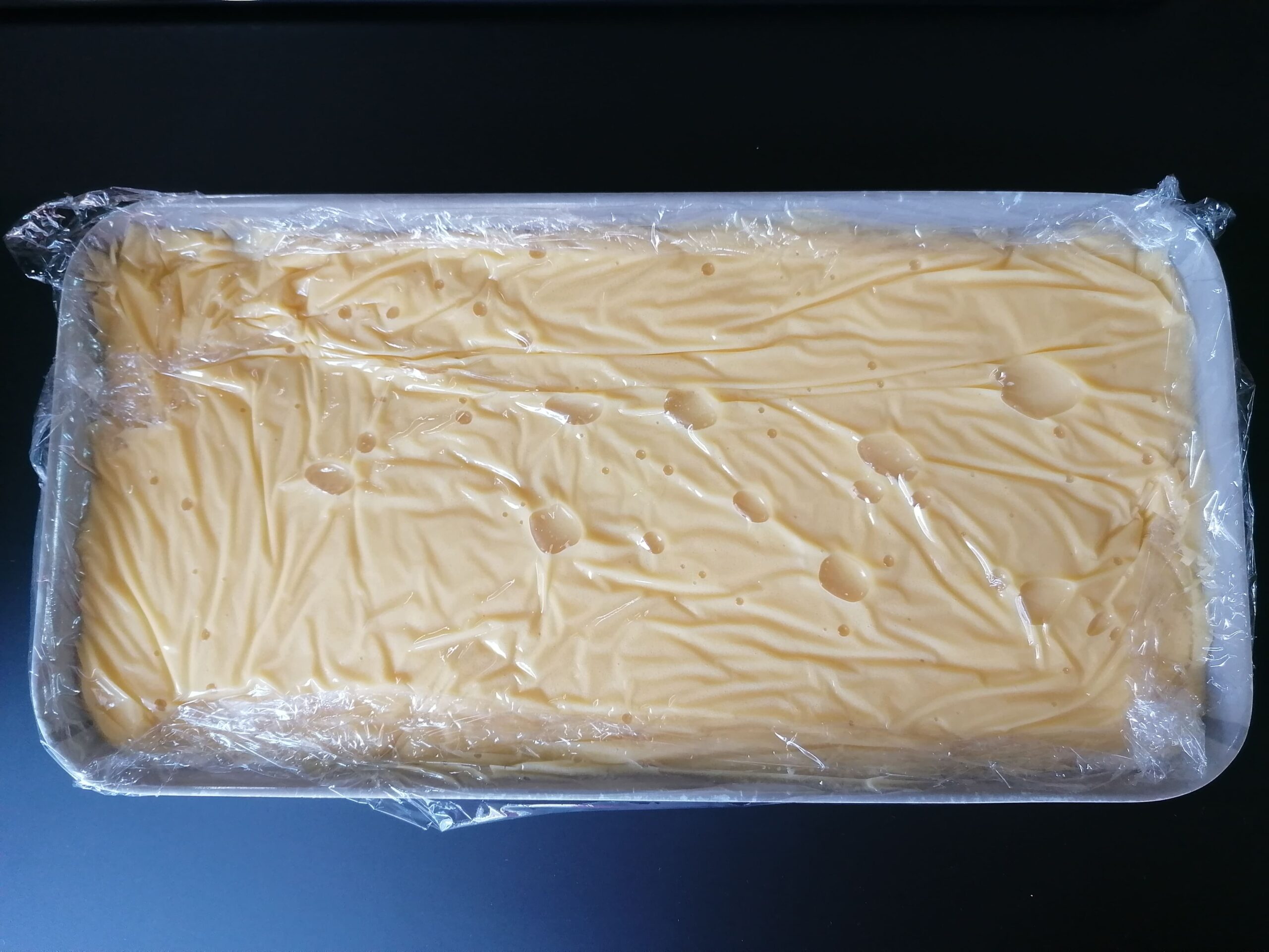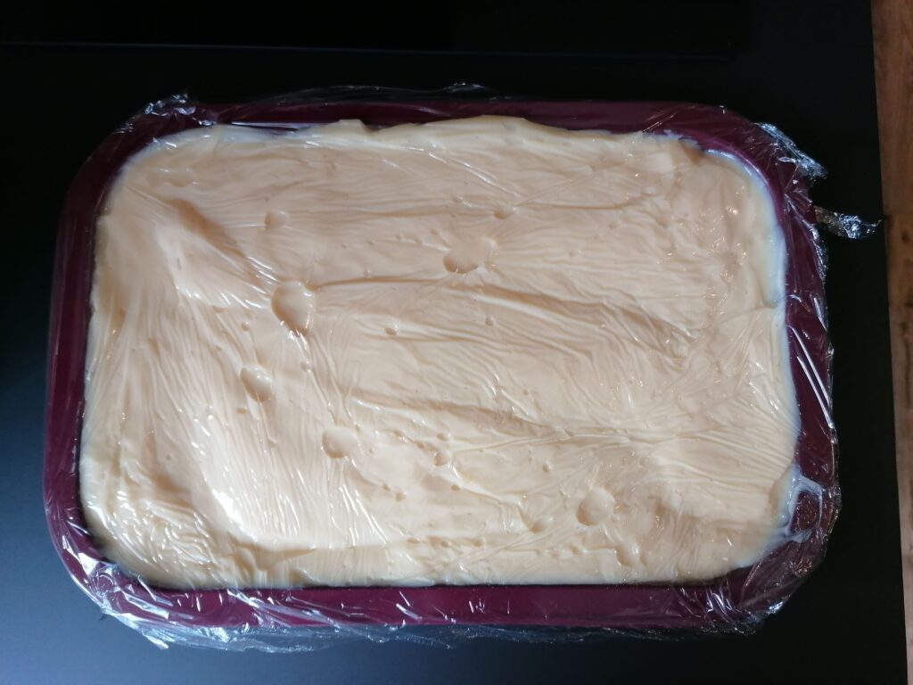 - Transvaser la crème ainsi terminée, est très souple, dans un récipient plat et à rebord, l’étaler correctement à la maryse avant de la filmer au contact et de la mettre au froid pour une prise et un refroidissement rapide et complet jusqu’au jour du montage de l’entremet et donc de la confection de la crème mascarpone vanille façon crème anglaise.