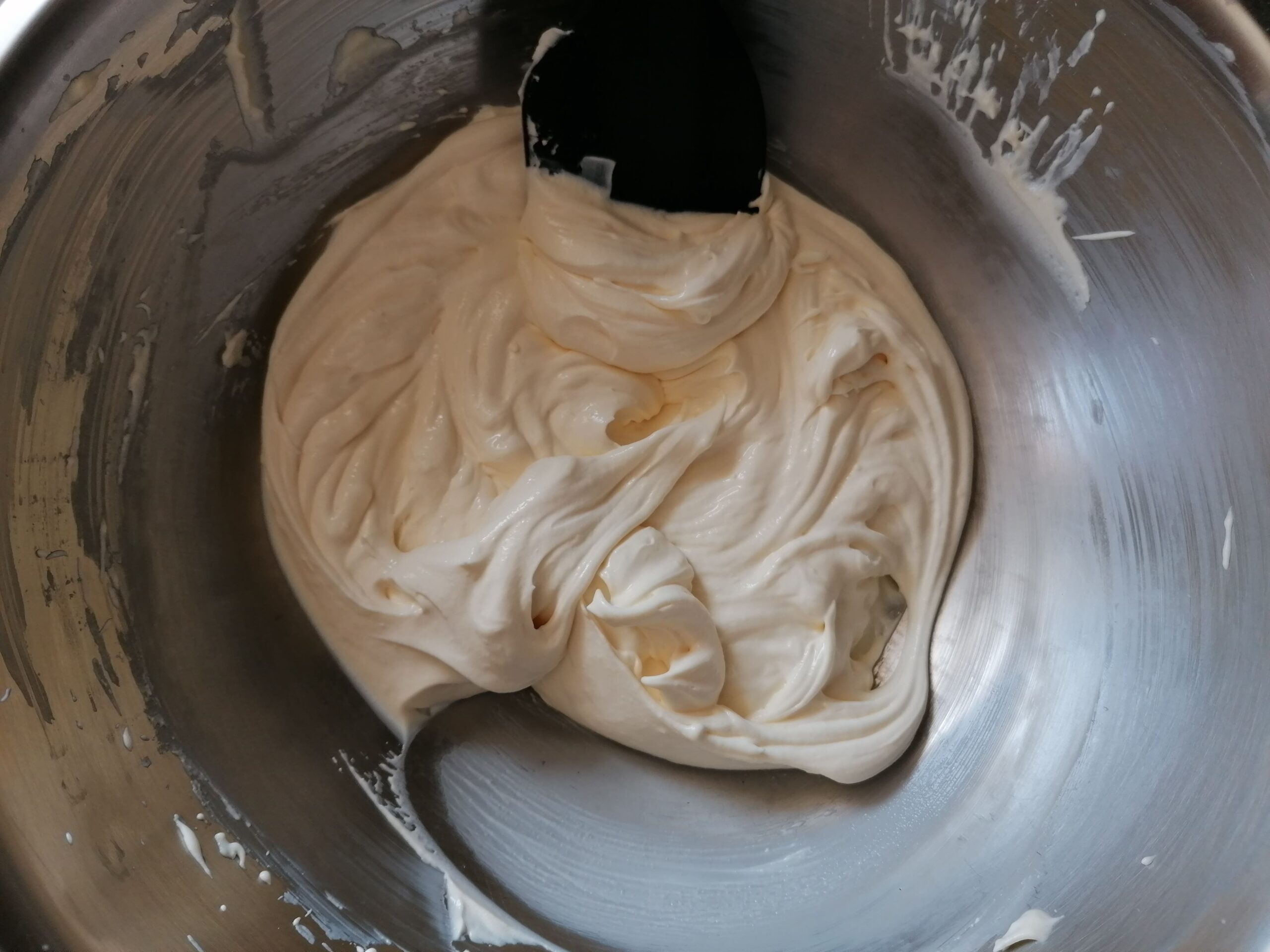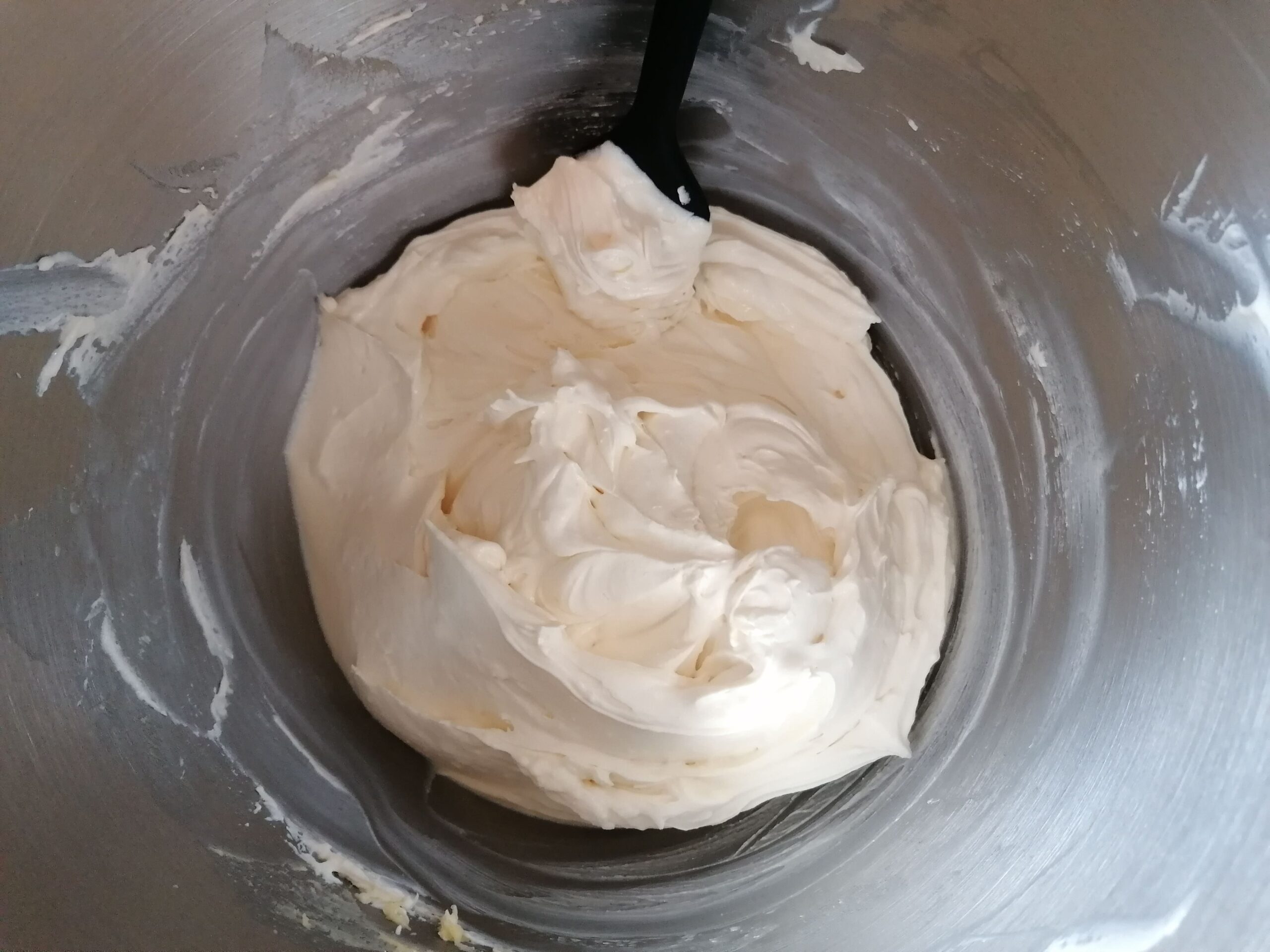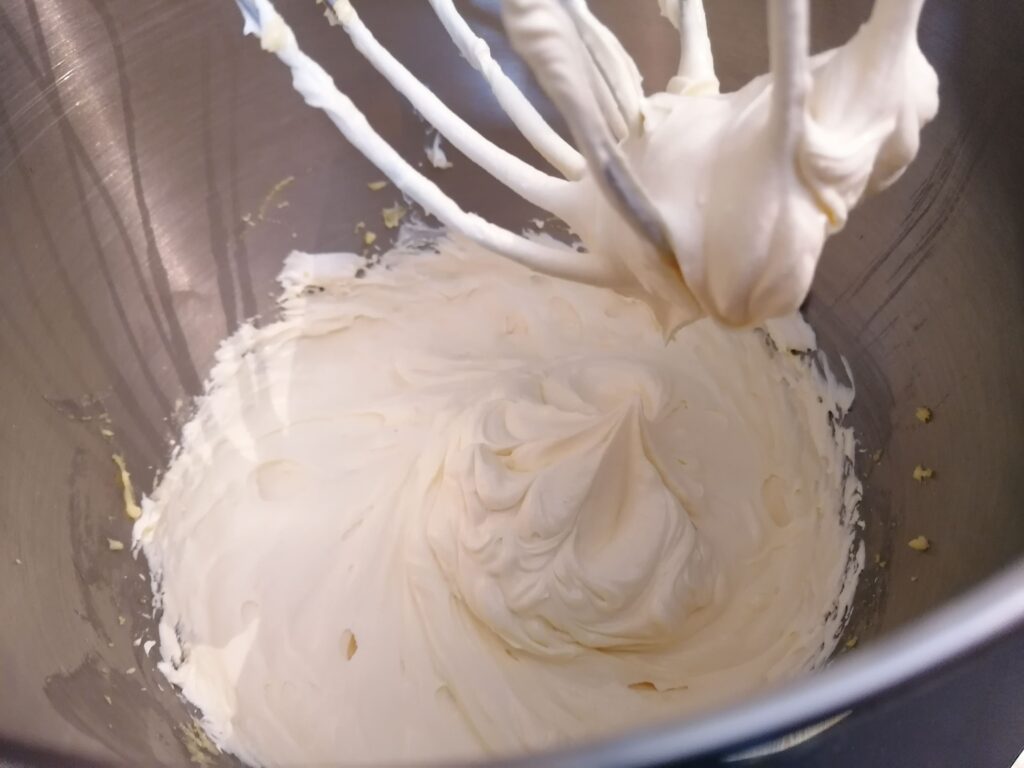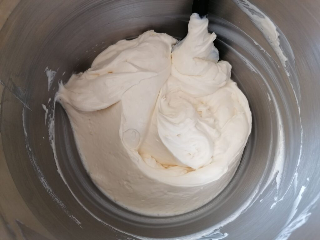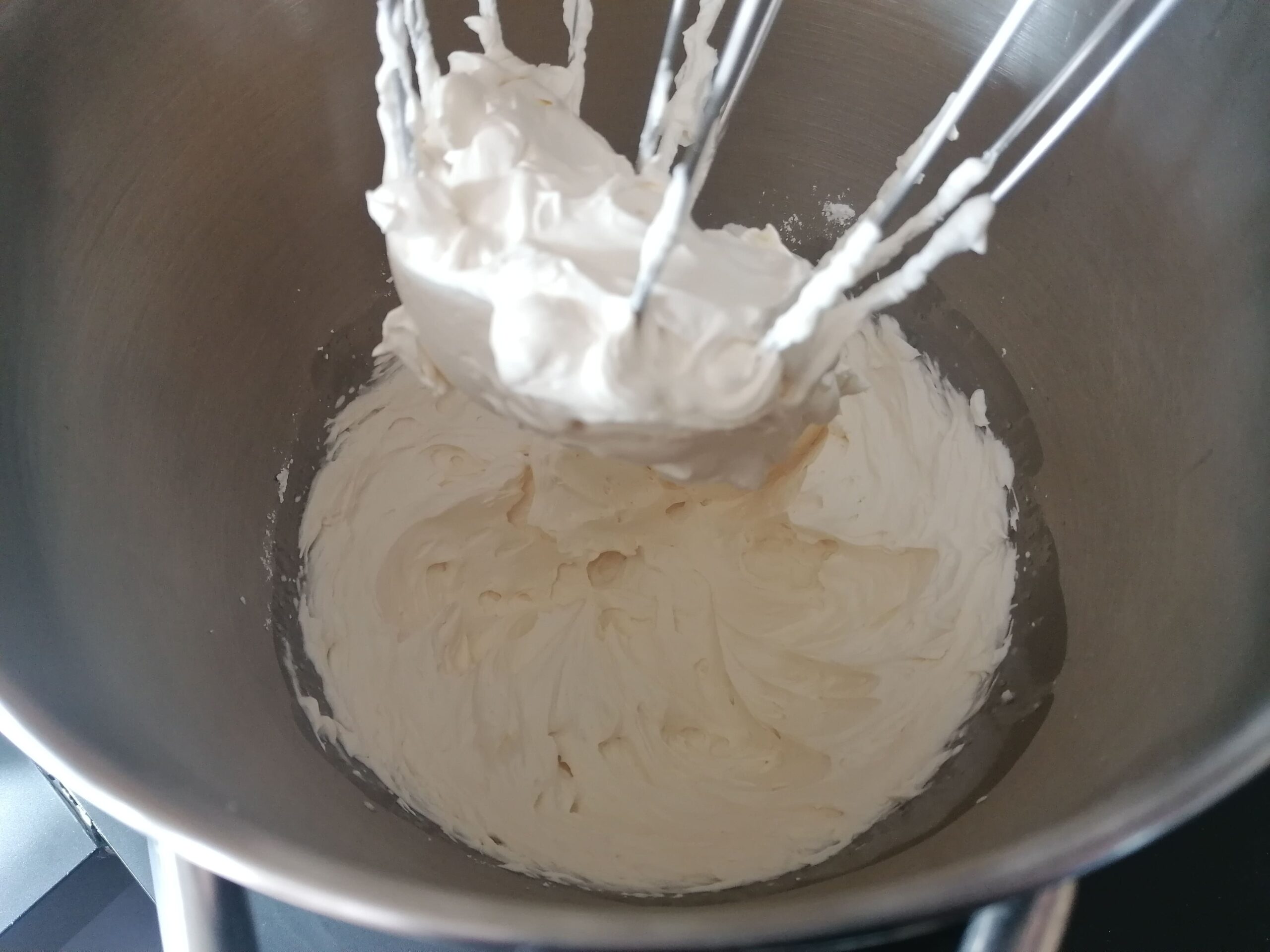 - Récupérer le restant de crème mascarpone vanille laissée au froid puis, au robot et au fouet, la foisonner de nouveau afin de lui faire retrouver sa texture aérienne après être restée au froid, en la battant environ 5 min à vitesse moyenne jusqu’à obtention d’une crème fouettée de nouveau homogène, lisse, épaisse, bien ferme et onctueuse, mais sans trop foisonner de peur qu’elle ne tranche et ne devienne granuleuse.