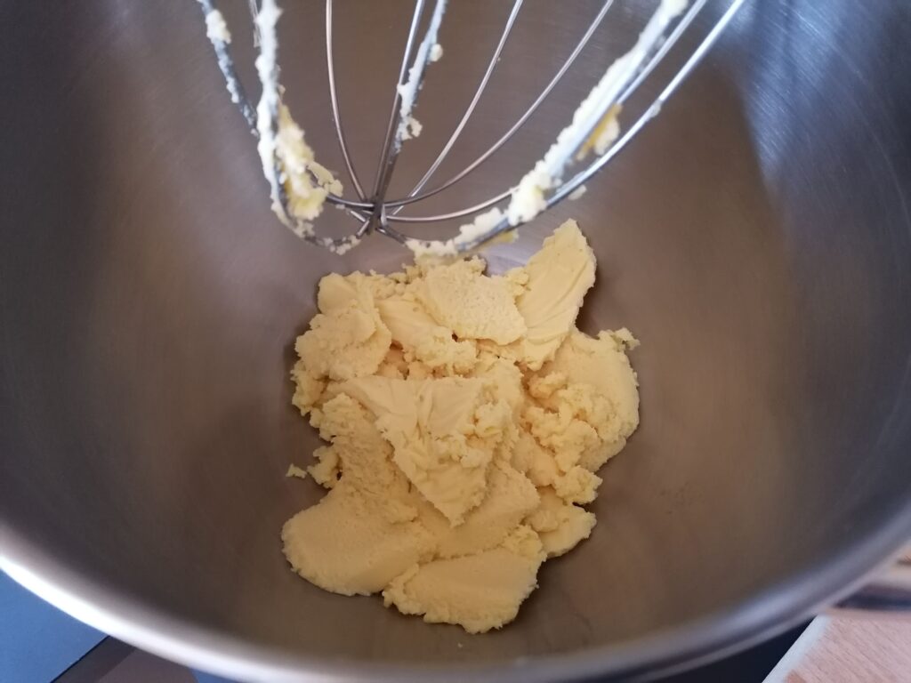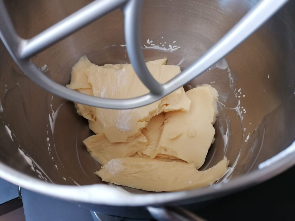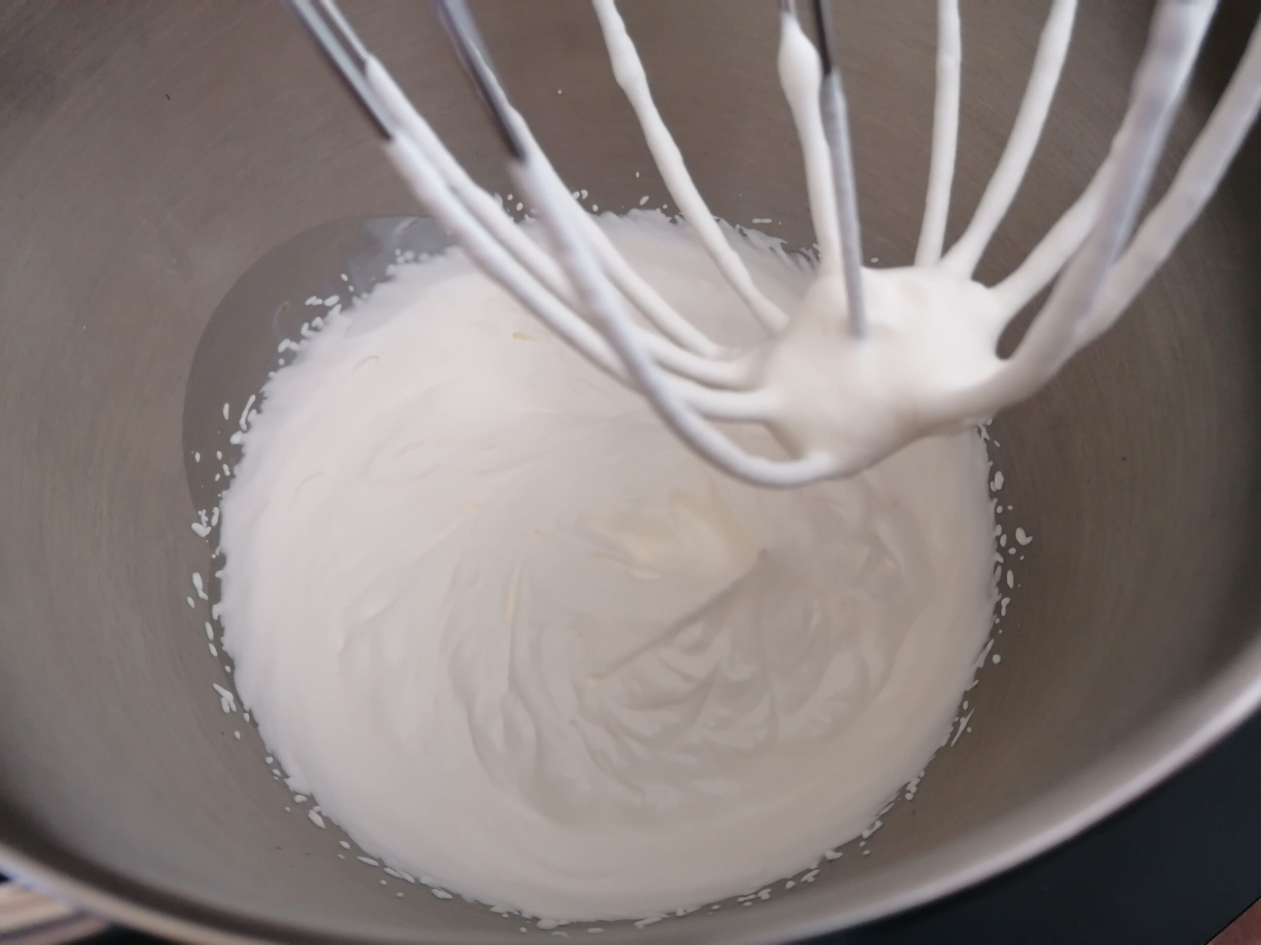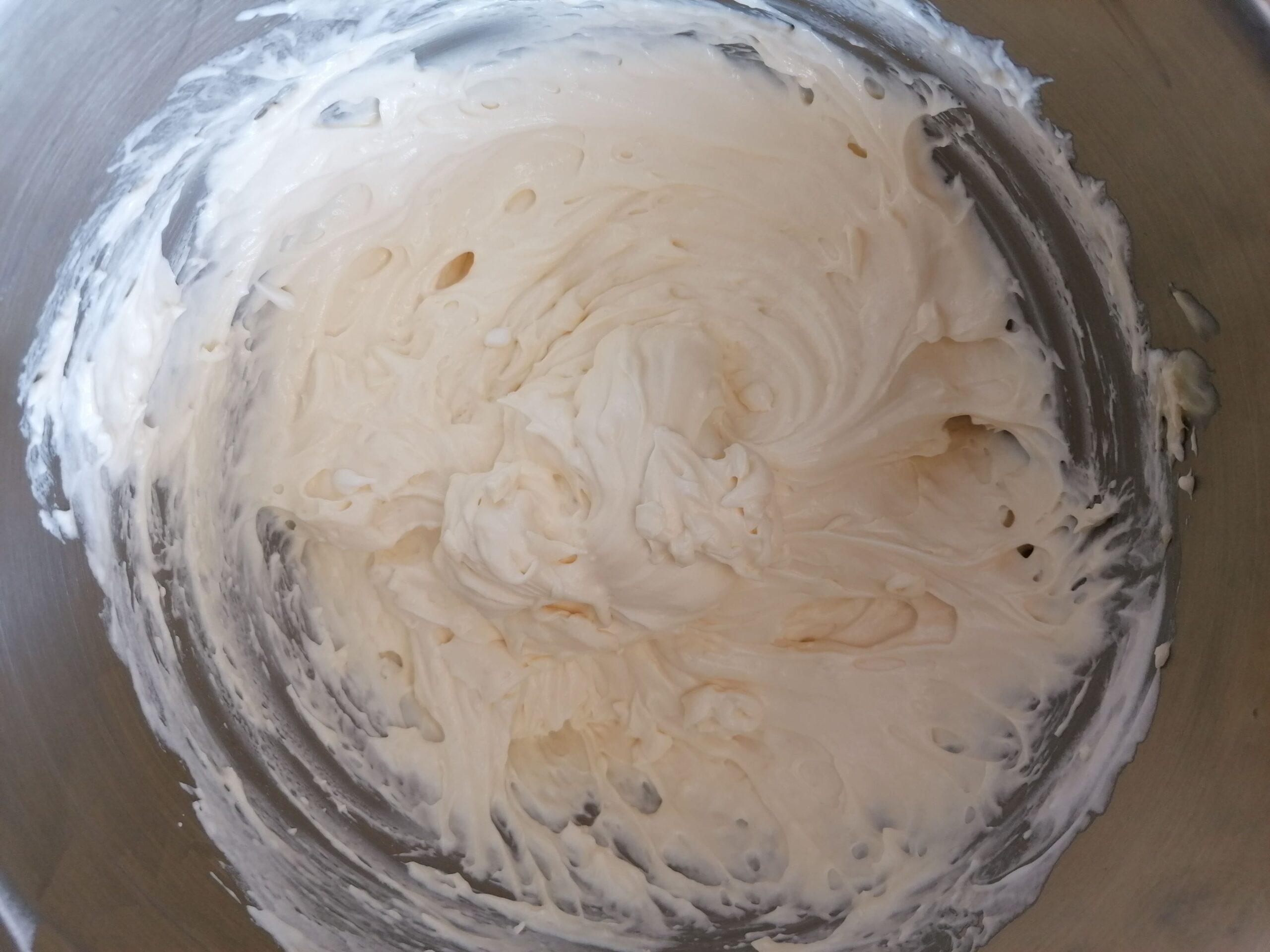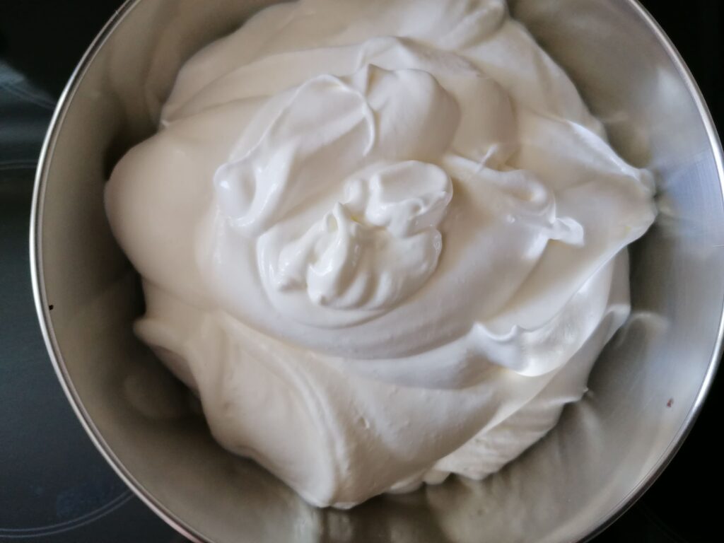 - Récupérer le restant de crème mascarpone vanille laissée au froid puis, au robot et au fouet, la foisonner de nouveau afin de lui faire retrouver sa texture aérienne après être restée au froid, en la battant environ 5 min à vitesse moyenne jusqu’à obtention d’une crème fouettée de nouveau homogène, lisse, épaisse, bien ferme et onctueuse, mais sans trop foisonner de peur qu’elle ne tranche et ne devienne granuleuse.