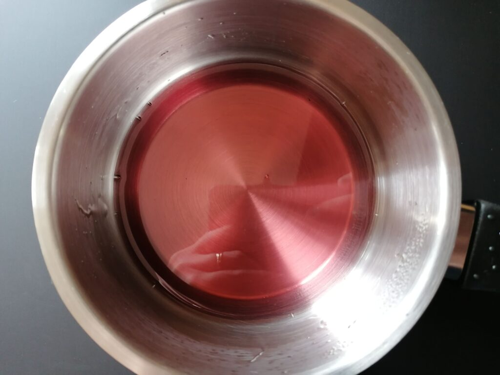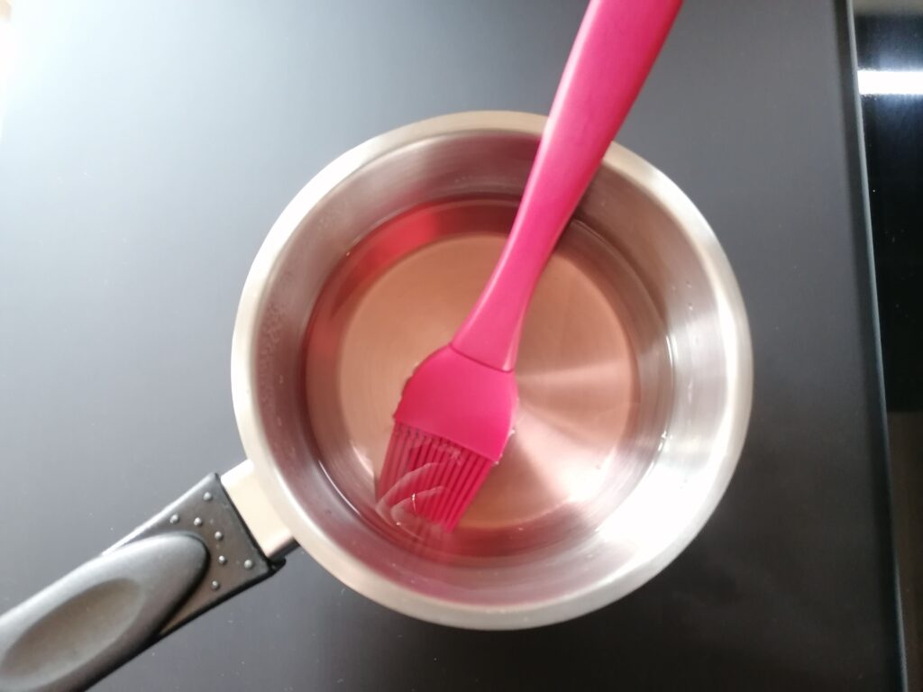 - Hors du feu, à chaud ou après avoir laissé refroidir le sirop, ajouter le sirop de cassis de manière à ce que le goût de cassis y soit prononcé sans toutefois le surdoser puis mélanger avec un pinceau afin d’homogénéiser le tout.