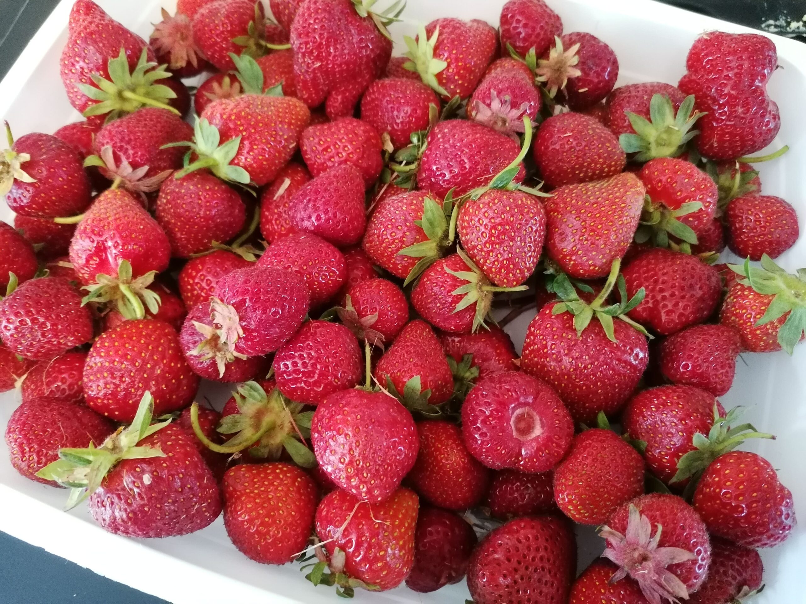 - Récupérer le sirop d’imbibage cassis réservé à température ambiante ou, si réalisé la veille, au froid, mais aussi l’ensemble du kilo de fraises fraîches.