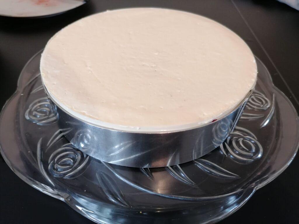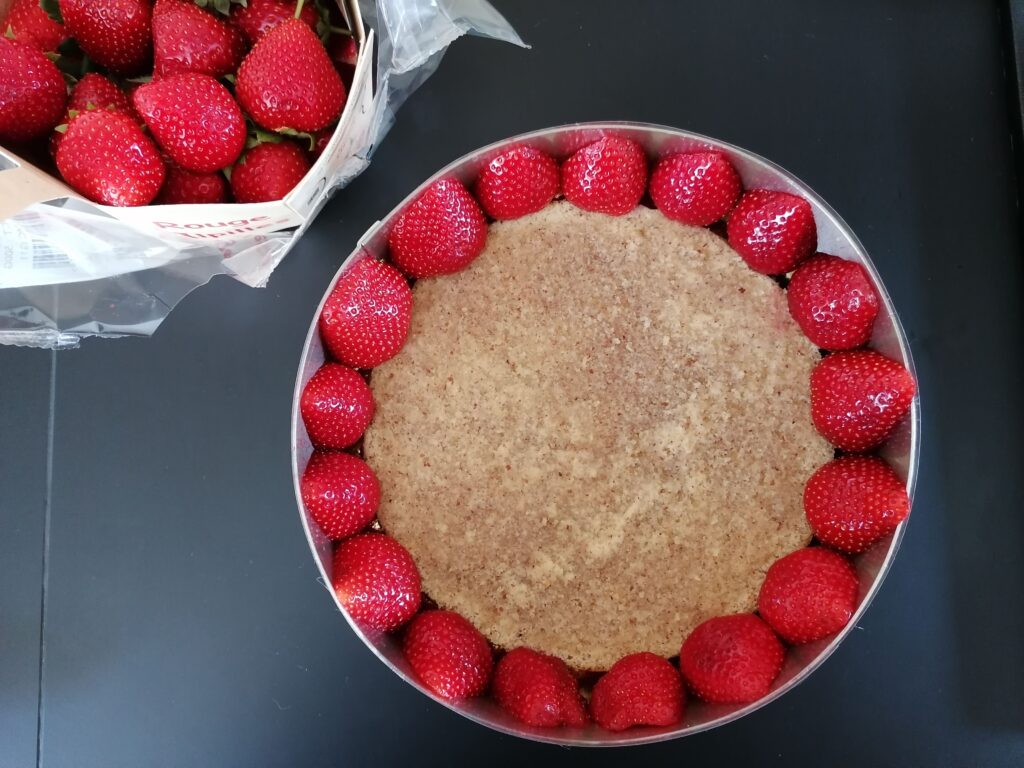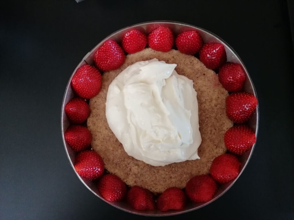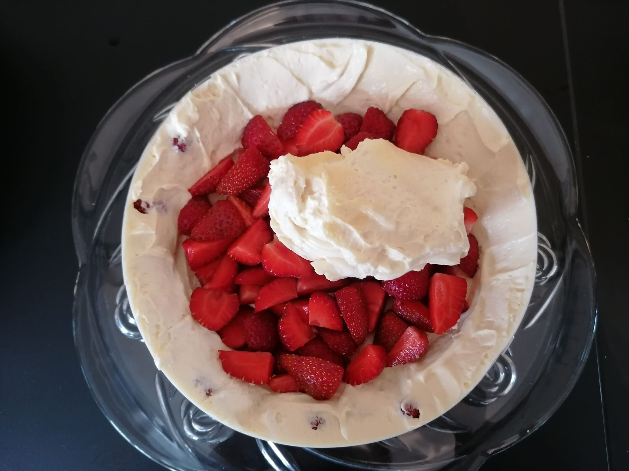 - Au final, la couche de crème doit être généreuse mais sans être trop épaisse, ceci afin de garder de la place pour l’insert composé de morceaux de fraises, mais aussi pour la fine couche de crème, le second biscuit et, enfin, la deuxième et dernière couche de crème qui doit arriver à hauteur du cercle.