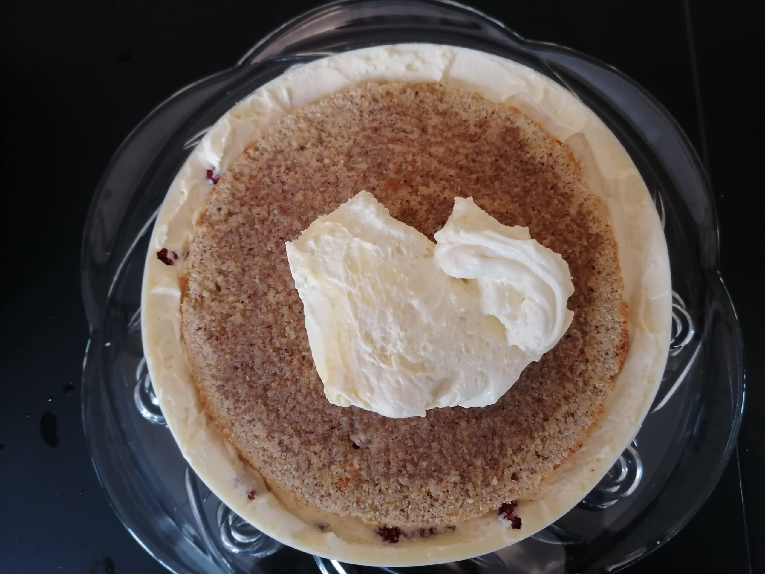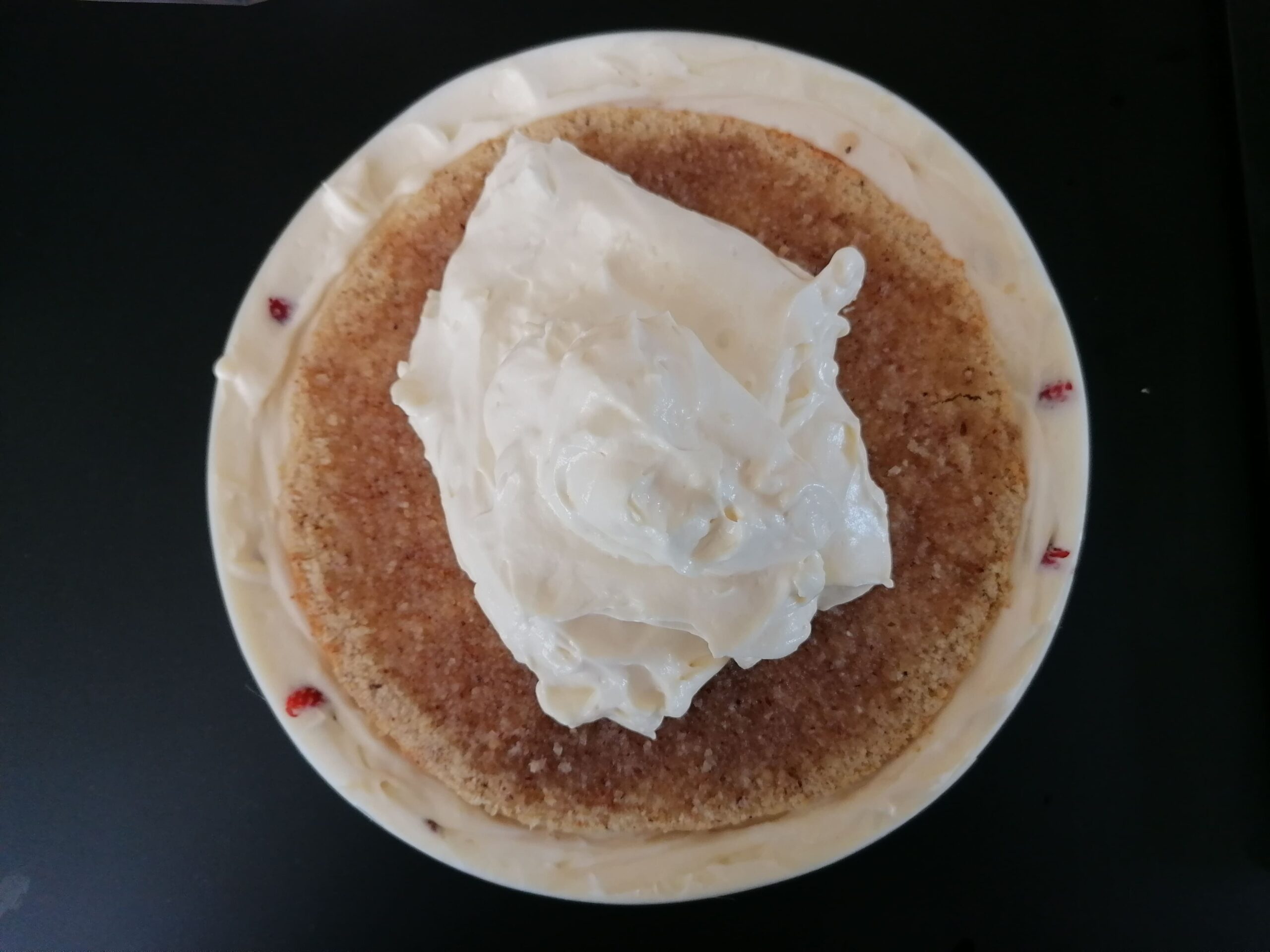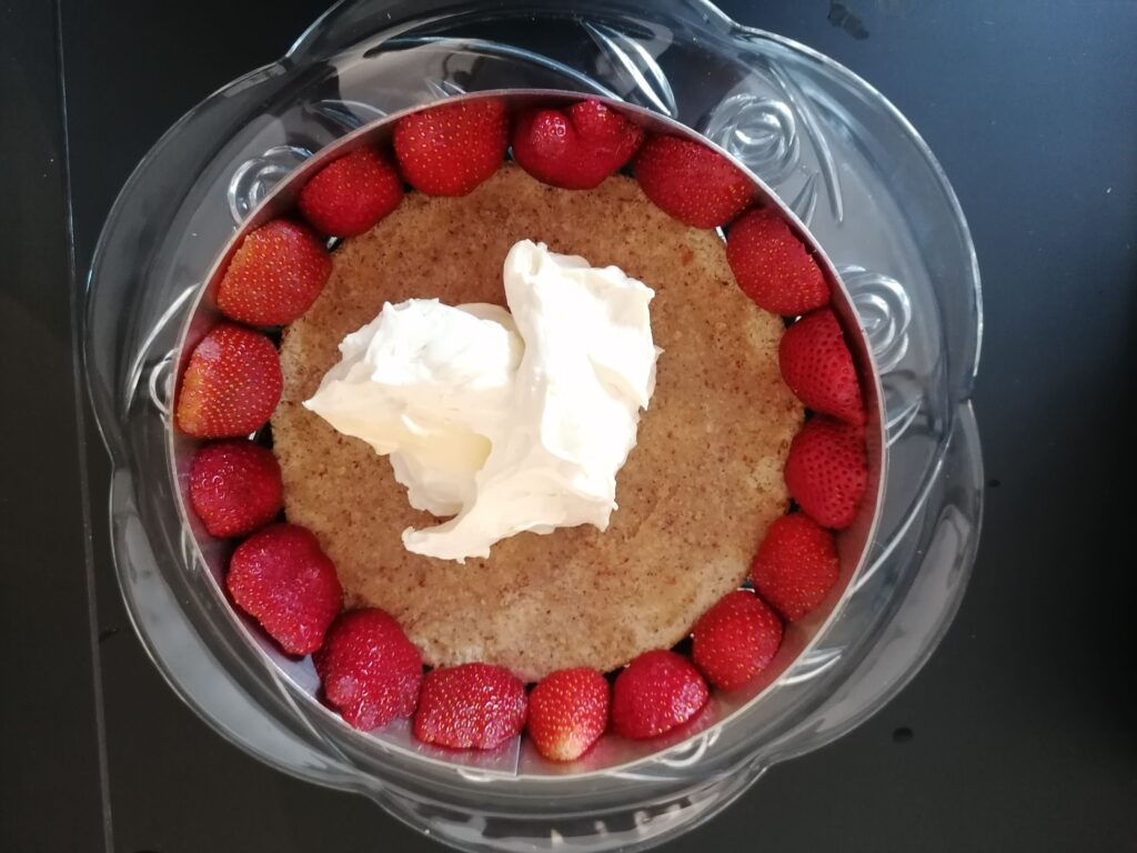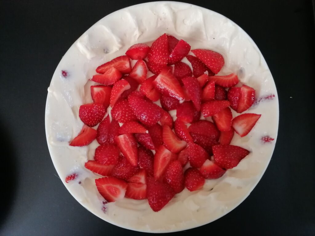 - Au final, la couche de crème doit être généreuse mais sans être trop épaisse, ceci afin de garder de la place pour l’insert composé de morceaux de fraises, mais aussi pour la fine couche de crème, le second biscuit et, enfin, la deuxième et dernière couche de crème qui doit arriver à hauteur du cercle.