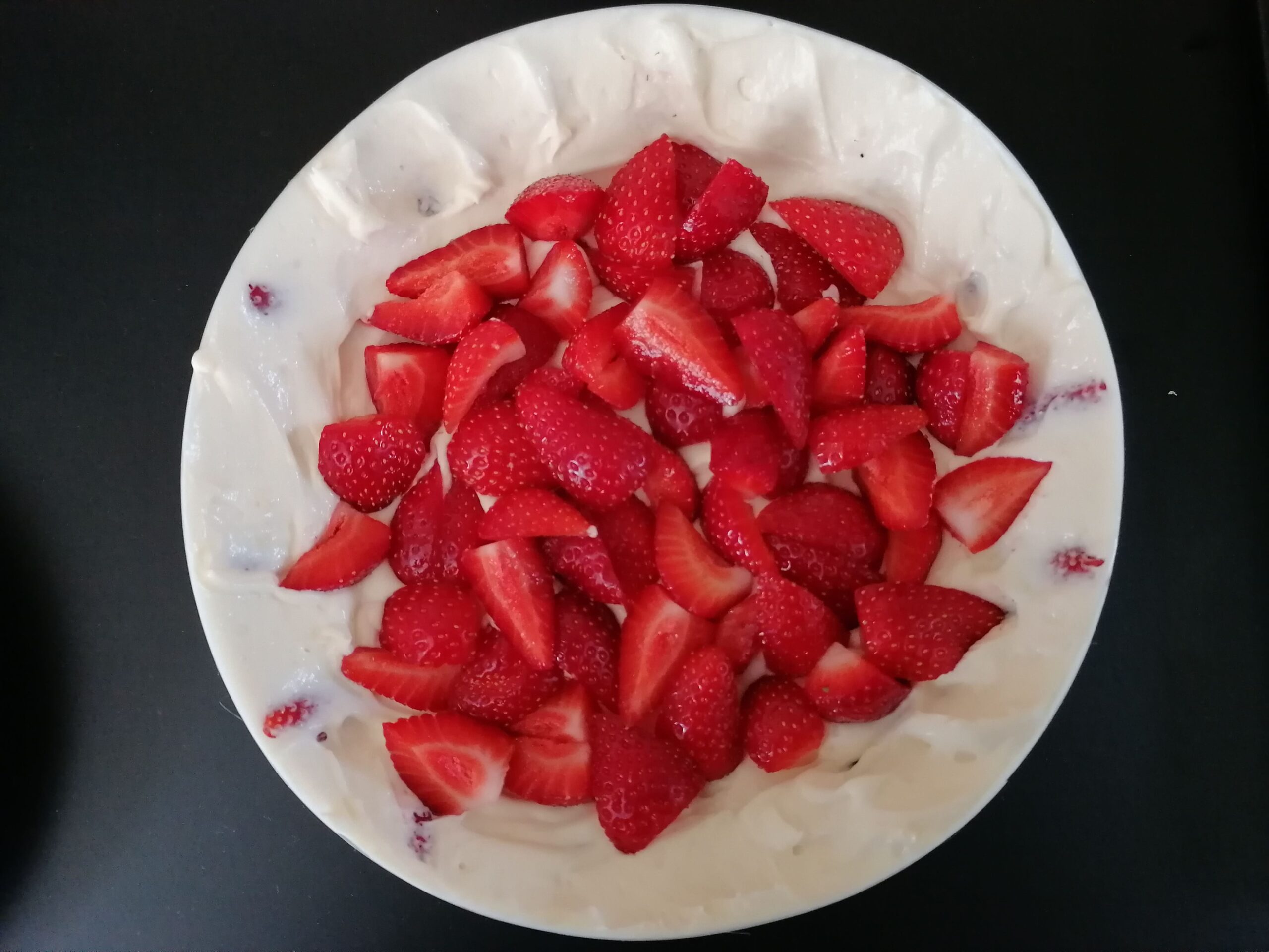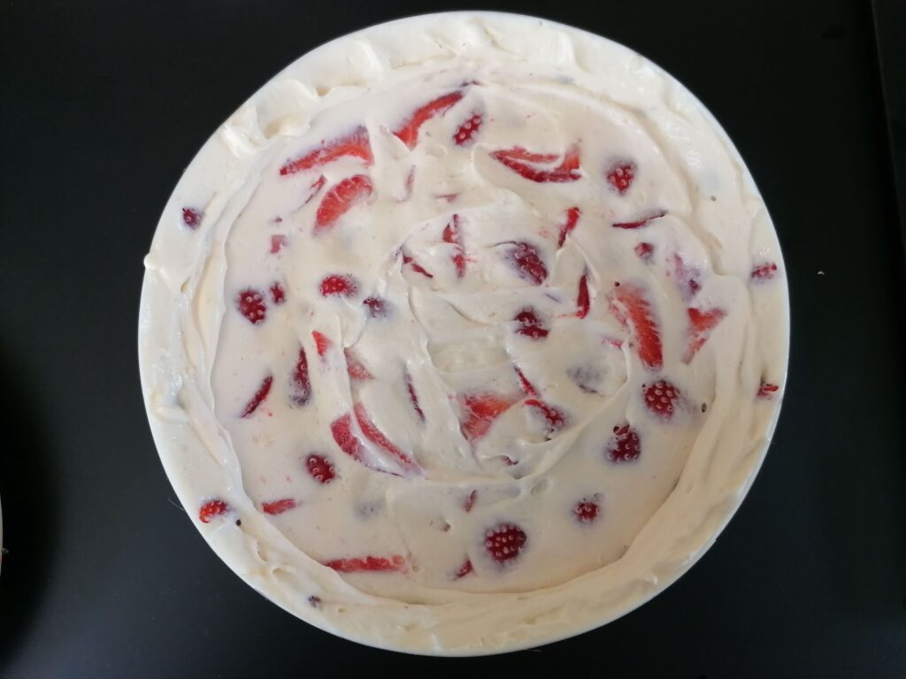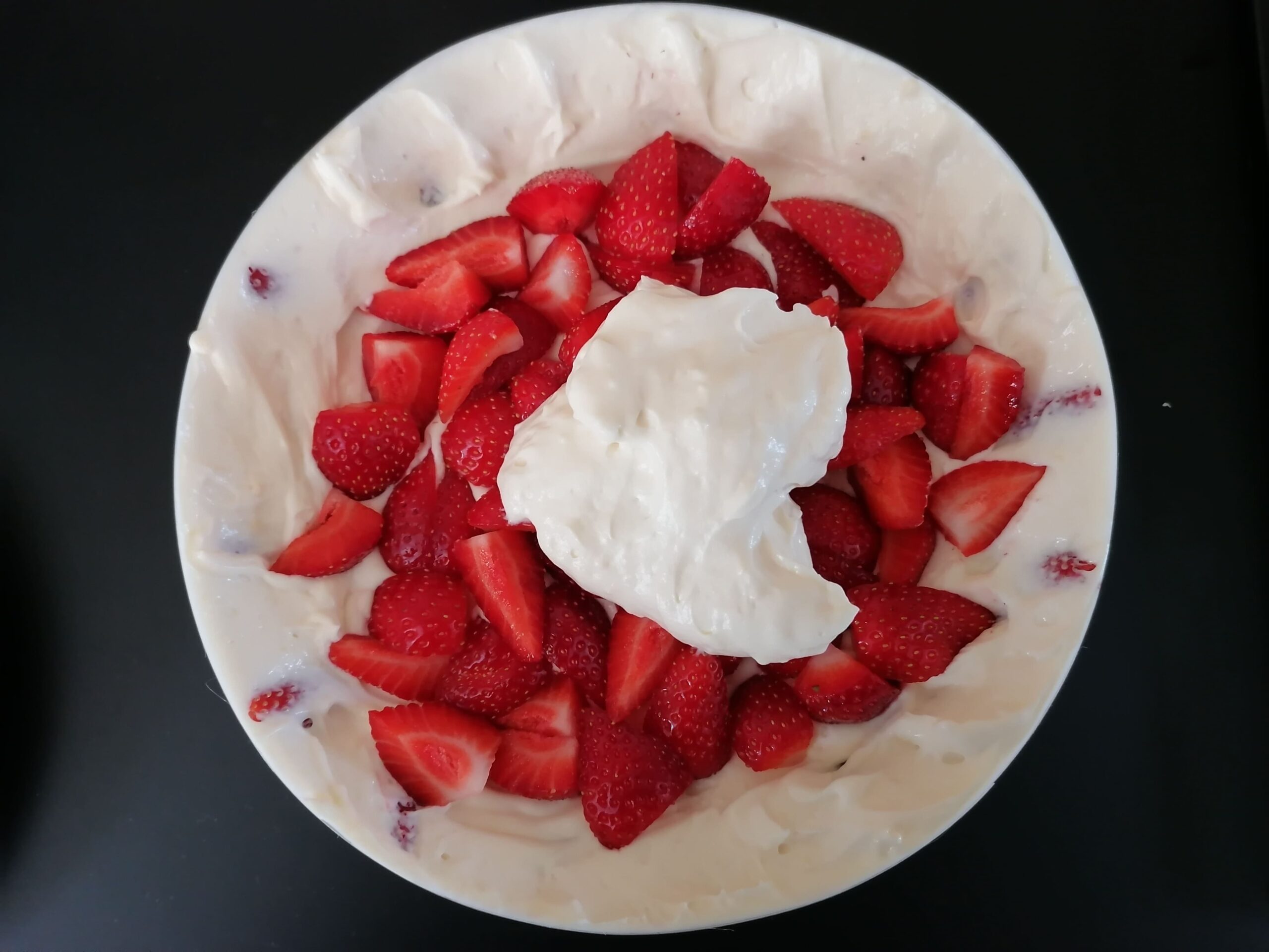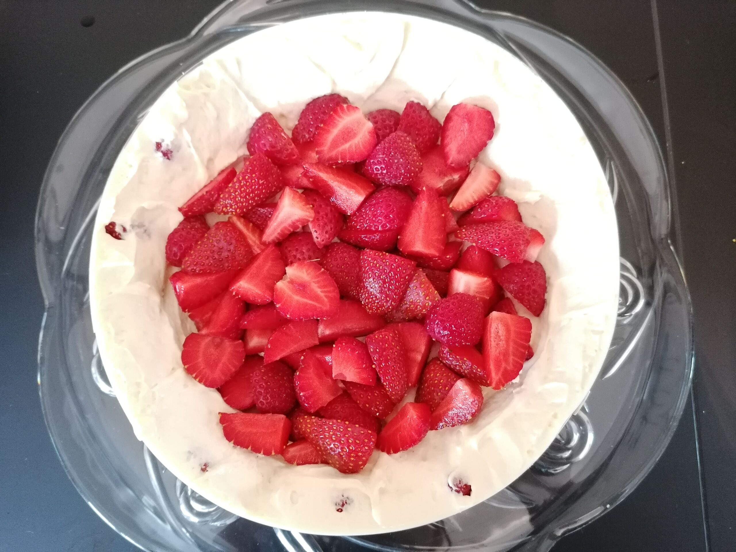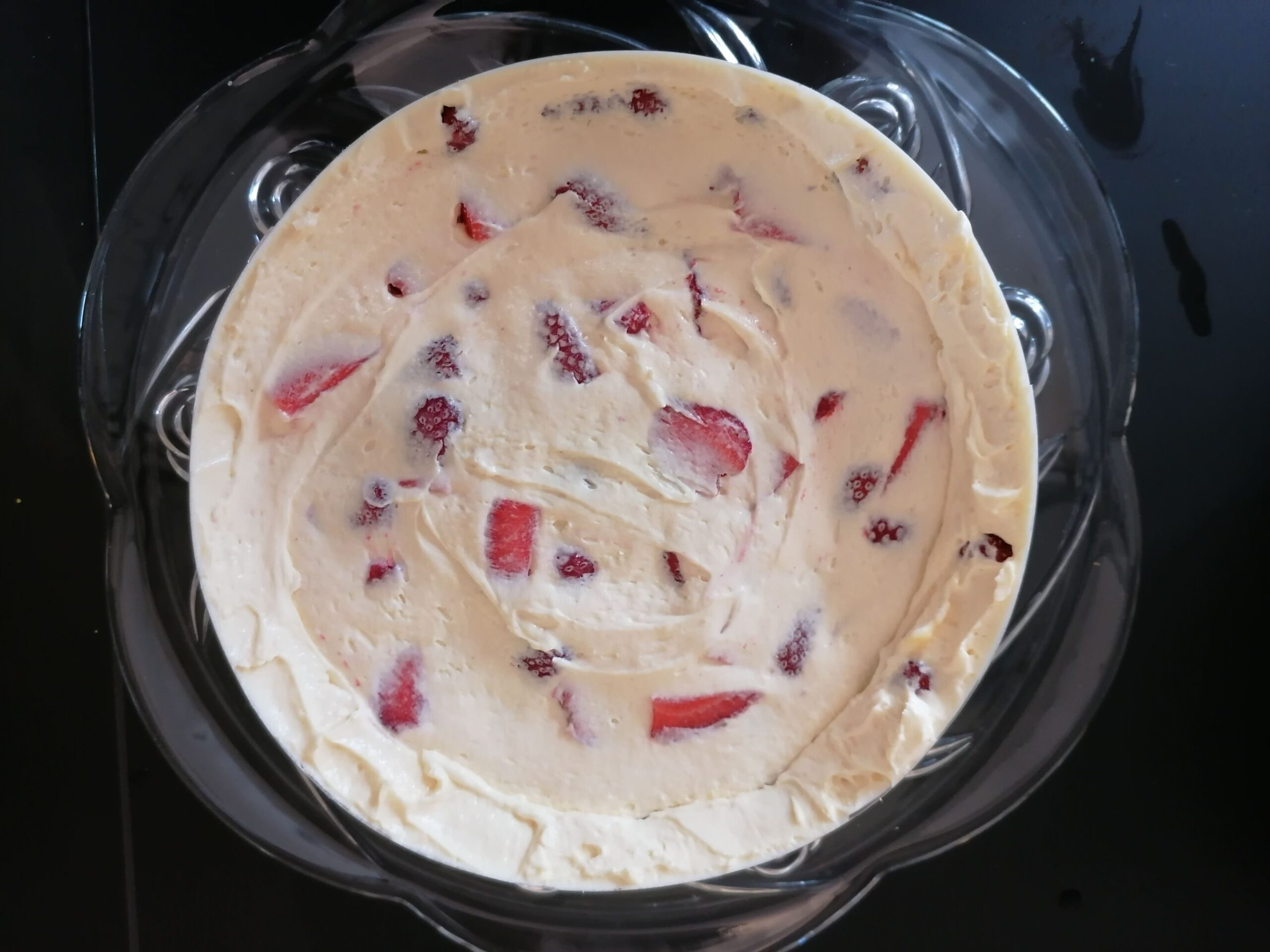 - Couvrir le tout d’un peu de crème mascarpone puis lisser de nouveau à la maryse en appuyant légèrement sur la crème, en procédant délicatement afin de ne pas écraser les morceaux de fraises, de libérer leur jus et de manière à obtenir une surface place, à correctement emprisonner les fruits dans la garniture et à retirer les vides d’air qui pourraient s’être logés entre les fraises et les différentes couches de crème.