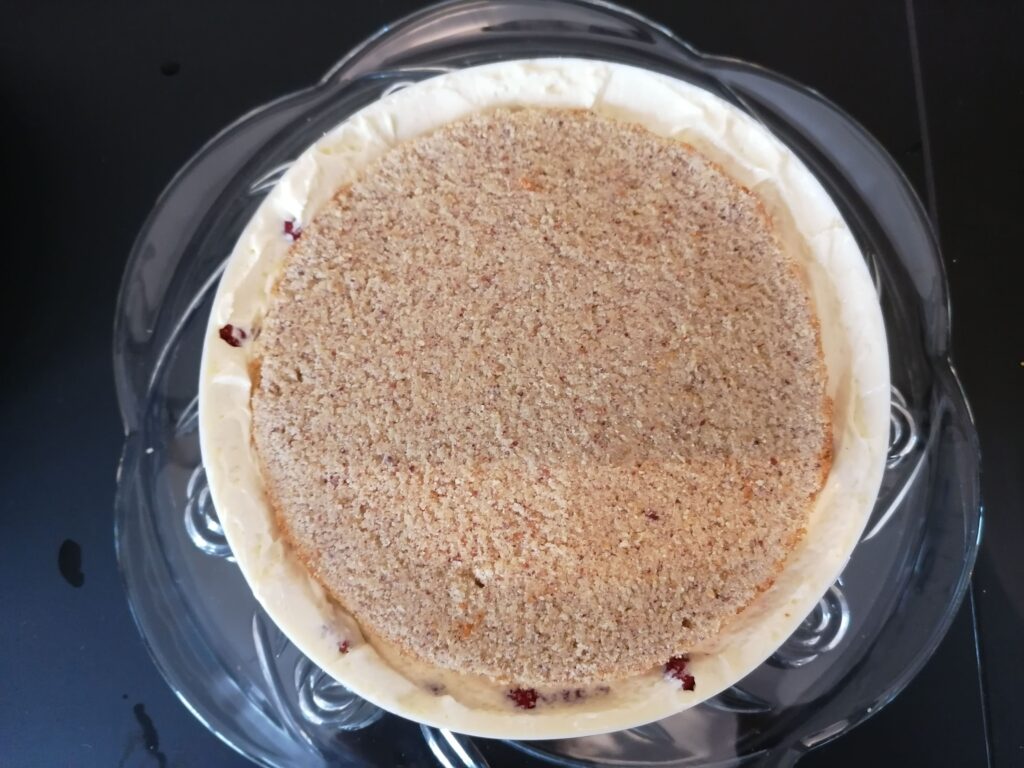 - Verser, pour la troisième et ultime fois, de la crème mascarpone sur le biscuit puis lisser, cette fois-ci, à la spatule coudée, cette dernière sur le biscuit de manière à arriver à hauteur du cercle sur l’ensemble de la surface de l’entremet, avec obtention, au final, d’une surface totalement plate et droite.