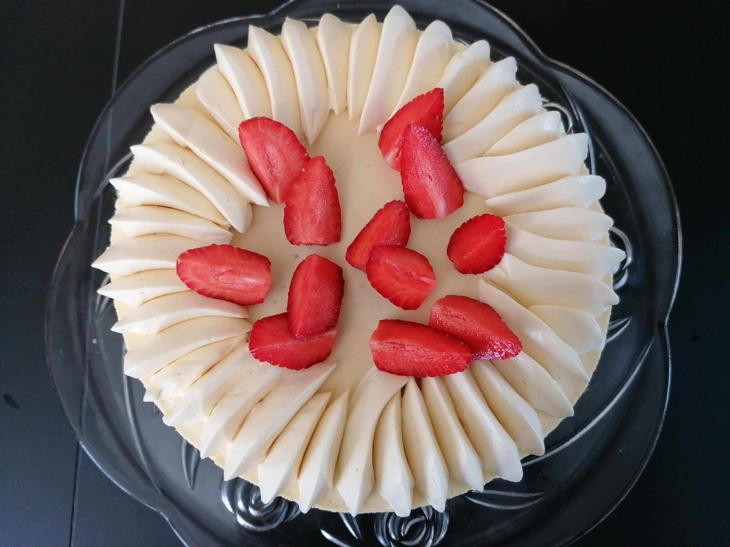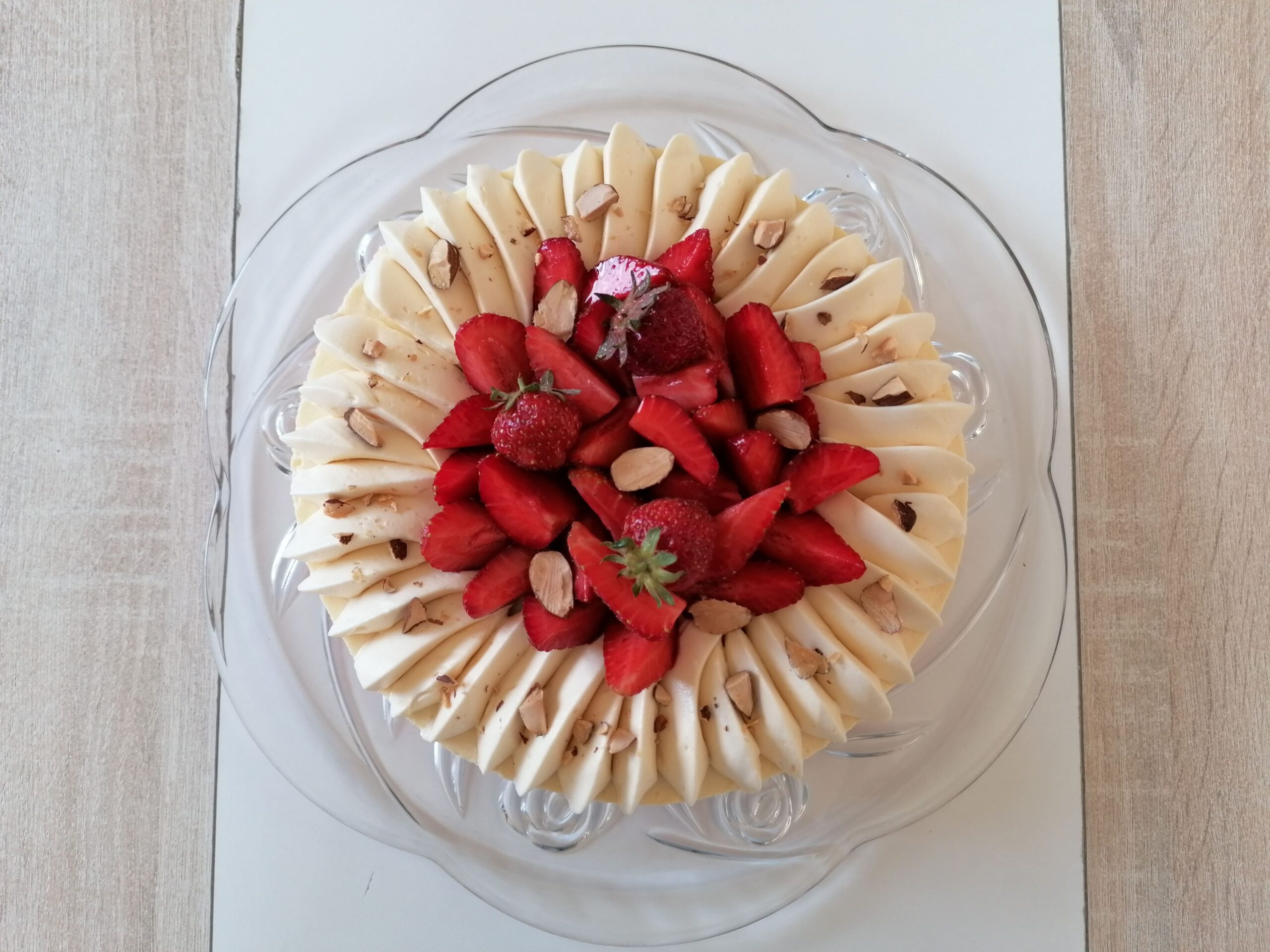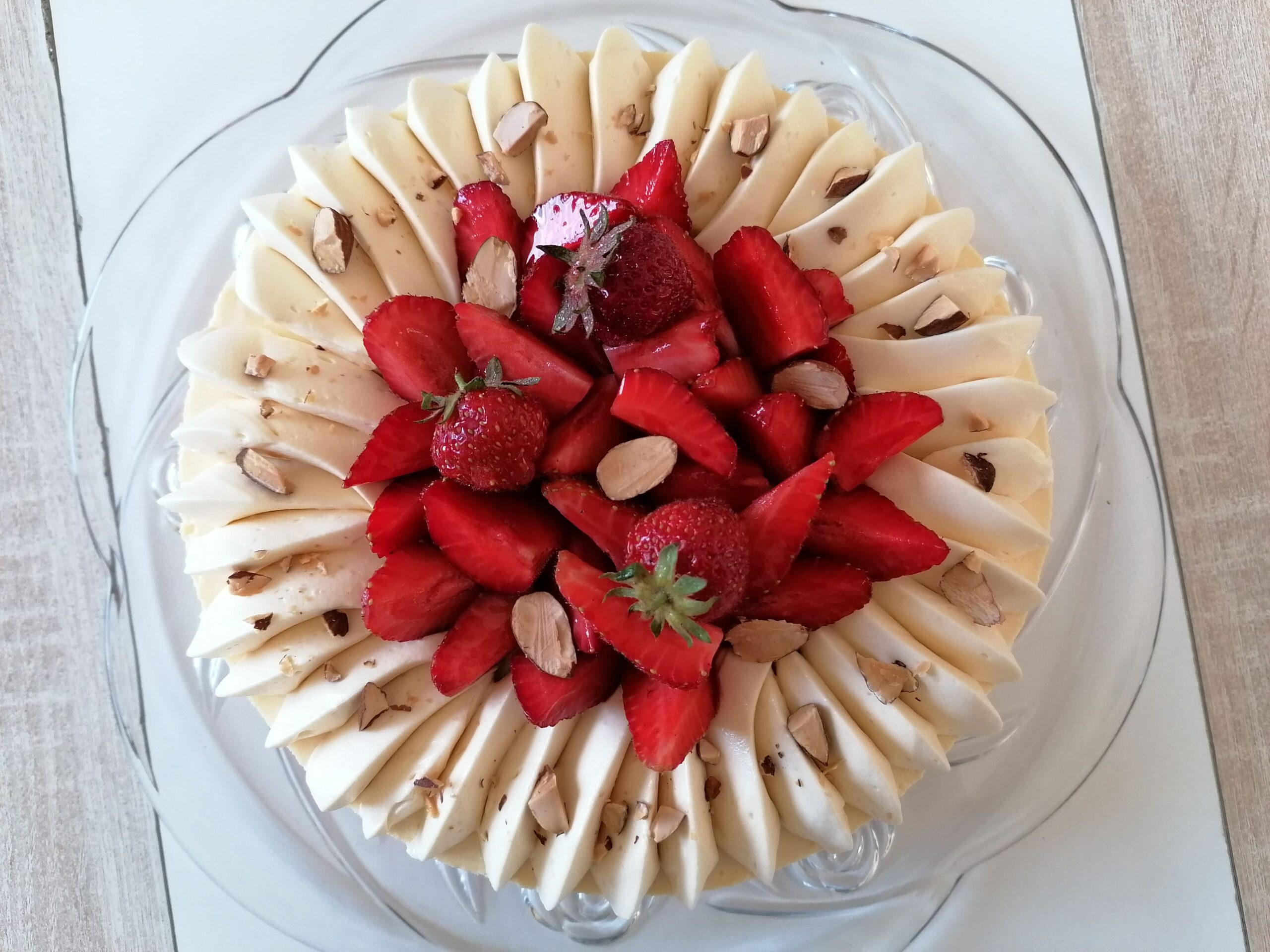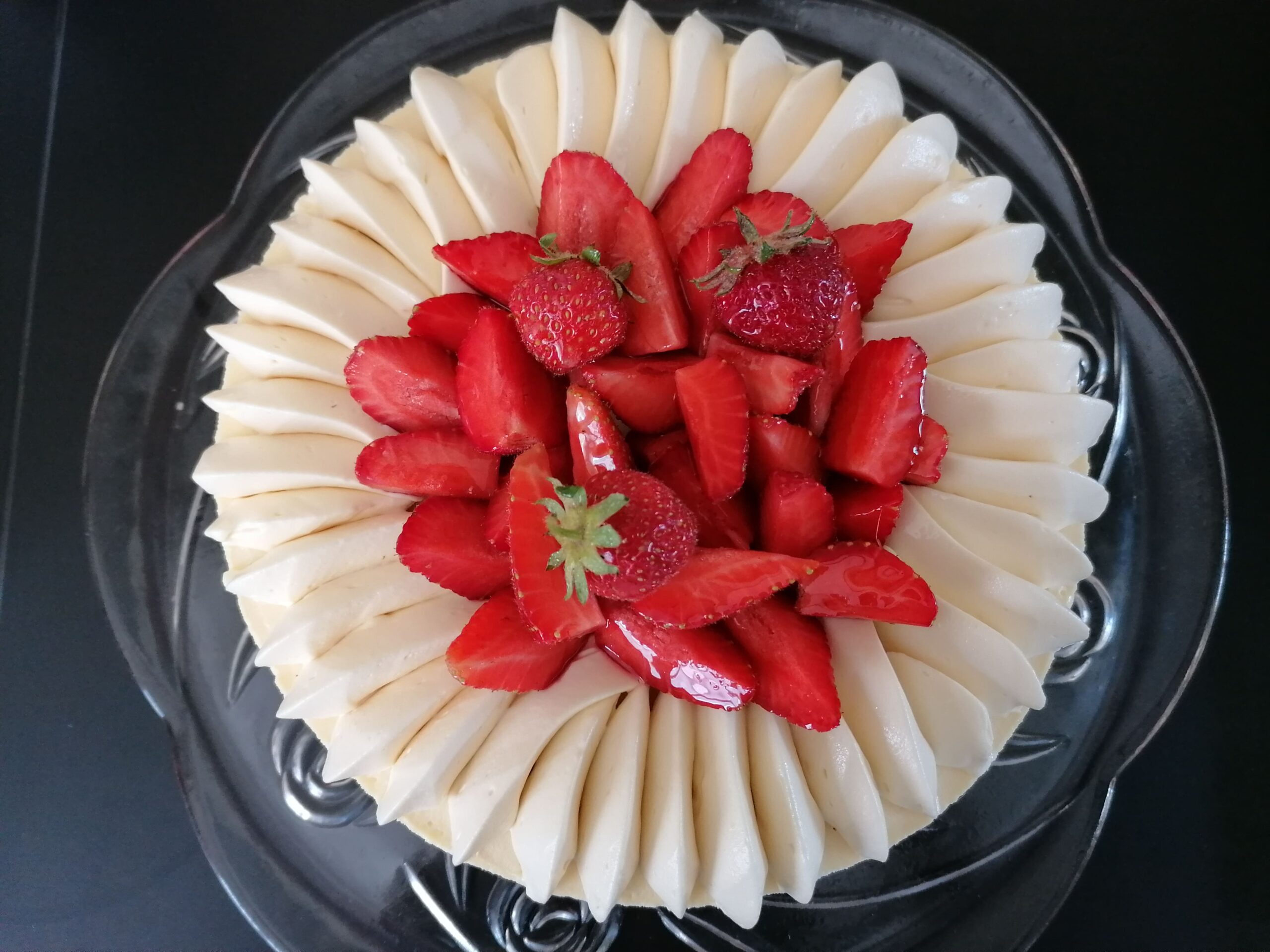 - les fruits doivent légèrement recouvrir l’extrémité de chacune des vagues de crème mascarpone, sans toutefois aller trop loin sur ces dernières et en restant régulier de manière à former un cercler de demi-fraises bien ronds ;