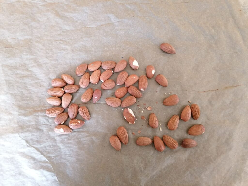 - Torréfier quelques amandes brutes entières, préalablement étalées sur une plaque recouverte d’une feuille de papier cuisson, à 150°C durant 15 min, dans un four préchauffé à 150°C, puis les défourner et les réserver à température ambiante pour tiédissement.
