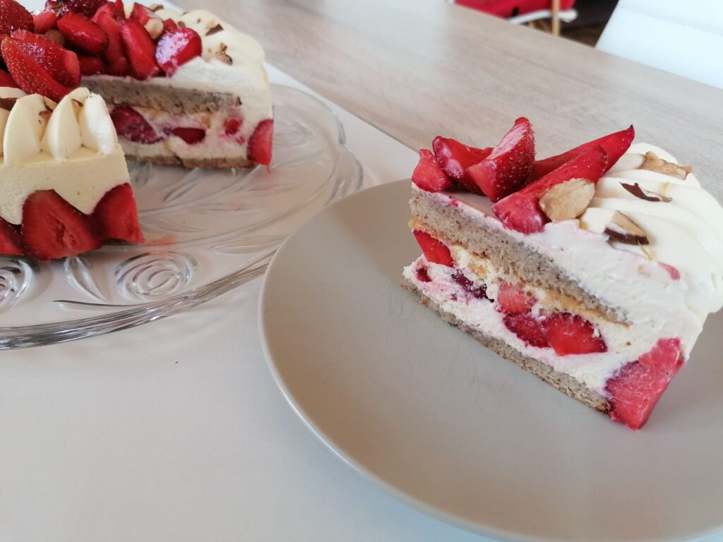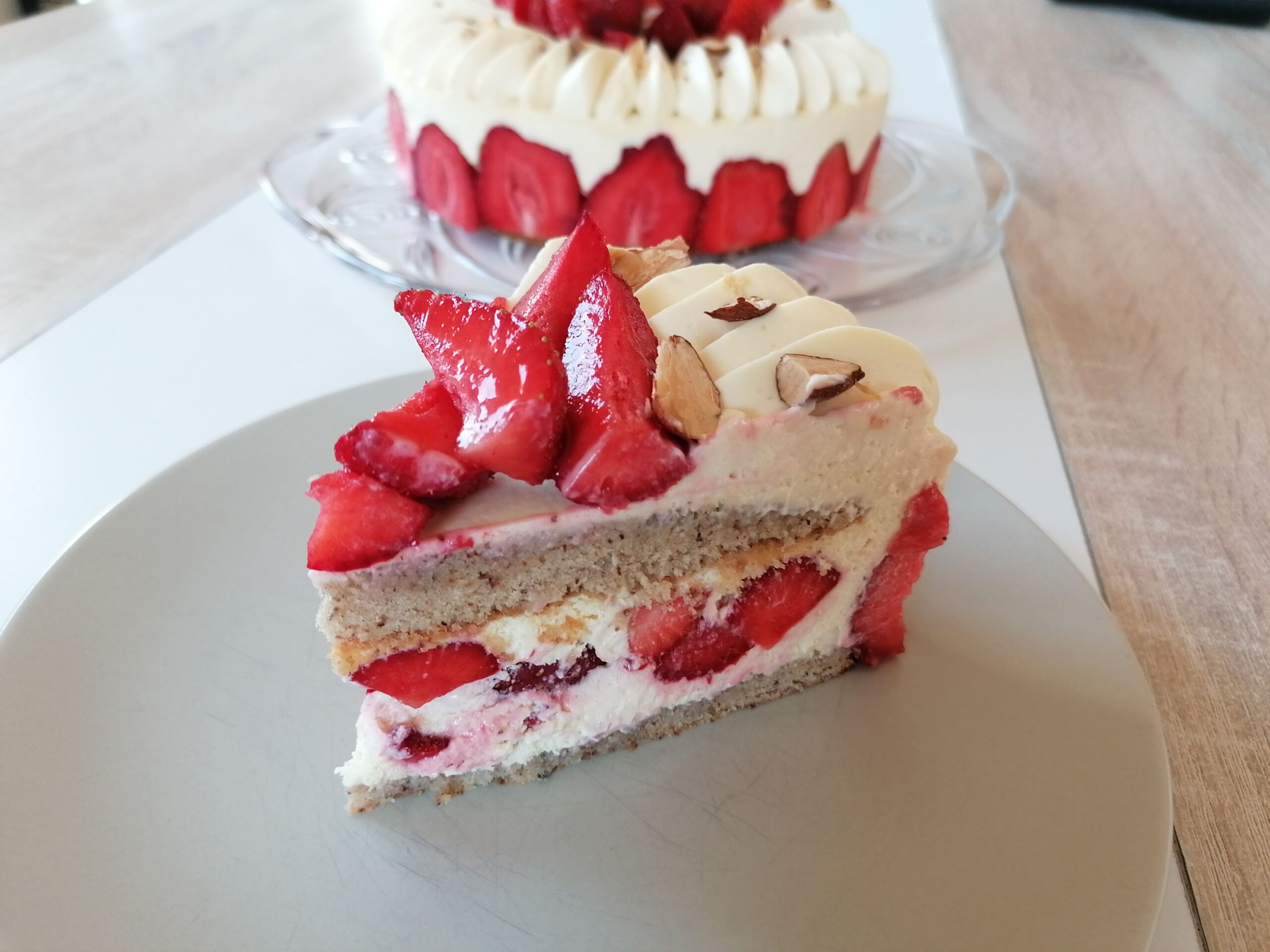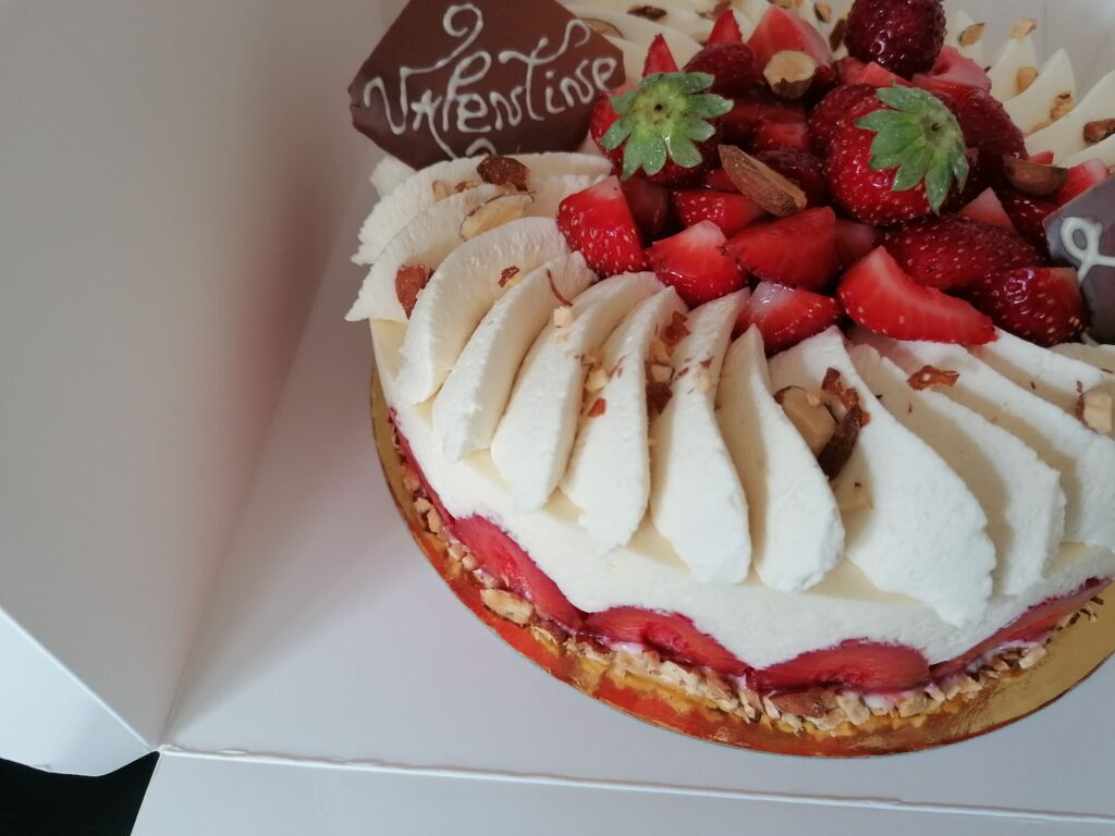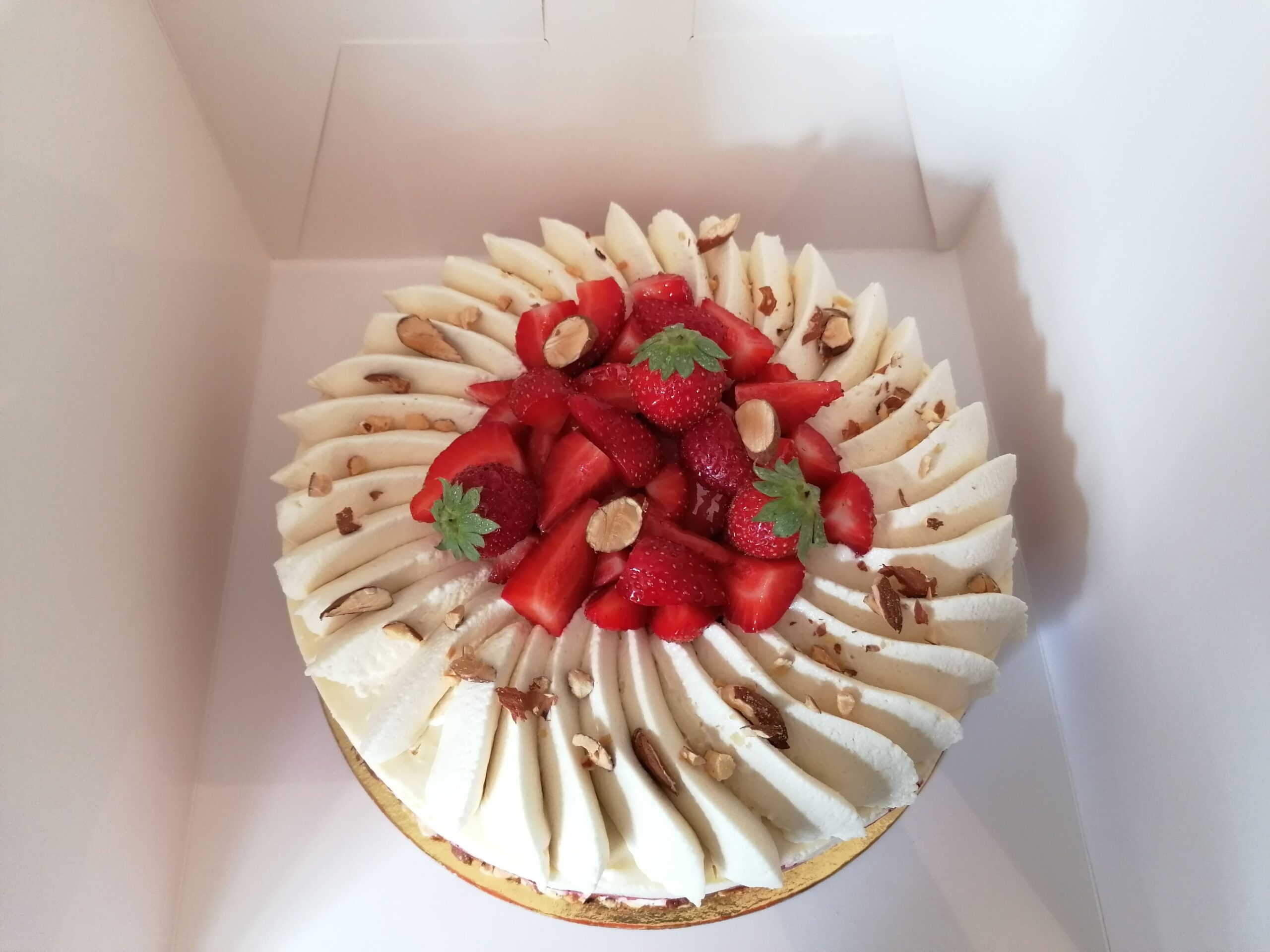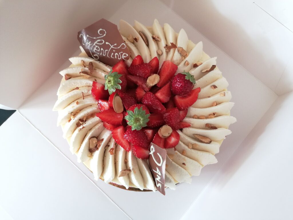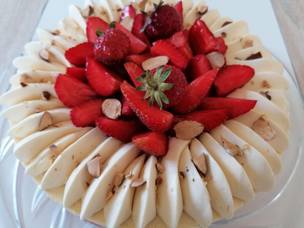 - Des amandes torréfiées et concassées, les mêmes que celles parsemées sur les vagues en crème chantilly mascarpone, ont été ajoutées sur l’ensemble du pourtour de l’entremet, sous les demi-fraises qui le composent.