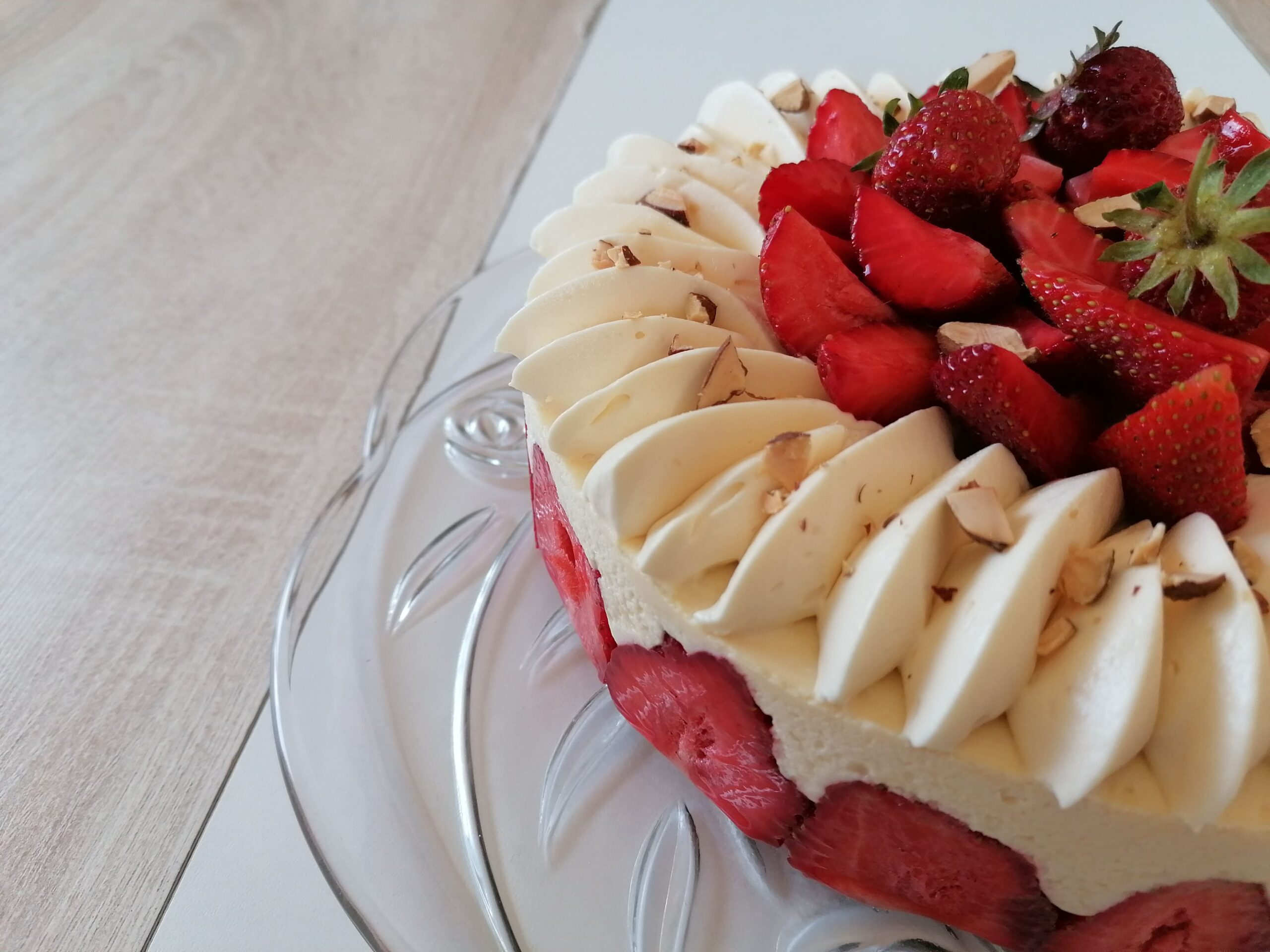 - Attention car cet entremet est composé de beaucoup de fraises fraîches, fruits alors très fragiles qui ne supportent pas la congélation sans quoi ces derniers s’abîmeraient, ramolliraient pour rendre leur jus, jus qui finirait par couler de l’entremet, l’imbiberait à l’excès jusqu’à le rendre bien moins esthétique ou, pire encore, jusqu’à le faire s’effondrer avant ou lors de sa découpe à sa dégustation. Il est donc nécessaire de ne pas laisser un entremet tel que celui-ci bien trop longtemps au congélateur, et même d’éviter de le congeler. C’est pour cette raison également qu’il ne sera pas possible de le préparer trop en avance mais juste la veille au soir du jour J pour une conservation courte au froid et non longue au congélateur ! Je l’ai fait ici que quelques heures, le temps qu’il congèle sur les côtés pour l’obtention de bords lisses, en mettant ainsi un maximum de chance de mon côté pour que la crème reste collée le moins possible à la rhodoïd en la retirant.