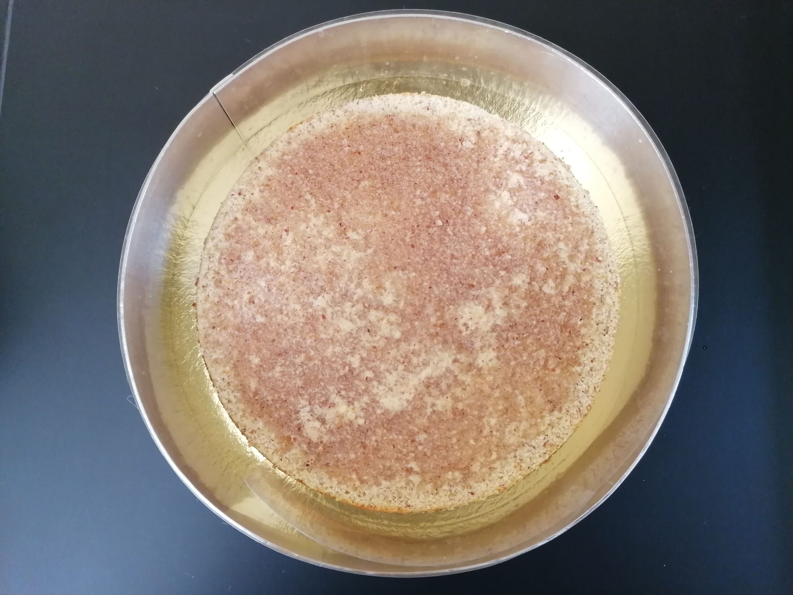 - Le second disque, conservé à 18 cm de diamètre, aura, sans difficulté, toute la place nécessaire dans l’entremet quand il faudra l’insérer un peu près au centre du montage : il reste donc au diamètre de base !