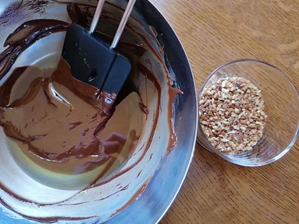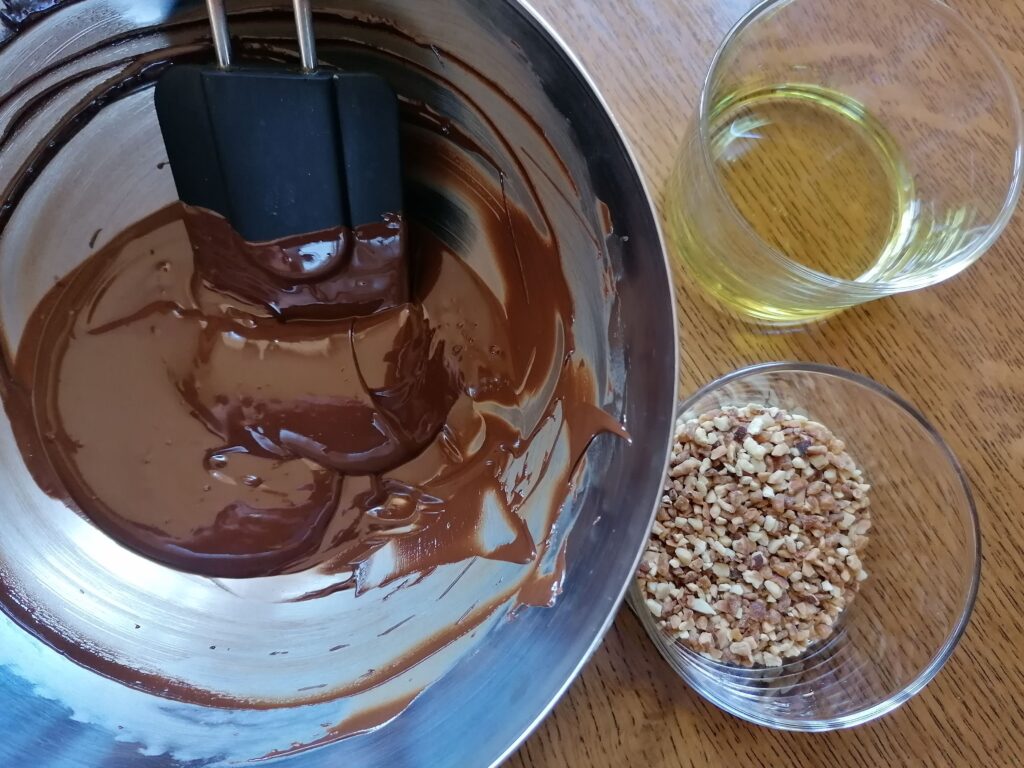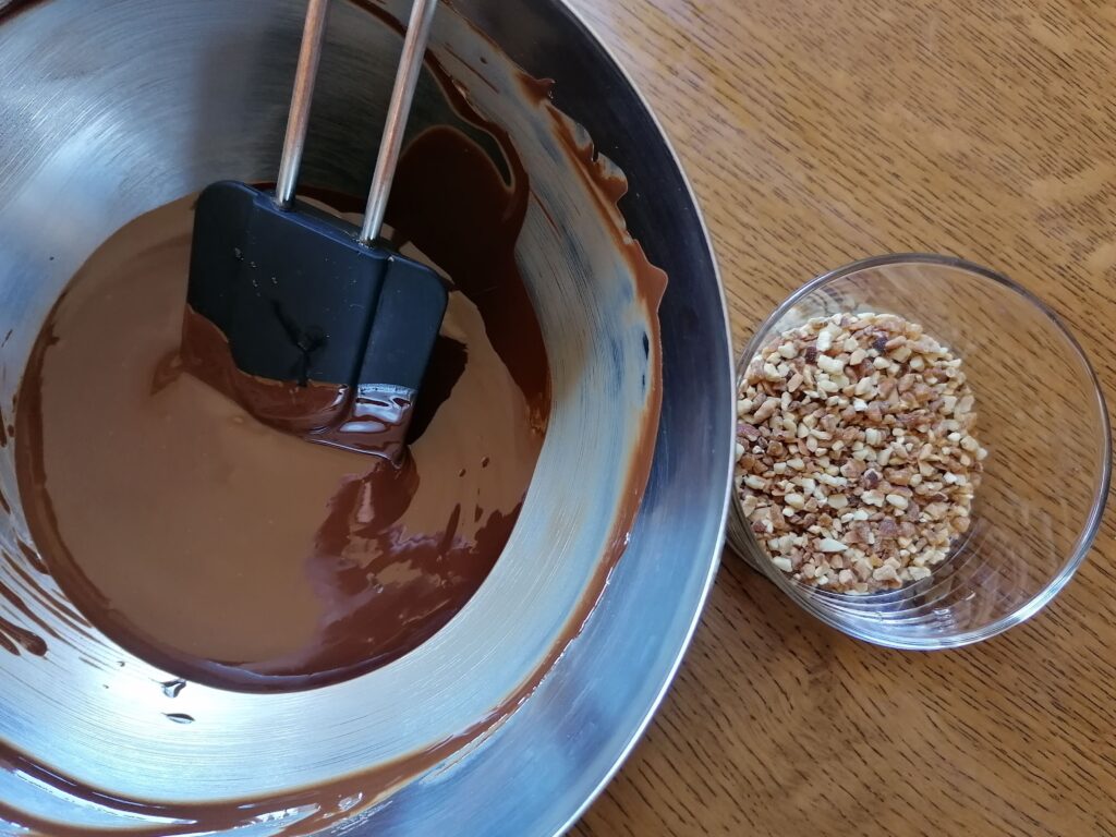 - Fondre au bain-marie le chocolat noir préalablement coupé en morceaux, jusqu’à atteindre les 45°C maximum, puis incorporer à la maryse, et hors du feu, l’huile de pépins de raisin et les amandes torréfiées : le glaçage rocher est ainsi prêt !