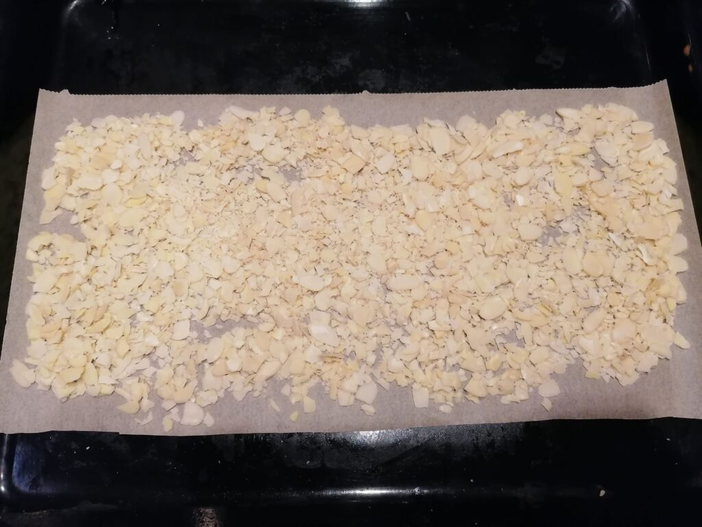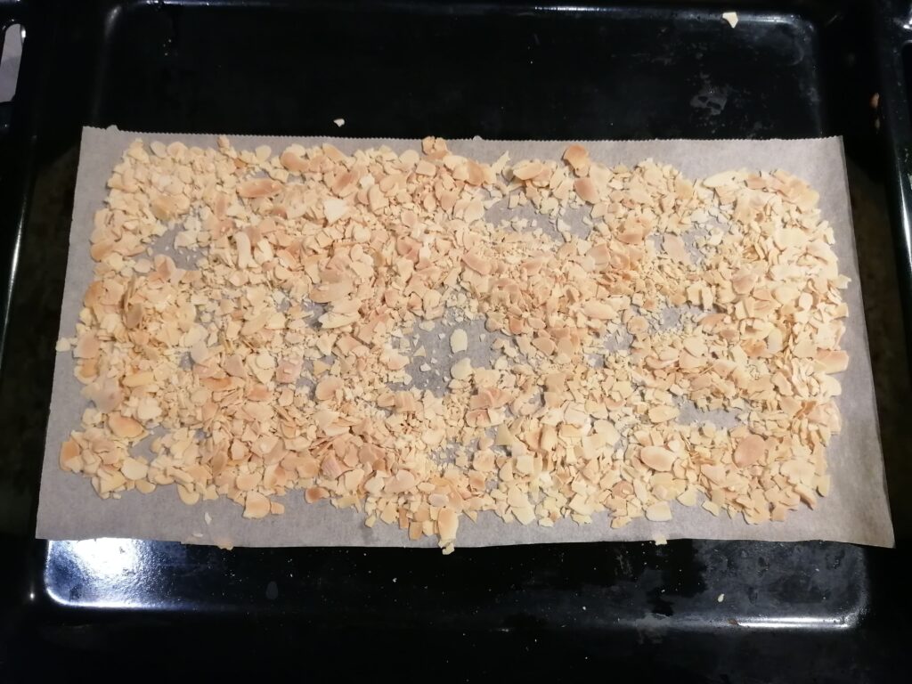 - Torréfier les amandes hachées, préalablement étalées sur une plaque recouverte d’une feuille de papier cuisson, à 150°C durant 15 min, dans un four préchauffé à 150°C.