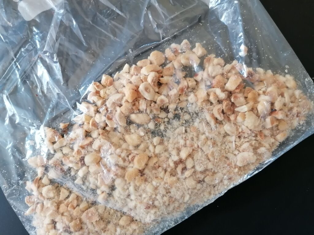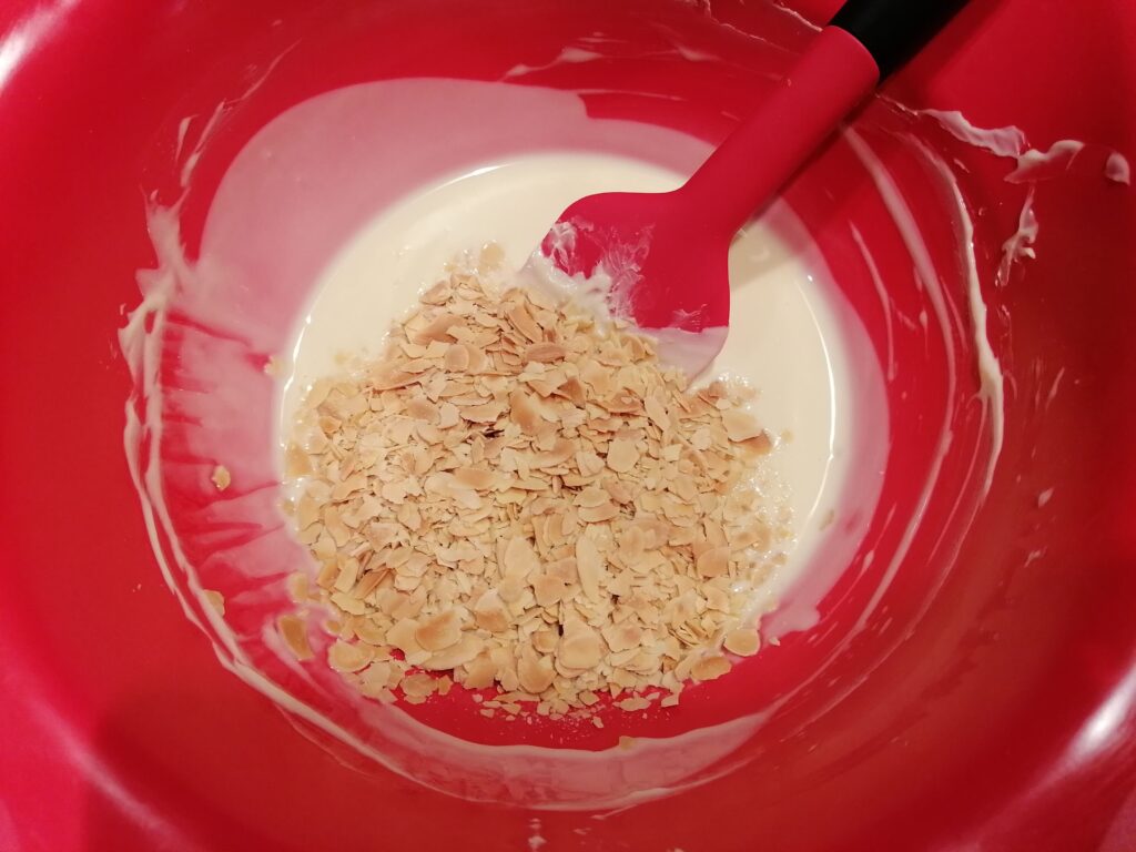 - amandes hachées (ou autres fruits secs hachés : noisettes hachées, pralin, …) : 50g