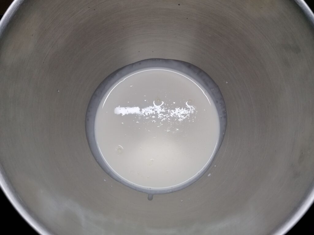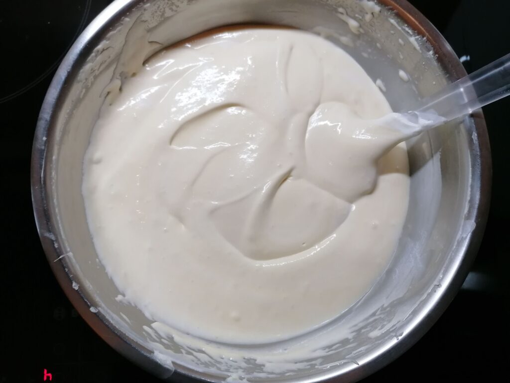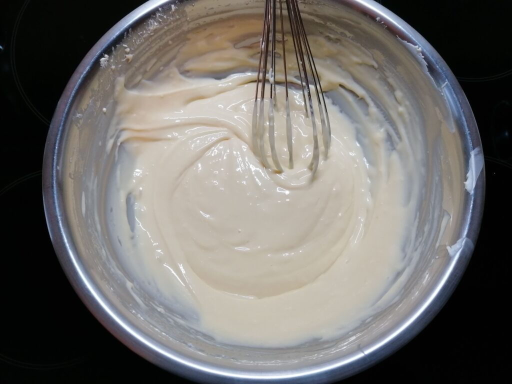 - Au départ, des grumeaux vont apparaitre pour, peu à peu et à force de remuer, fondre et disparaitre indiquant qu’il faut cesser le mélange.