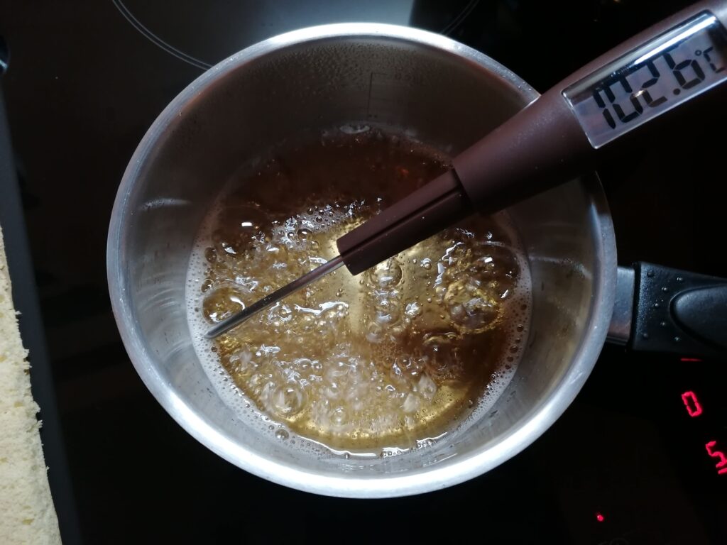 - Sur feu vif et avec un thermomètre, chauffer jusqu’à atteindre les 115°C, en remuant de temps en temps avec le thermomètre tout en vérifiant la température du sirop.