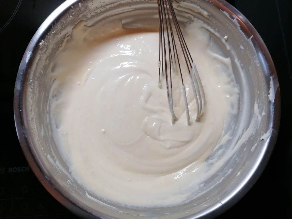 - Récupérer, sans attendre, la cuve une fois la pâte à bombe prête, verser sa totalité sur le mascarpone, préalablement détendu, puis mélanger de suite au fouet à main, avant que le mascarpone ne refroidisse et ne fige complétement la pâte à bombe, et ceci jusqu’à obtention d’une texture lisse et onctueuse.