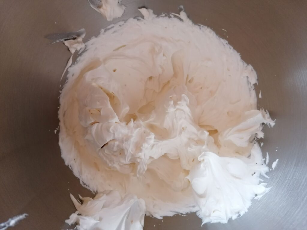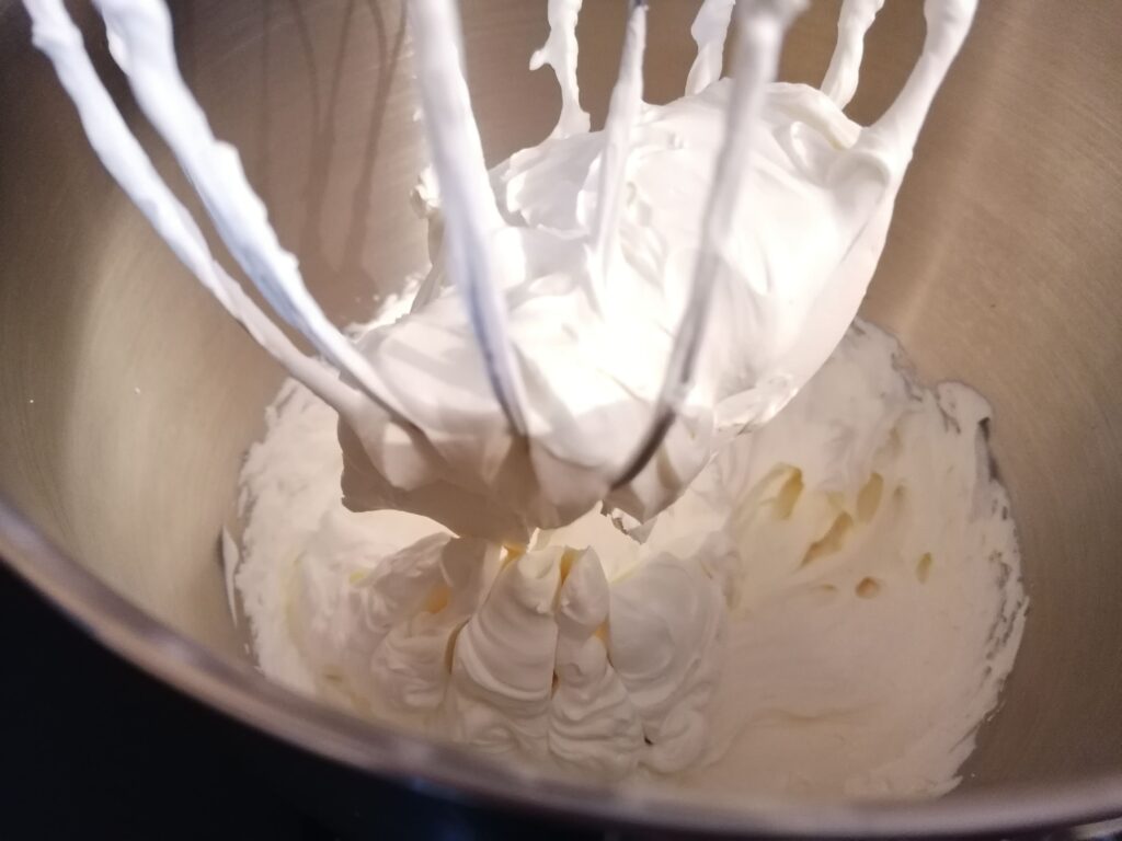 - Le lendemain, récupérer la crème chantilly mascarpone vanille puis, au robot et au fouet, la foisonner en la battant environ 5 min à vitesse moyenne jusqu’à obtention d’une crème fouettée homogène, lisse, épaisse, bien ferme et onctueuse, mais sans trop foisonner de peur qu’elle ne tranche et ne devienne granuleuse.