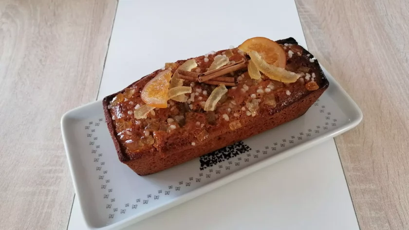 - Décorer, sans excès, le pain d’épices avec des bâtons de cannelle, des écorces d’oranges confites (ou, comme ici, de citrons confits et de demi-rondelles d’oranges confites) et des étoiles de badiane (mais non présentes ici), ceci au gré des envies !