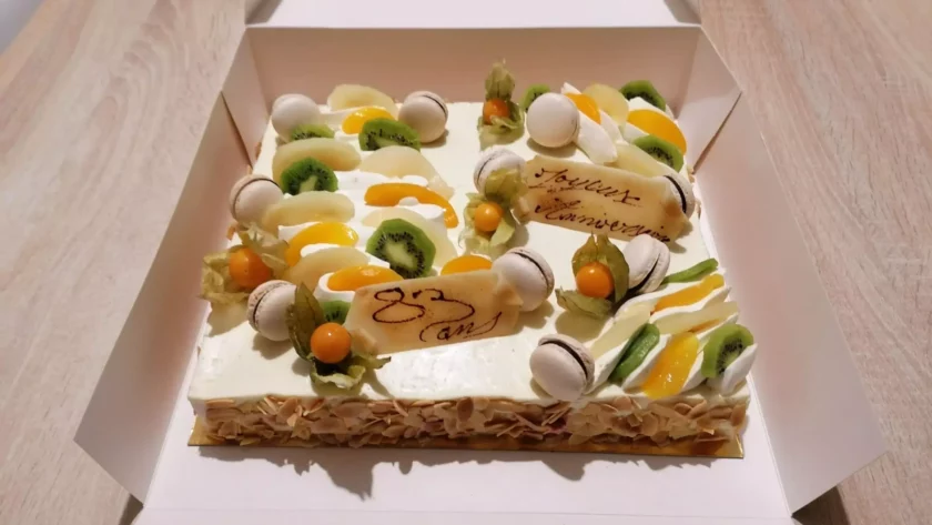 - Couper les fruits les plus imposants grossièrement en assez gros morceaux, sans excès non plus, le but étant qu’il y est de la matière en bouche tout en faisant ressortir leur arôme lors de la dégustation, ceci au beau milieu d’une crème diplomate, le tout couché sur du biscuit.