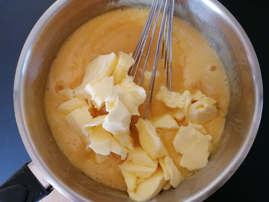 • Réaliser la crème telle qu’elle est donnée dans la recette de base, en utilisant le seconde recette, à savoir celle d’une crème avec davantage de beurre et gélifiée, plus compacte et utilisée pour les number cakes, en remplaçant, en même quantité, la purée de citrons jaunes par de la purée de fruits de la passion et en retirant les zestes de citron ainsi que les graines de pavot du procédé.