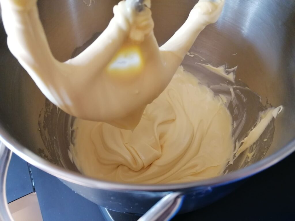 • Corner le cul-de-poule, ou transvaser la crème ainsi terminée, et très souple, dans un récipient propre, avant de la filmer au contact et de la mettre au froid pour une prise et un refroidissement complet jusqu’au lendemain, soit le jour J, jour du montage des cupcakes.
