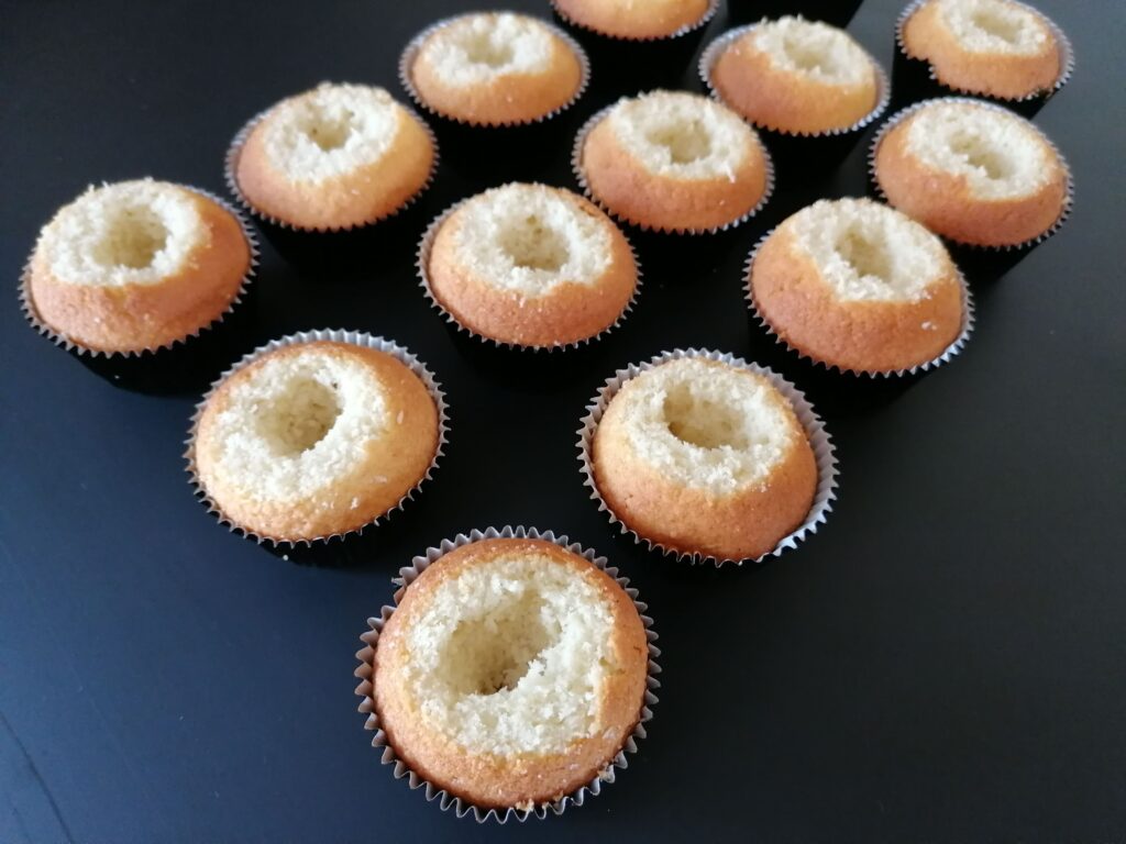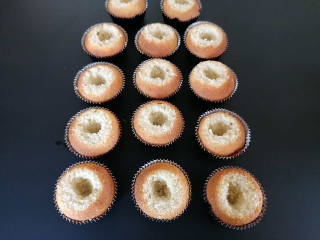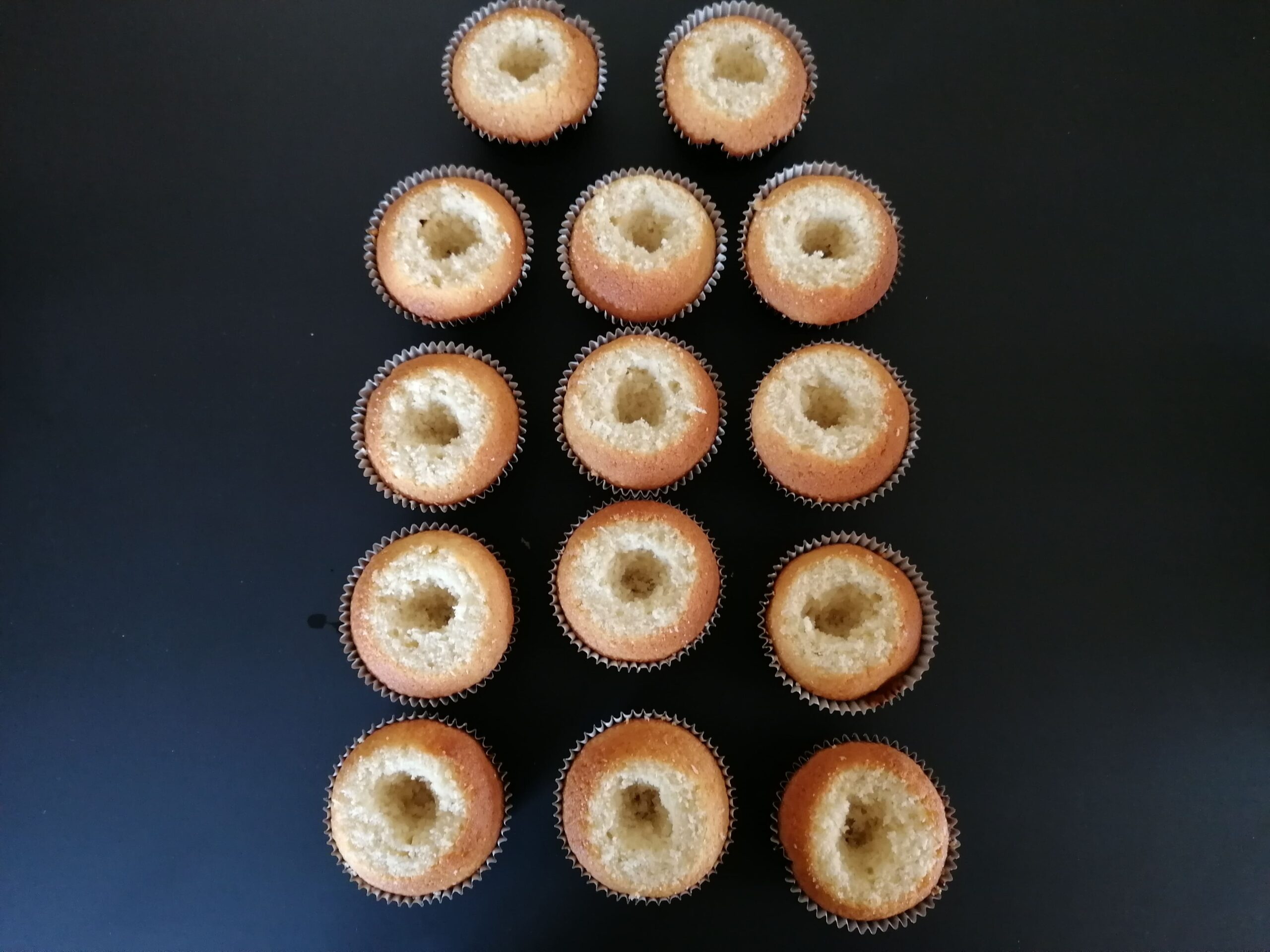 • Evider, délicatement et sans aller jusqu’au fond, le centre des petits gâteaux, sachant qu’il est possible d’utiliser un évideur à cupcakes conçu spécialement pour cela.