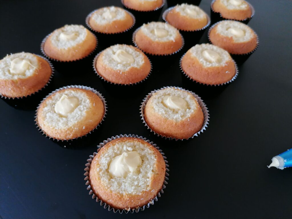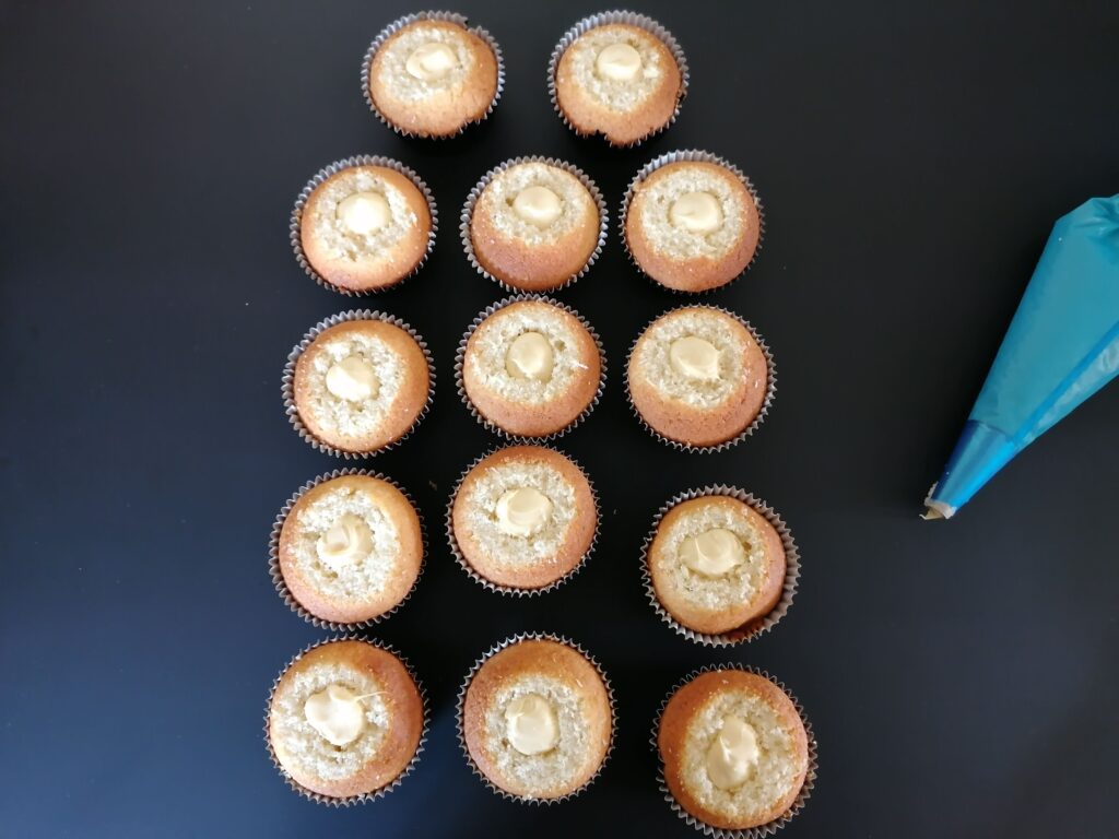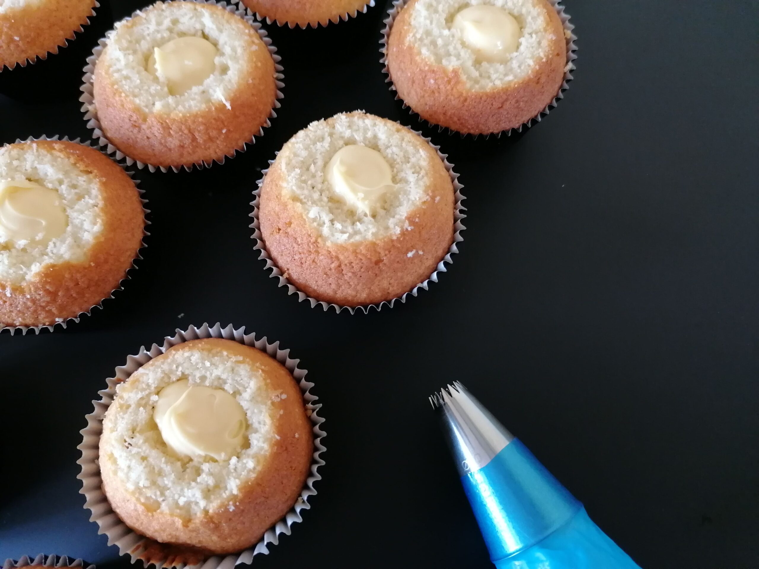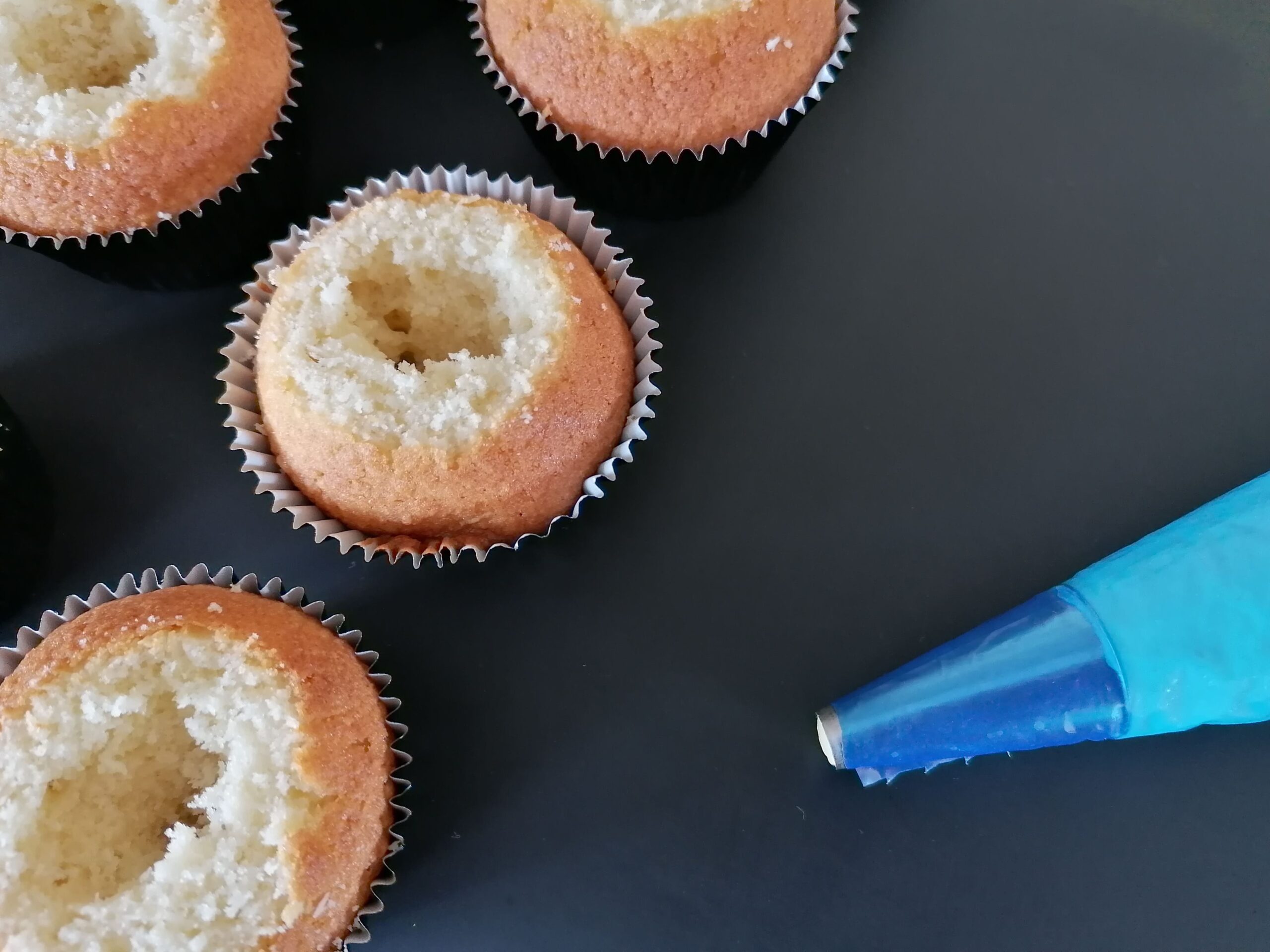 • Récupérer les cupcakes et remplir, proprement et délicatement, leur centre creusé d’un cœur de crème, ceci jusqu’à hauteur.