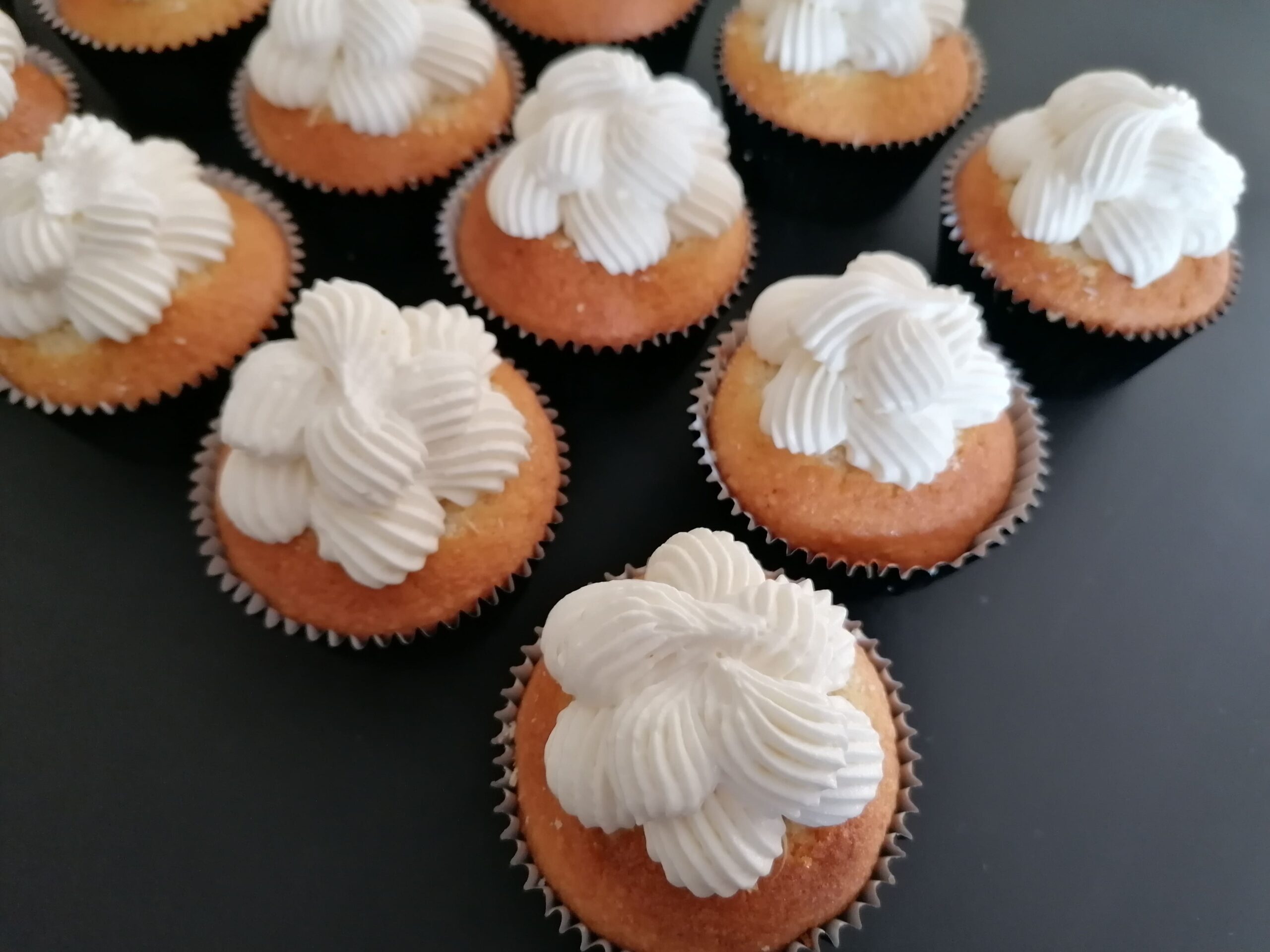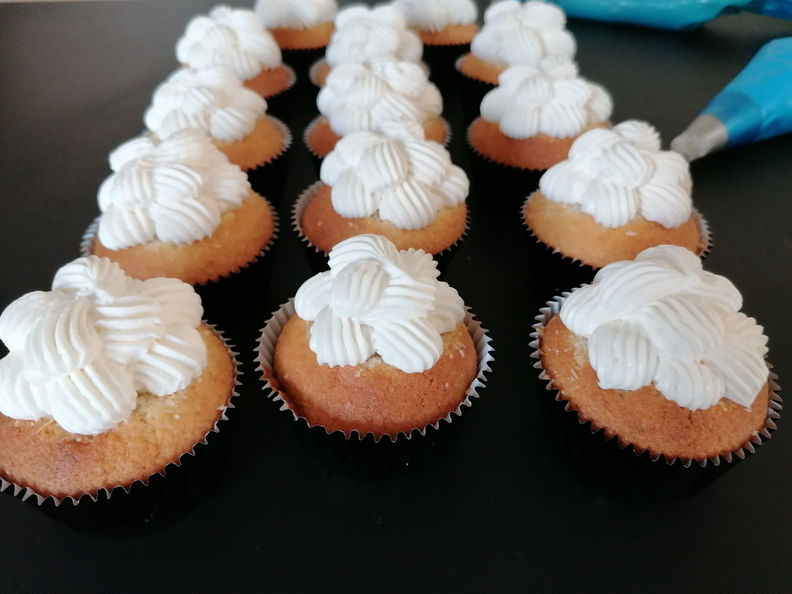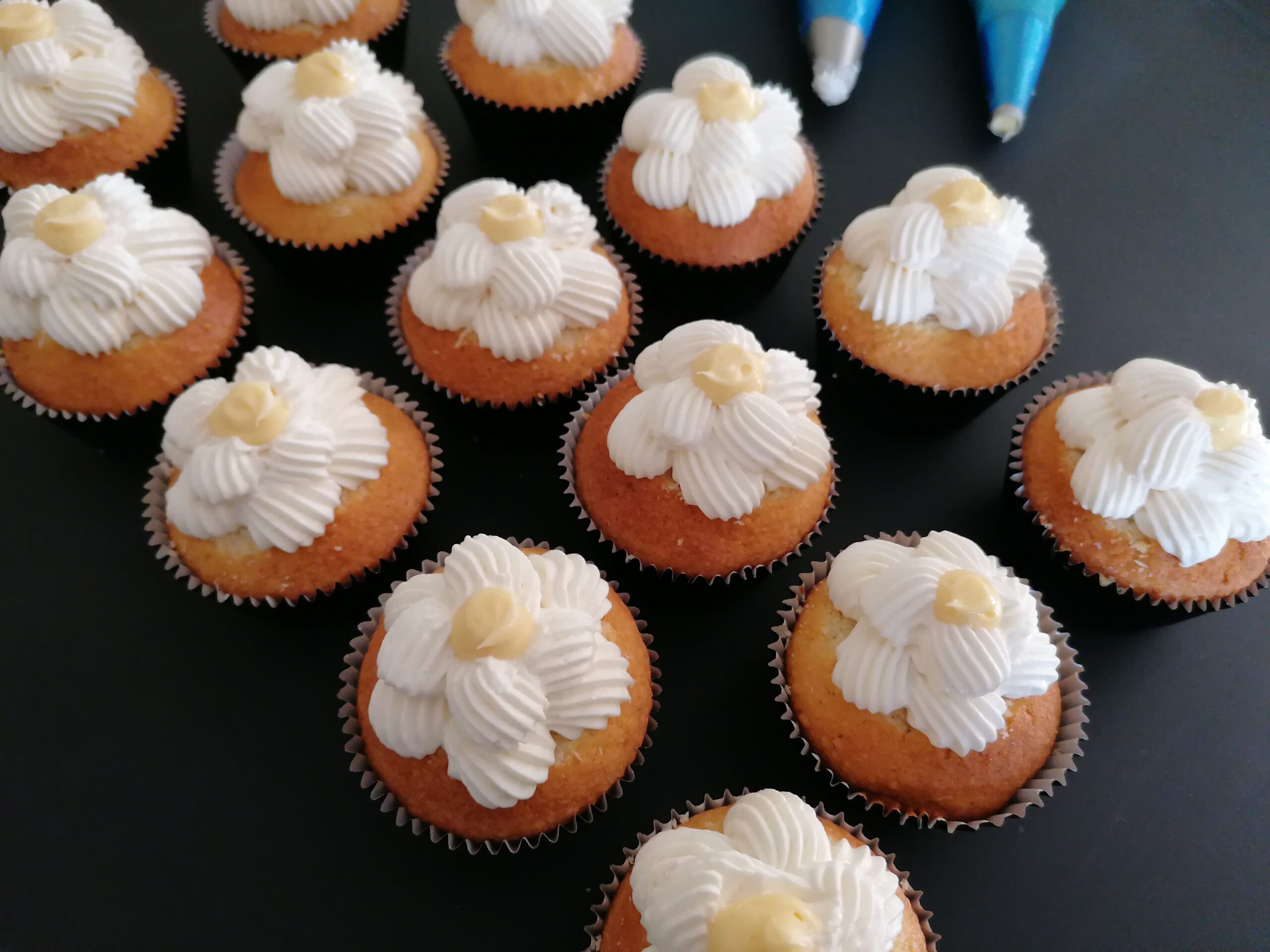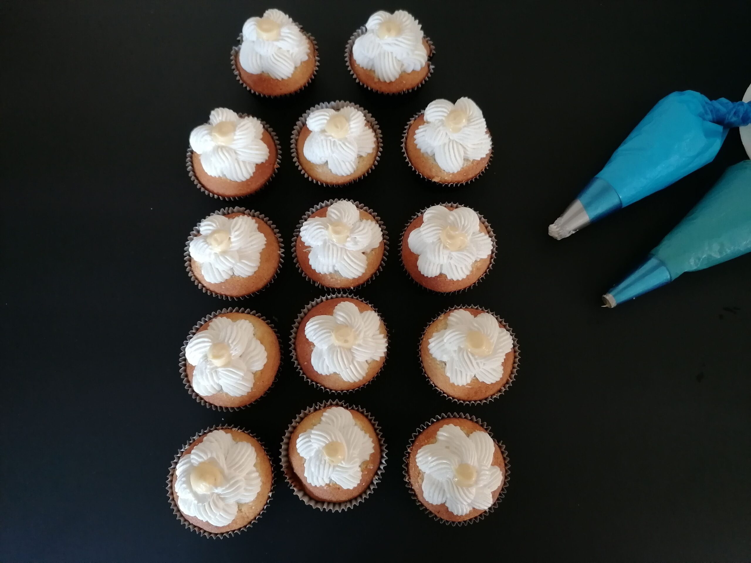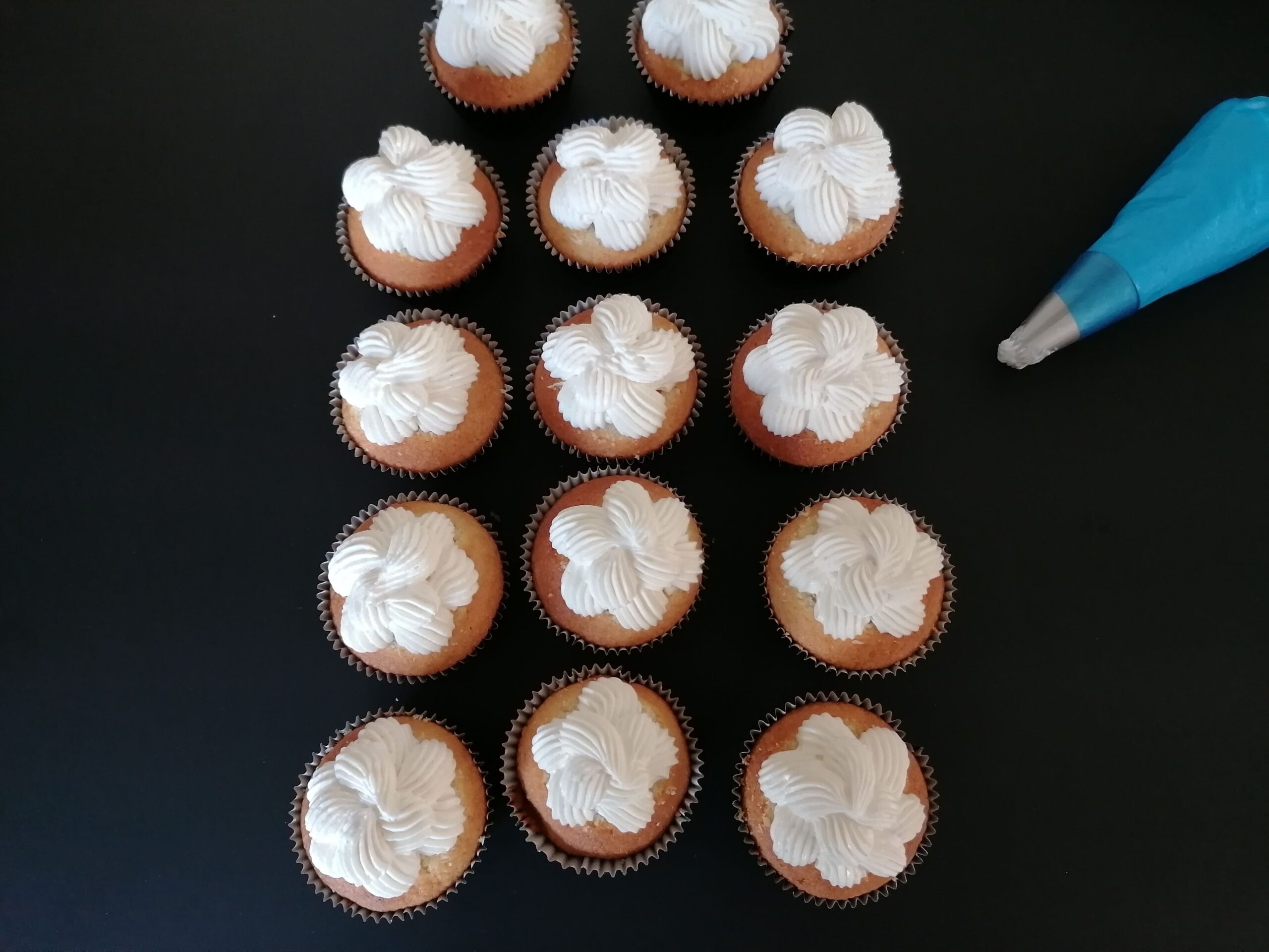 • Pocher, proprement et délicatement sur chacun des cupcakes, une bille de crème au centre du dessus de leur rosace de « gouttes » de crème.