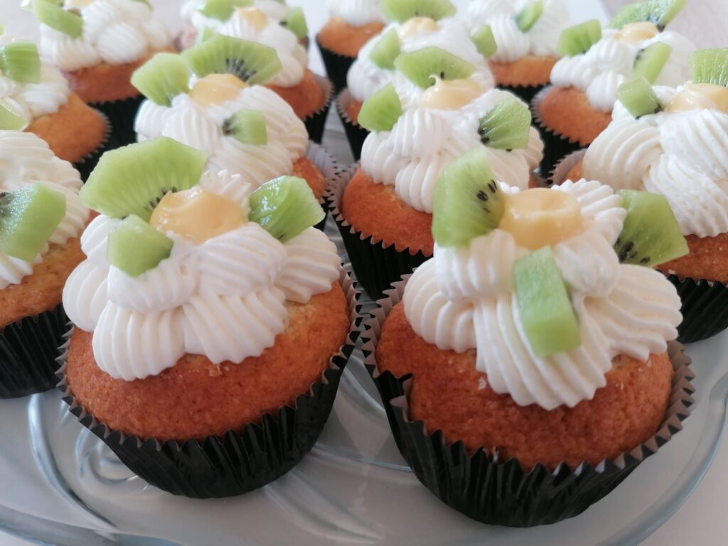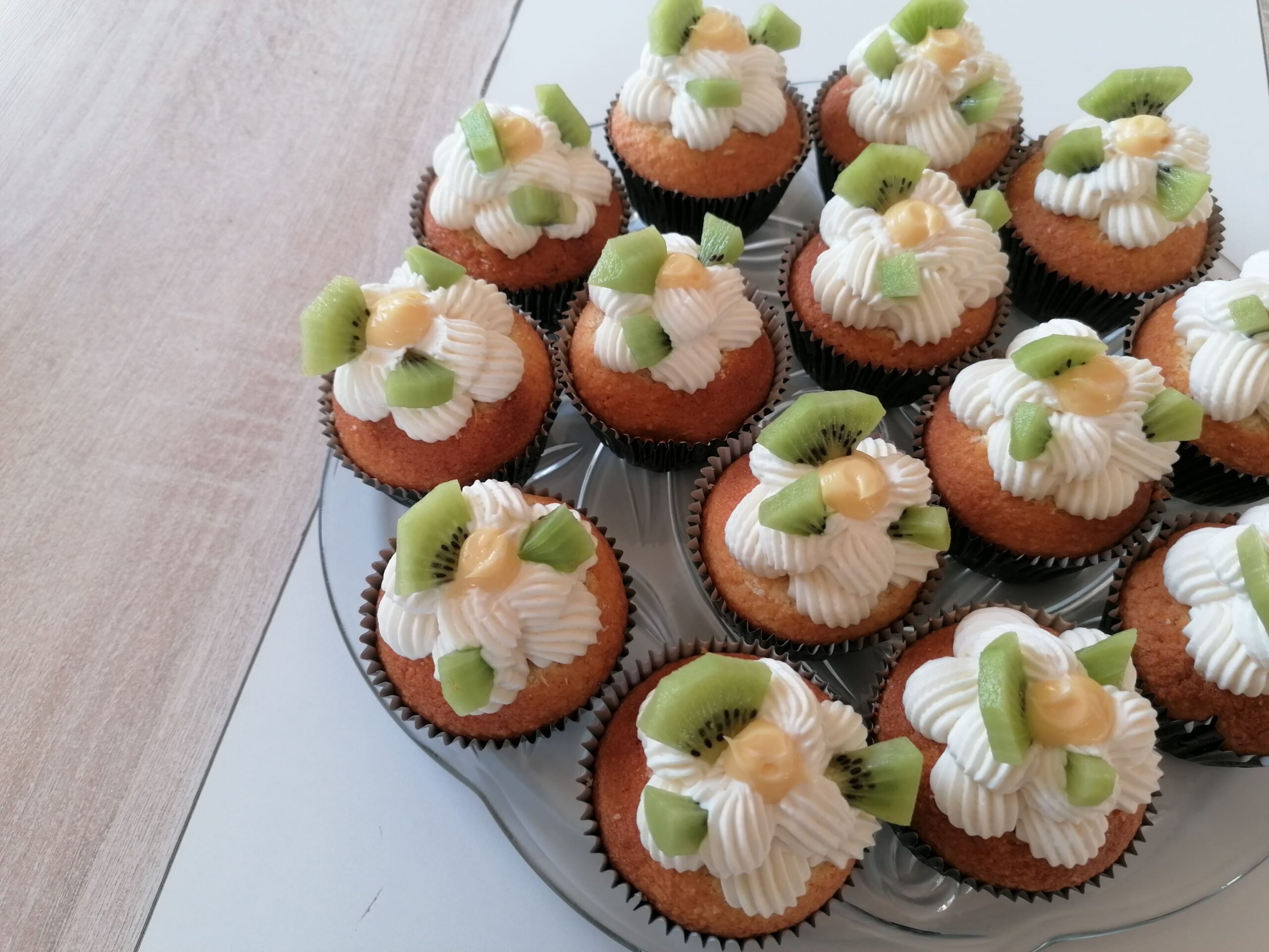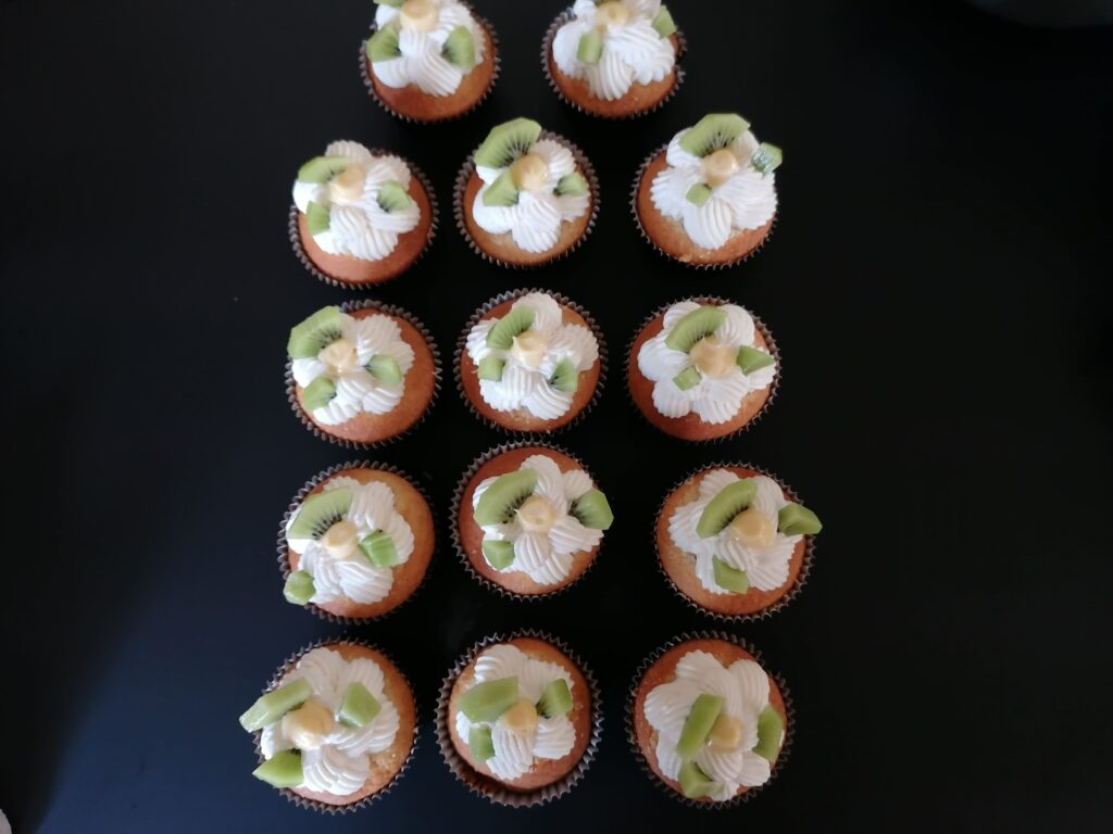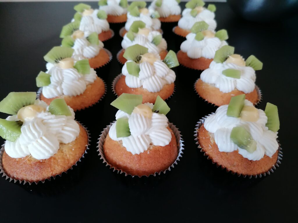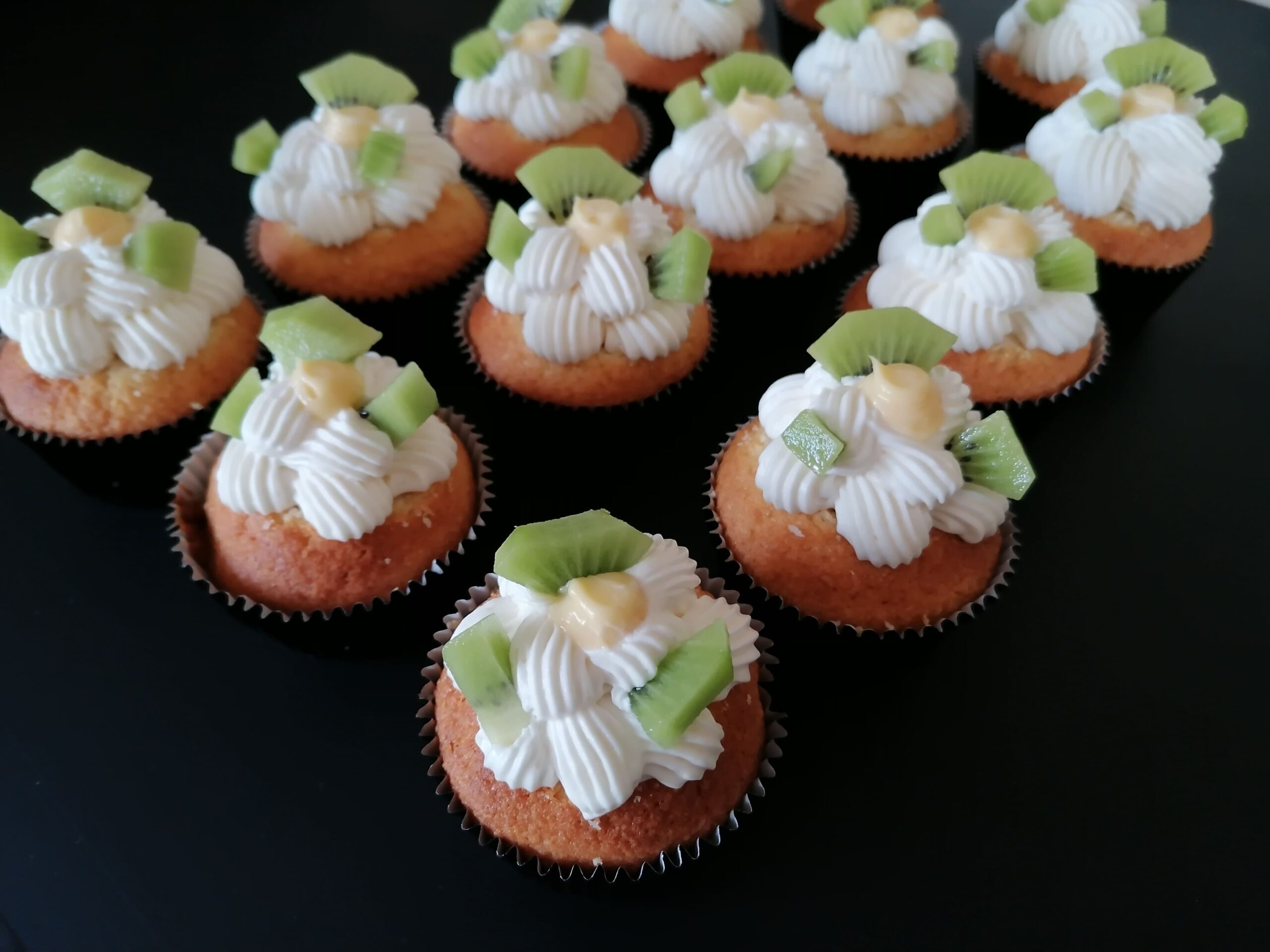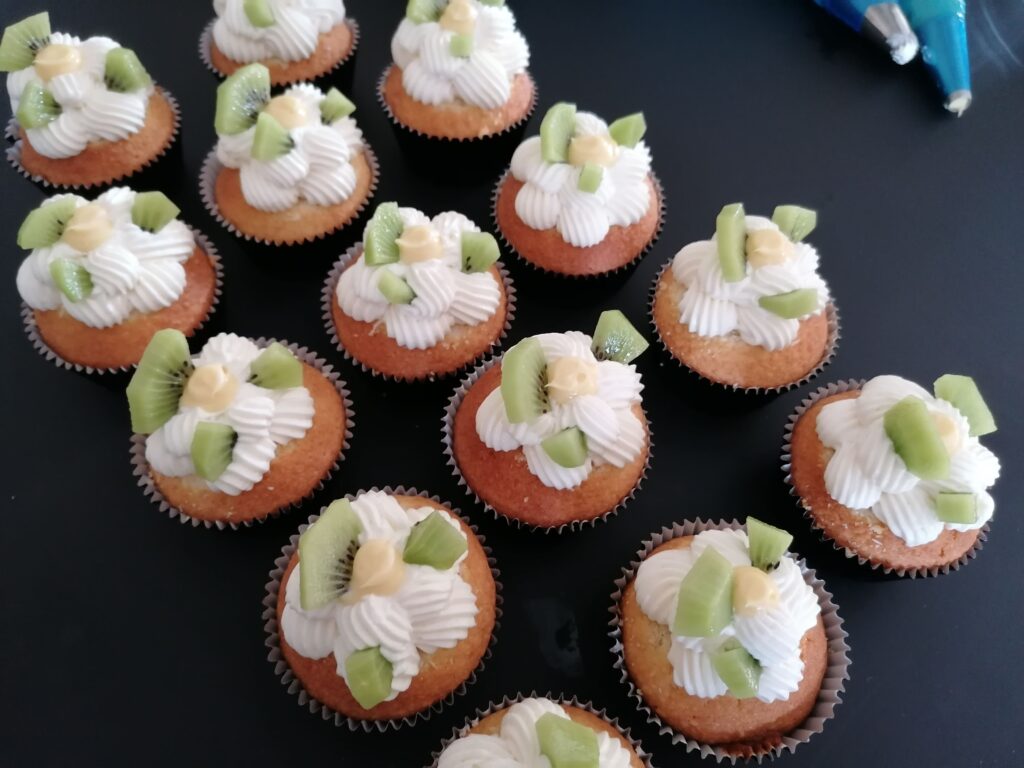 • Récupérer des demi-rondelles de kiwis puis, soit sous cette forme, soit en les recoupant de nouveau en deux en amont pour de plus petites pièces, les placer harmonieusement, et au nombre de 2, sur chacun des cupcakes, toujours debout et leur pointe légèrement enfoncée dans la crème chantilly mascarpone de manière à les faire tenir au tout.