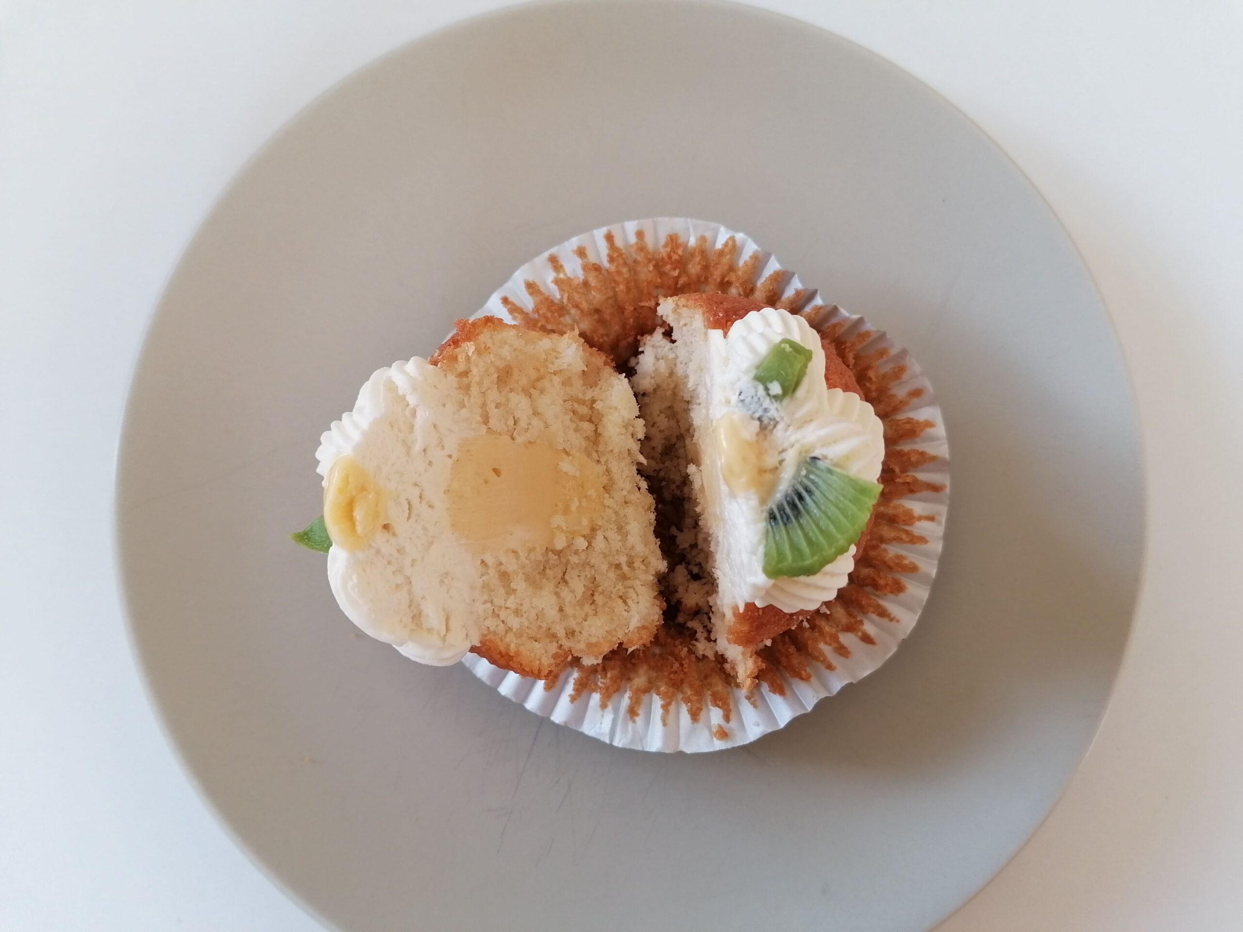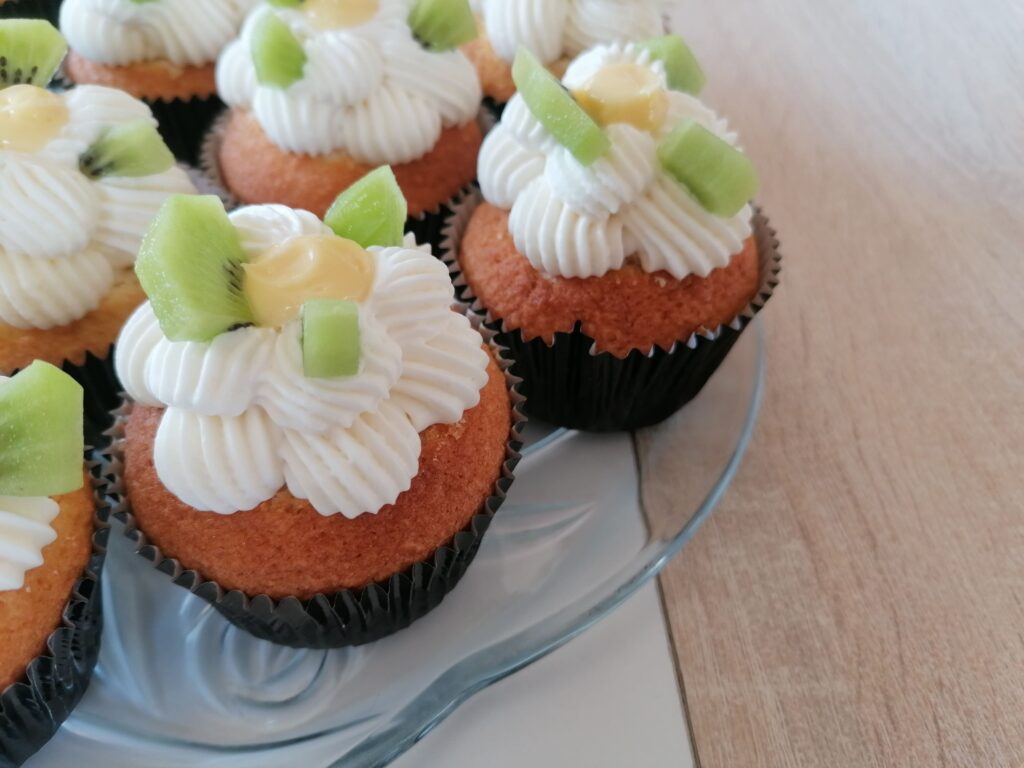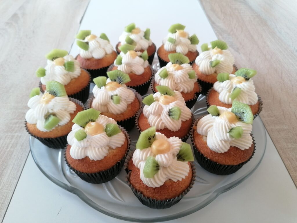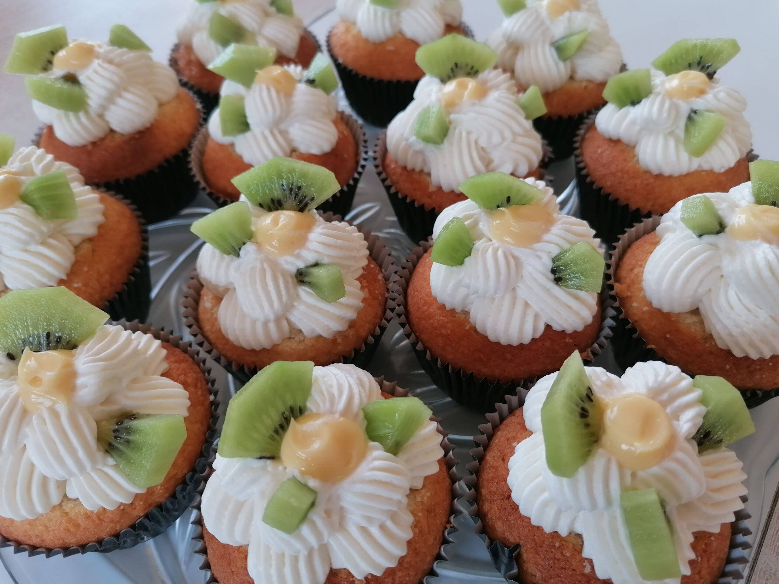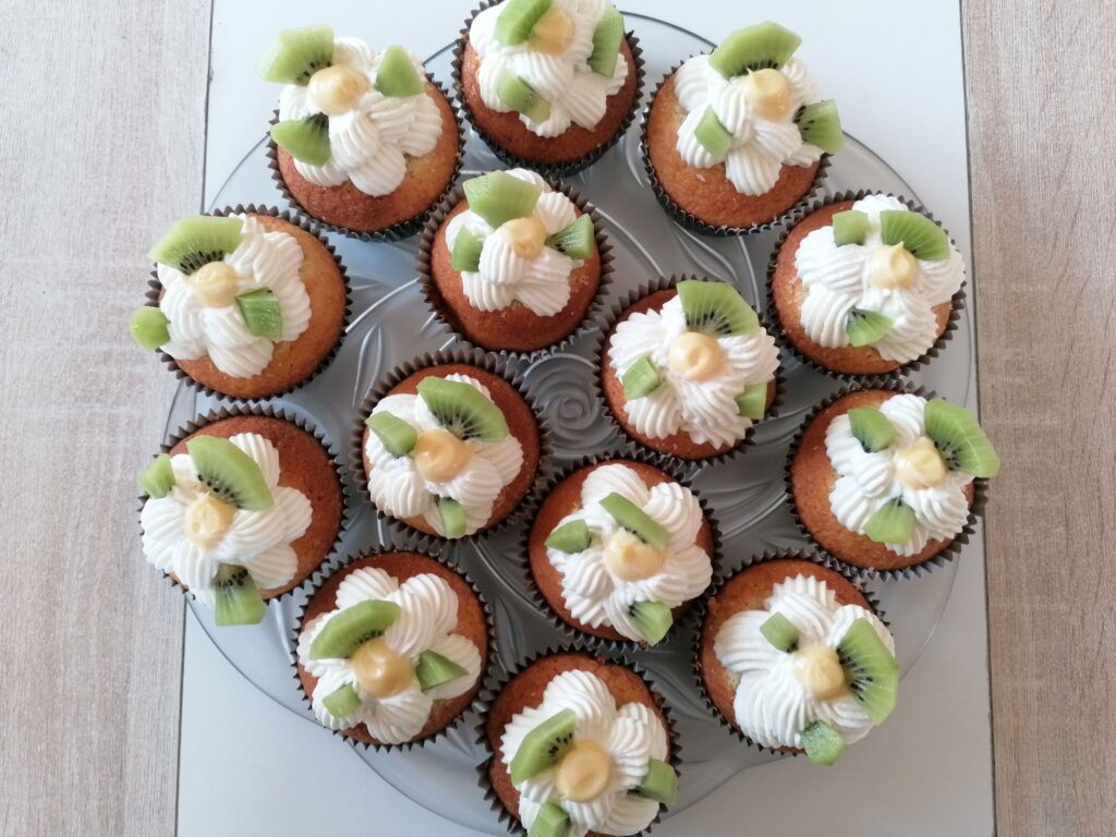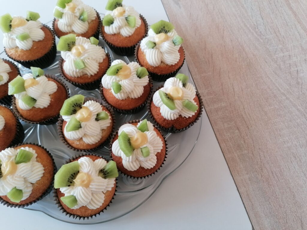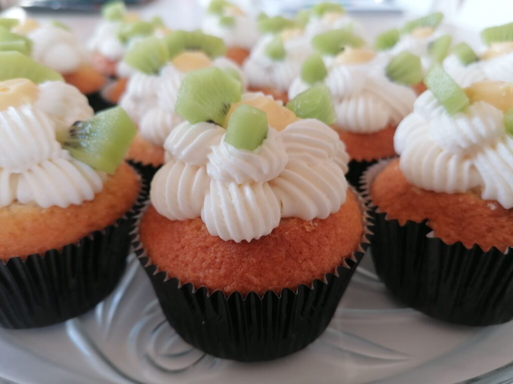 • Récupérer des demi-rondelles de kiwis puis, soit sous cette forme, soit en les recoupant de nouveau en deux en amont pour de plus petites pièces, les placer harmonieusement, et au nombre de 2, sur chacun des cupcakes, toujours debout et leur pointe légèrement enfoncée dans la crème chantilly mascarpone de manière à les faire tenir au tout.