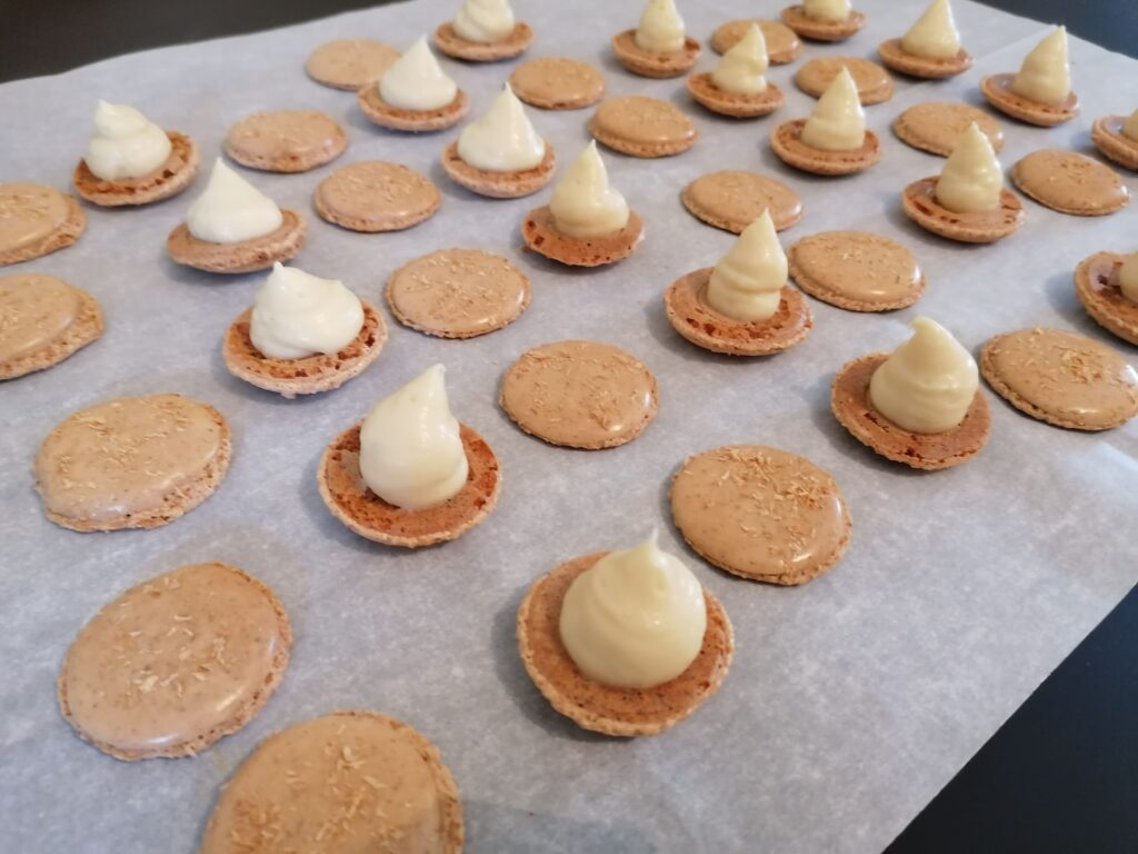 - en garniture de tartelettes, de macarons, de financiers, de biscuits roulés, de truffes, …, avec une ganache encore liquide en la coulant de suite ou après prise plus ou moins longtemps au froid avec surveillance ;