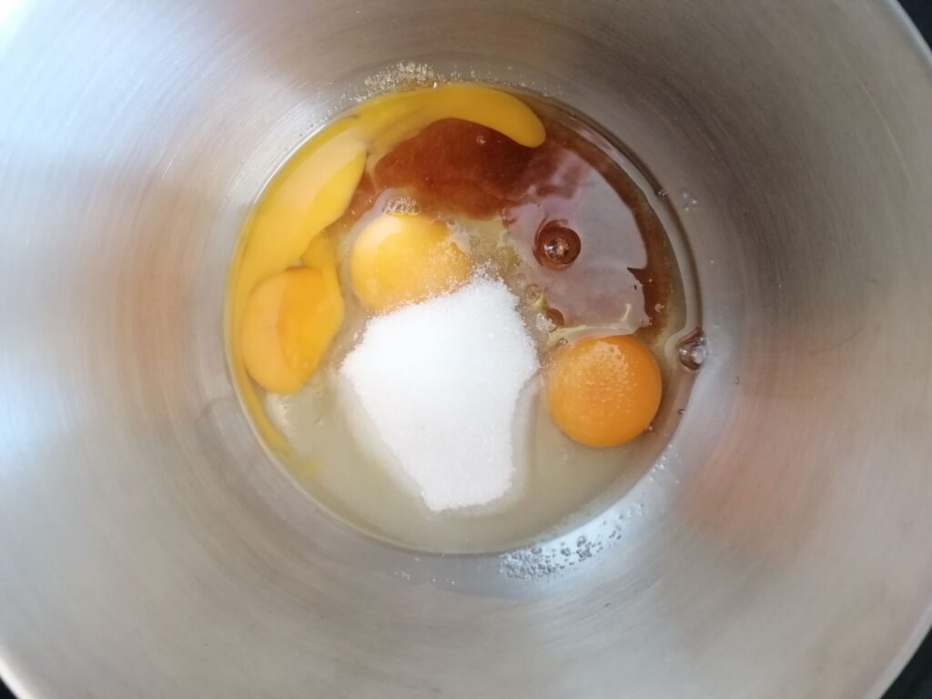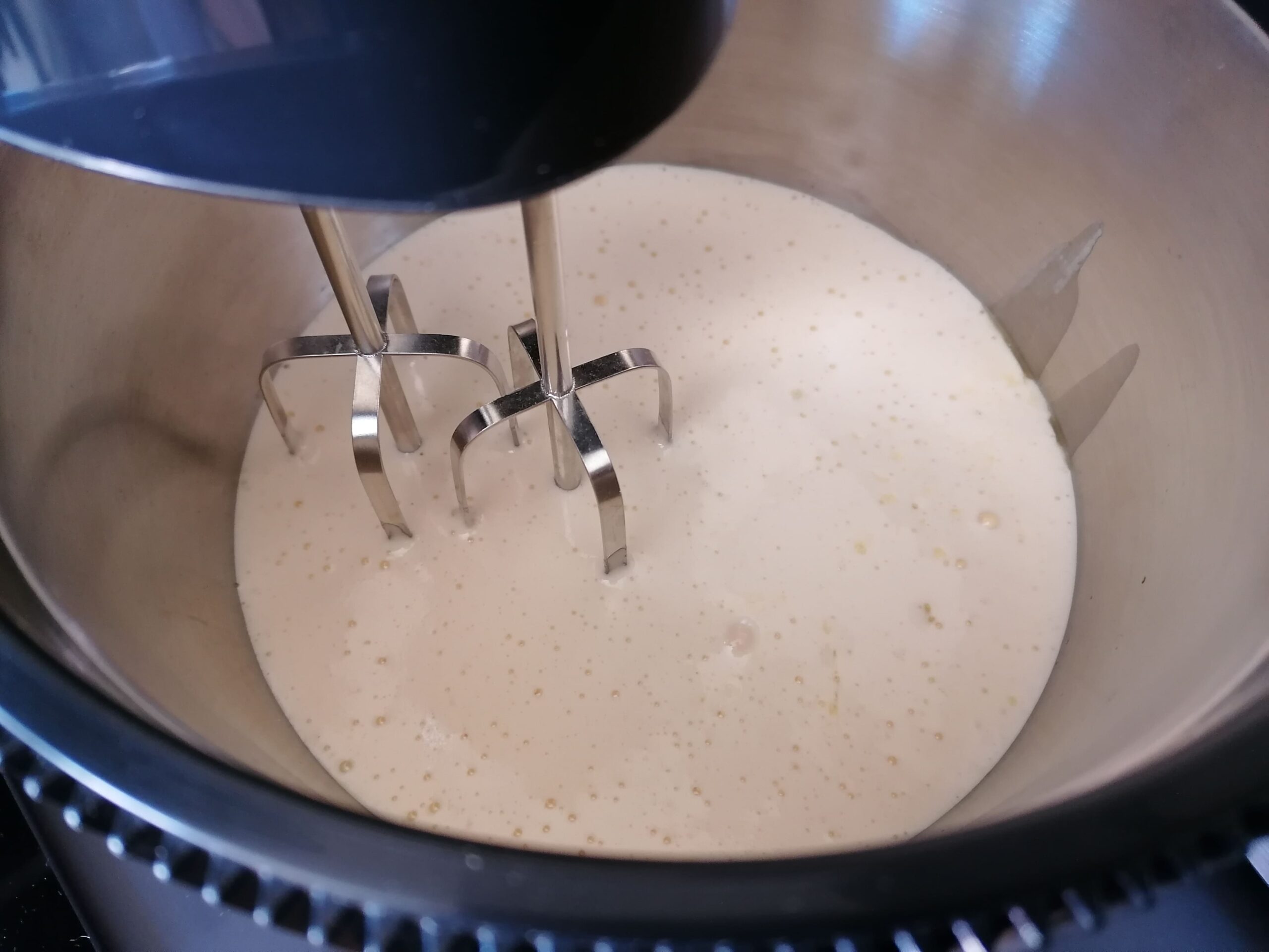 - Dans la cuve du batteur et au fouet, blanchir, à grande vitesse et durant environ 10 min, les œufs entiers avec le sucre semoule et la cassonade jusqu’à obtention d’un mélange blanchi, mousseux et ayant doublé de volume.