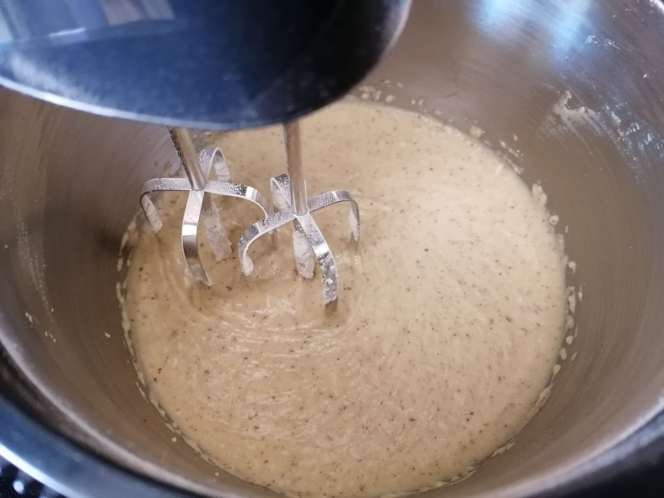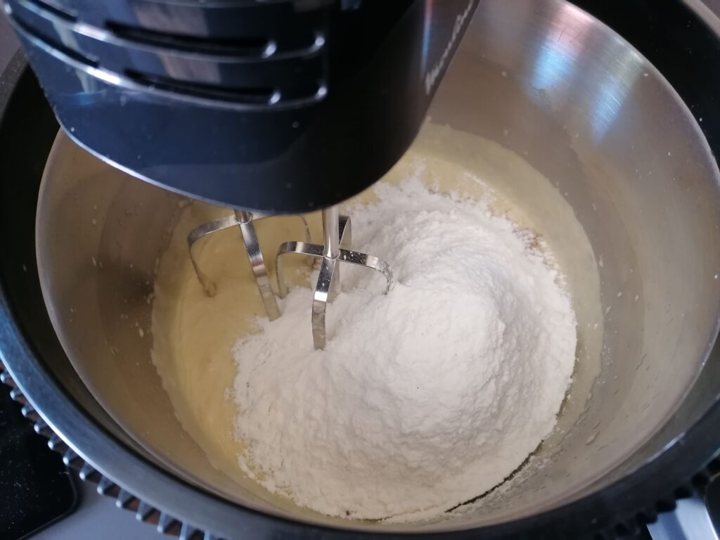 - Faire de même en ajoutant la poudre d’amandes, la farine et la levure préalablement tamisées ensemble.