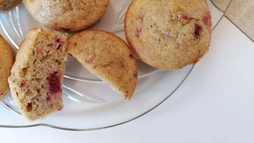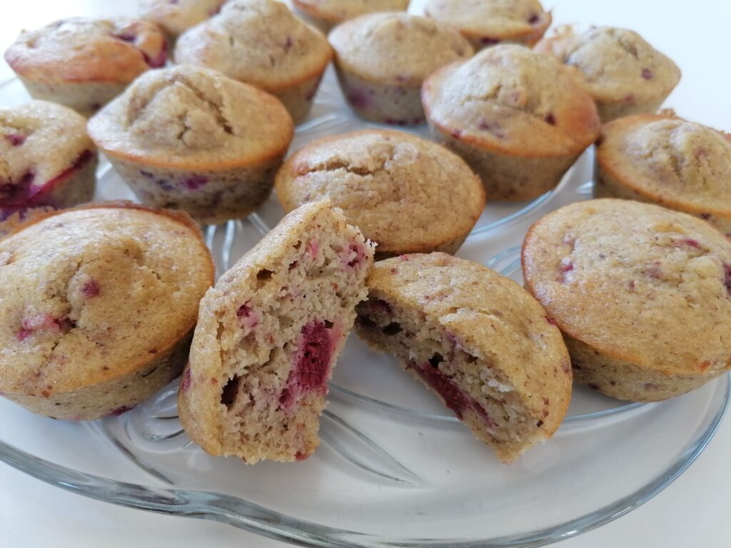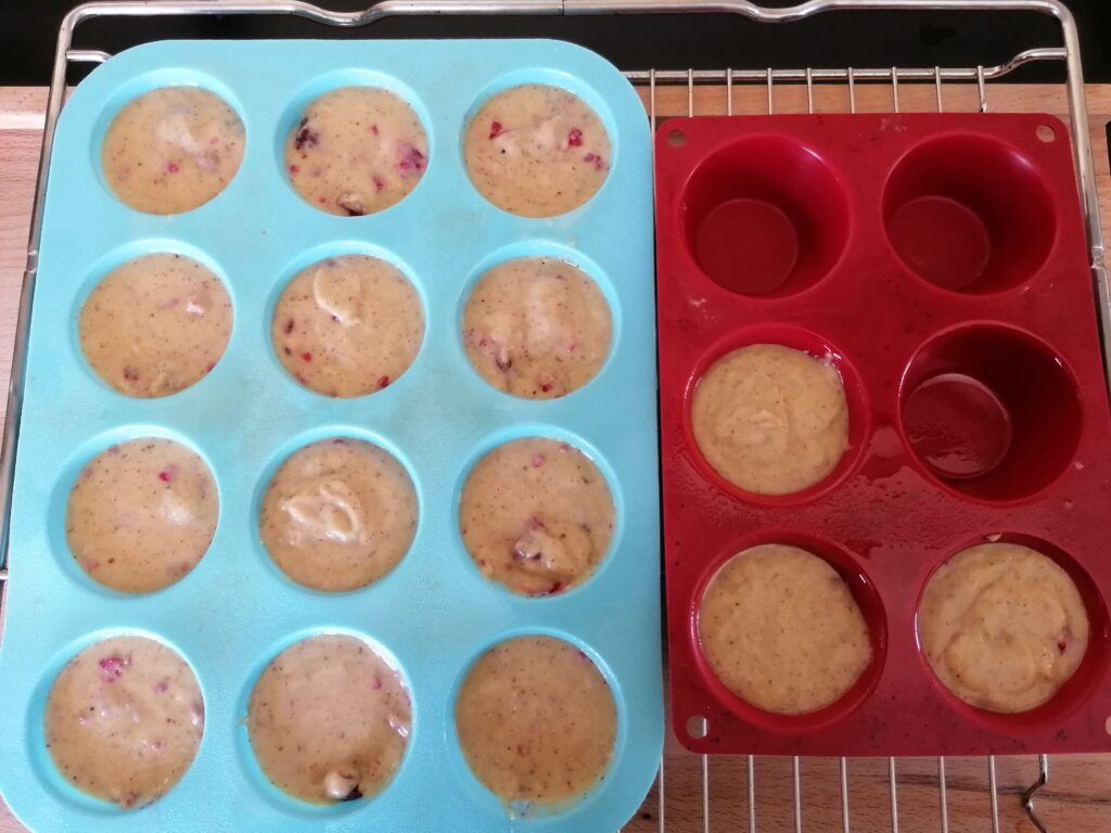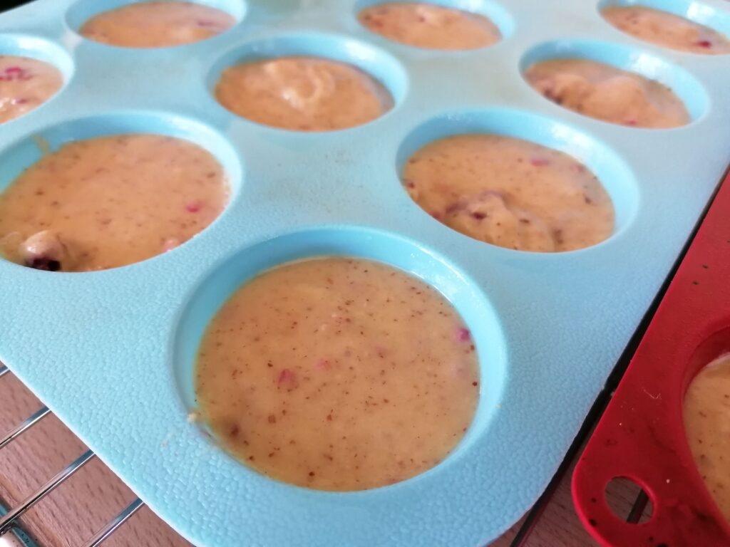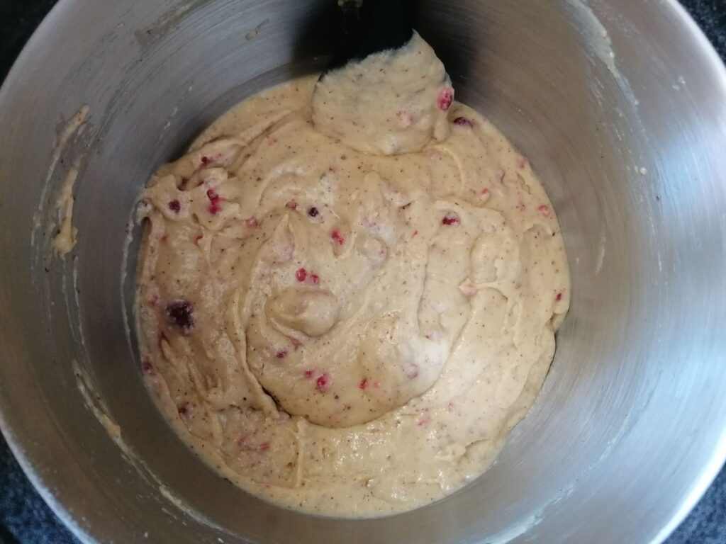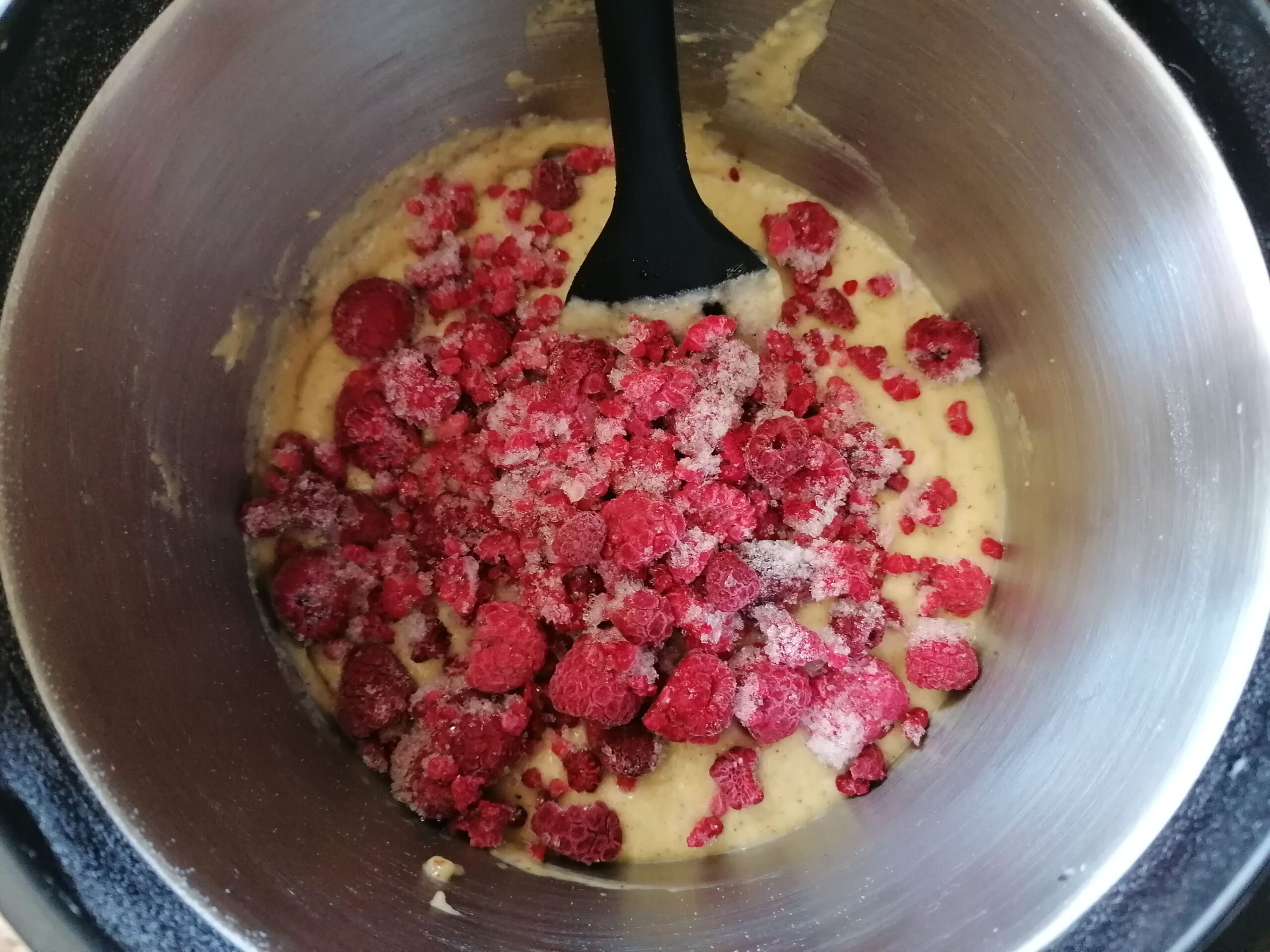- Récupérer la cuve du batteur et, à la maryse, incorporer délicatement les framboises, fraîches ou surgelées, sans travailler la pâte à l’excès au risque que les fruits rouges ne deviennent de trop fins morceaux ou encore ne soient réduites en purée en répandant leur jus dans la pâte.