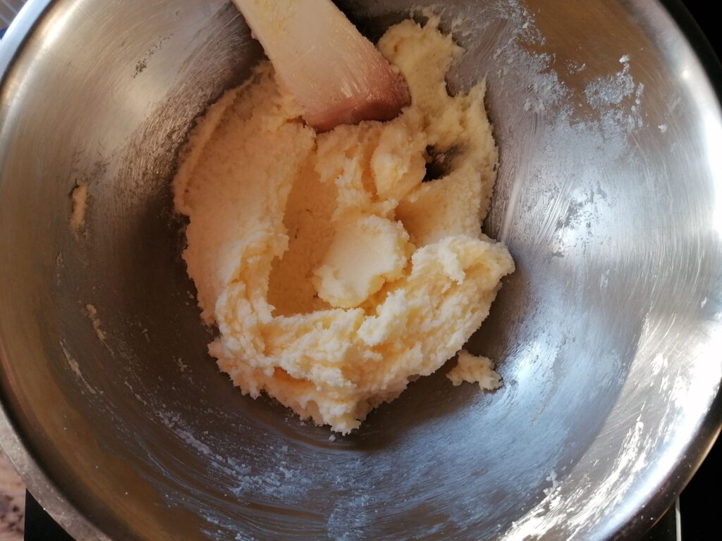 - Au robot et à la feuille ou dans un cul-de-poule et à la spatule, réaliser un beurre pommade avec le beurre doux, soit en l’ayant laissé ramollir à température ambiante soit en le passant très peu de temps au micro-ondes, puis le crémer avec le sucre semoule.