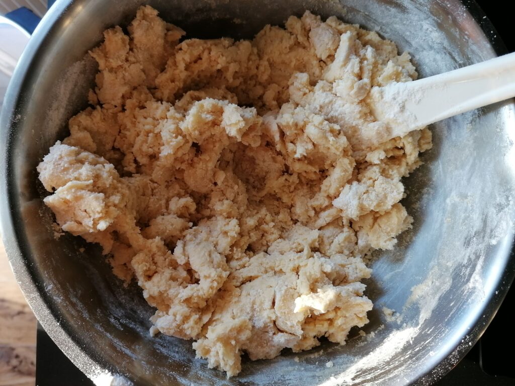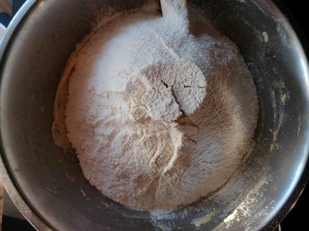 - Incorporer en 3 fois, toujours à la spatule, la farine, la levure chimique et le sel, préalablement tamisés ensemble et mélangés à la spatule, jusqu’à complète incorporation des matières sèches dans la pâte à chaque ajout, pour, au final, obtenir une pâte friable et en morceaux plus ou moins importants.