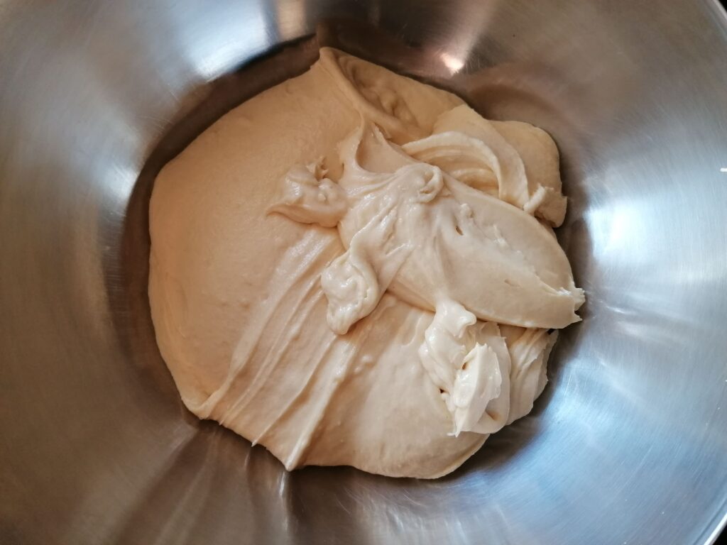- Travailler alors suffisamment la pâte afin d’ôter les grumeaux qui s’y seraient formés, tout en évitant de la mélanger à l’excès, ceci pour les mêmes raisons citées précédemment.