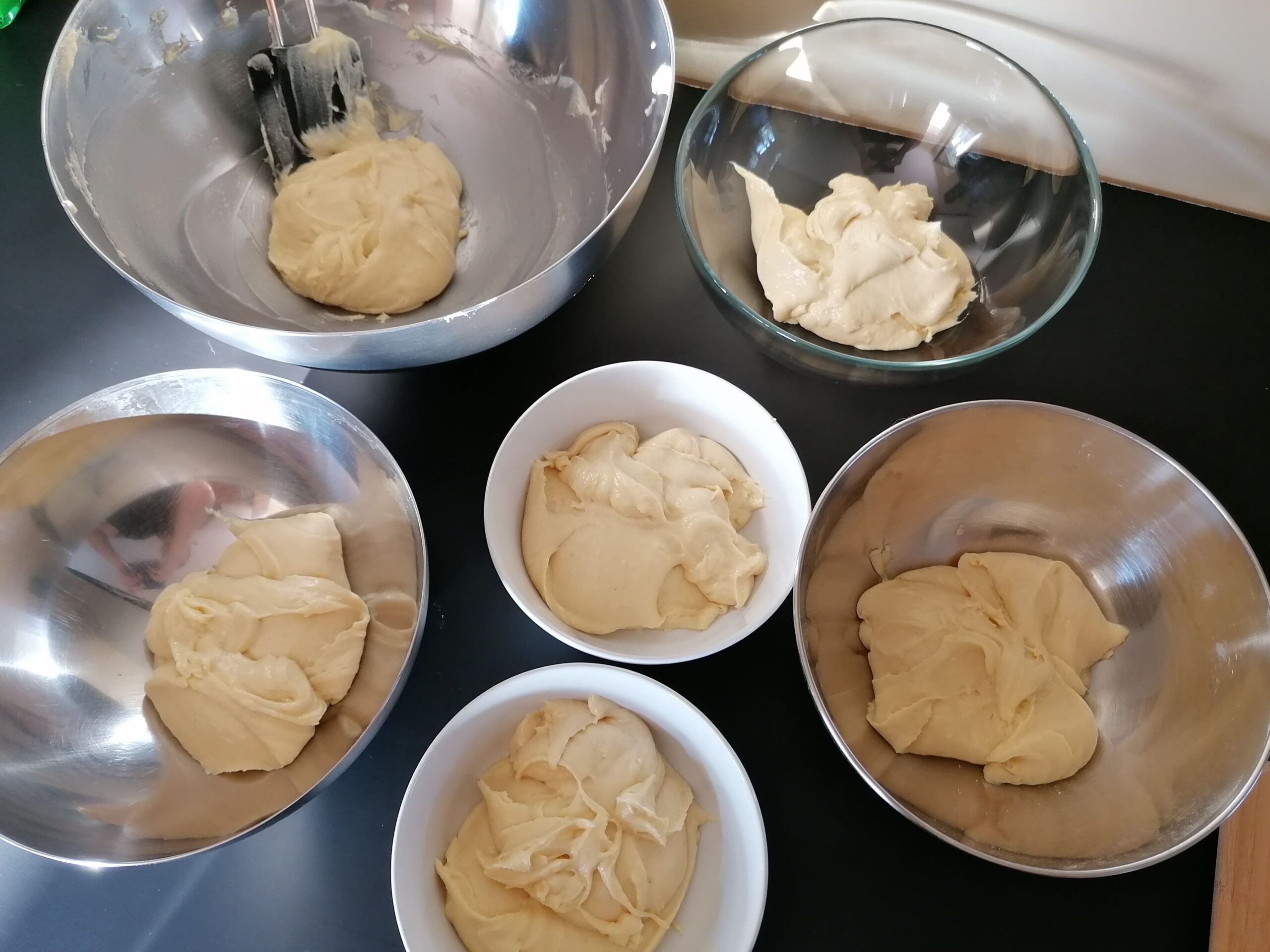 - La base de la pâte à muffins ainsi prête, la diviser, en quantité égale, dans 6 culs-de-poule différents.