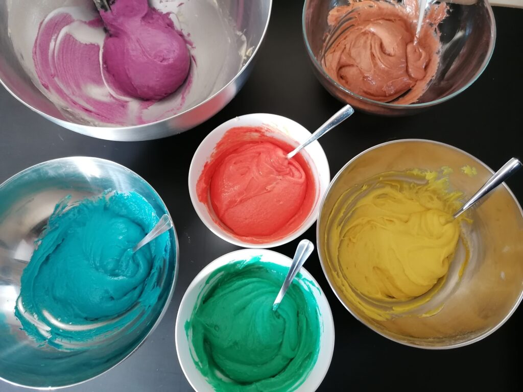 - Pour ce faire, ajouter les colorants petite quantité par petite quantité, en les incorporant, à la spatule, avant chaque nouvel ajout, ceci jusqu’à obtention des couleurs désirées : il est toujours possible d’en ajouter s’il en manque mais impossible d’en retirer s’il y en a de trop !