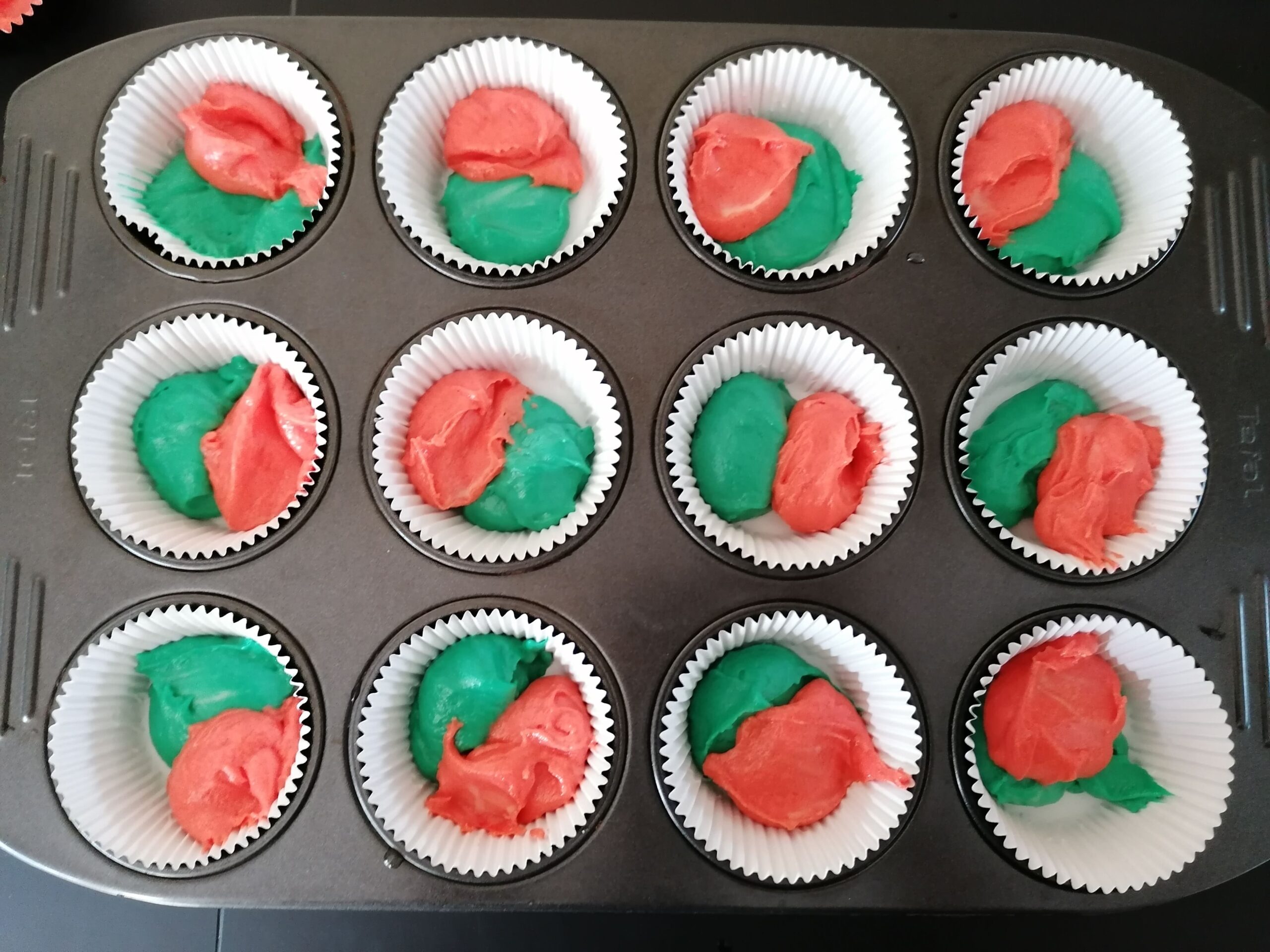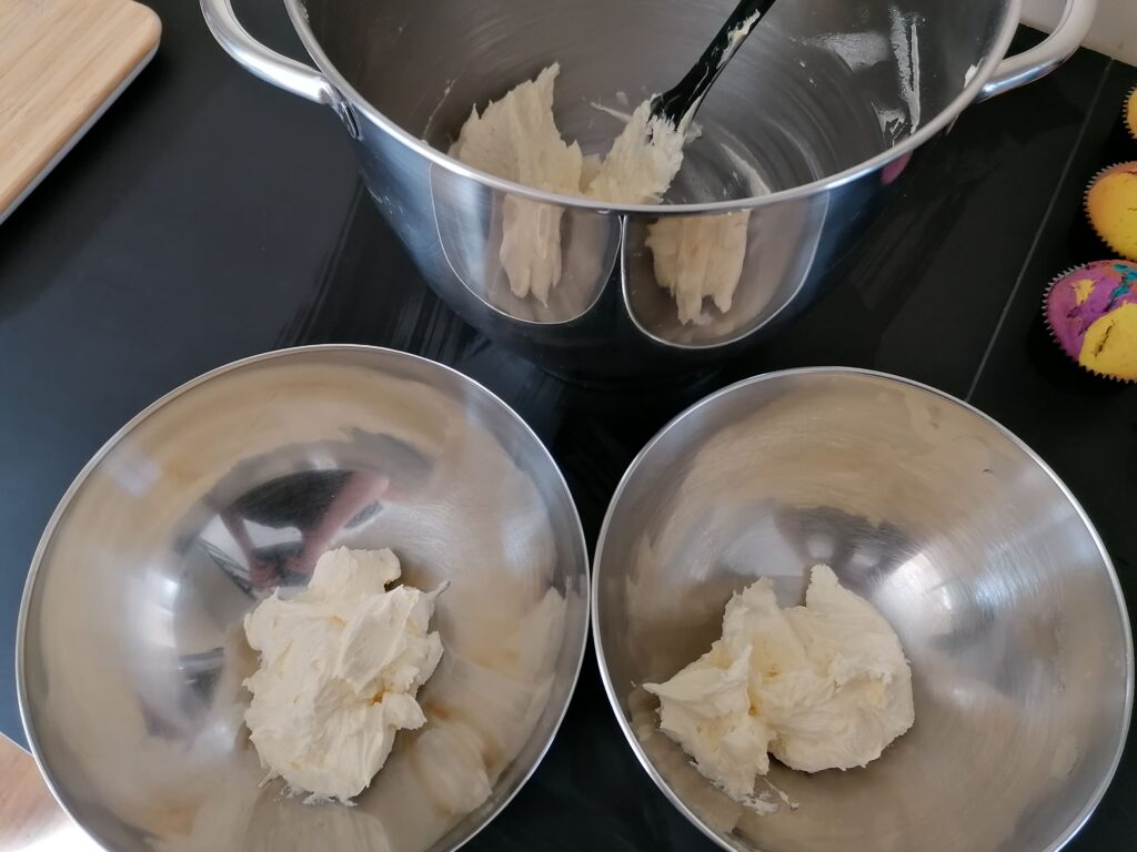 - lors de ces précédentes étapes, mais aussi par la suite et jusqu’au moment du pochage, il est très important de faire attention à ne pas mélanger les 2 préparations/couleurs, ce qui pourrait gâcher le rendu final et désiré du glaçage des muffins.