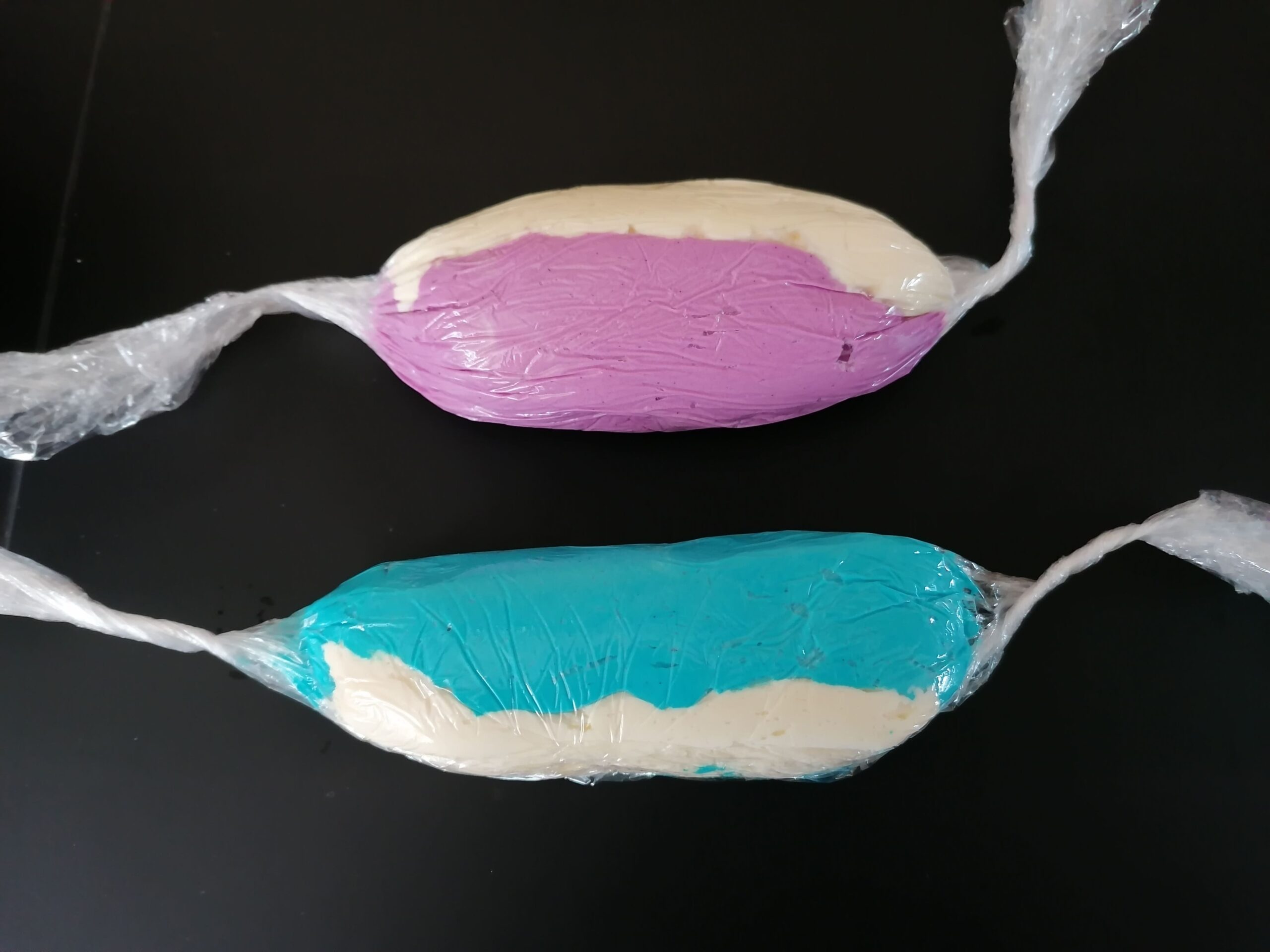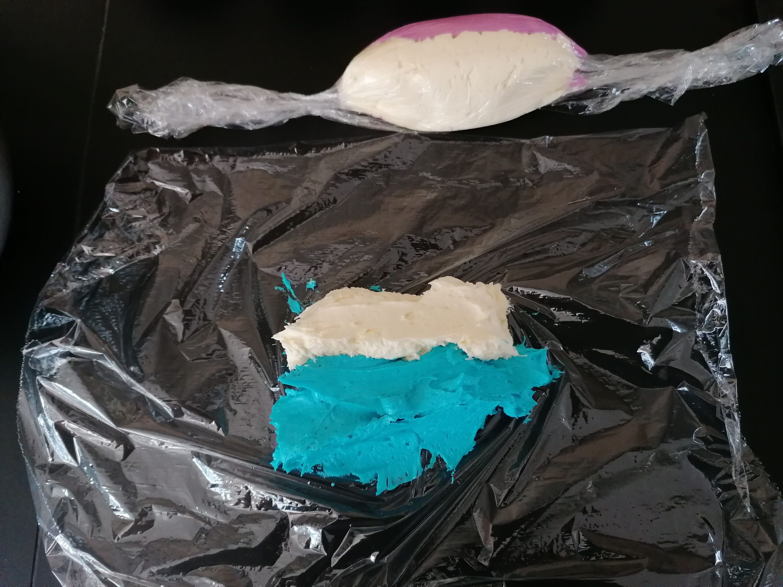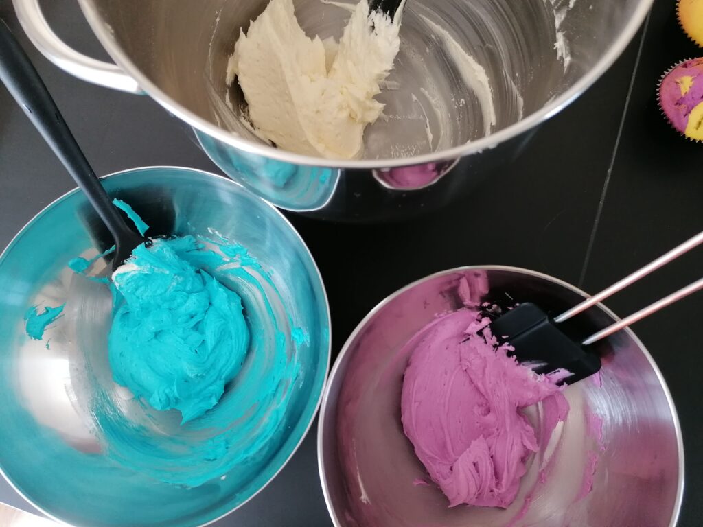 - Recommencer le même processus avec le dernier tiers de crème au beurre bleue avec le dernier tiers de crème au beurre mauve.