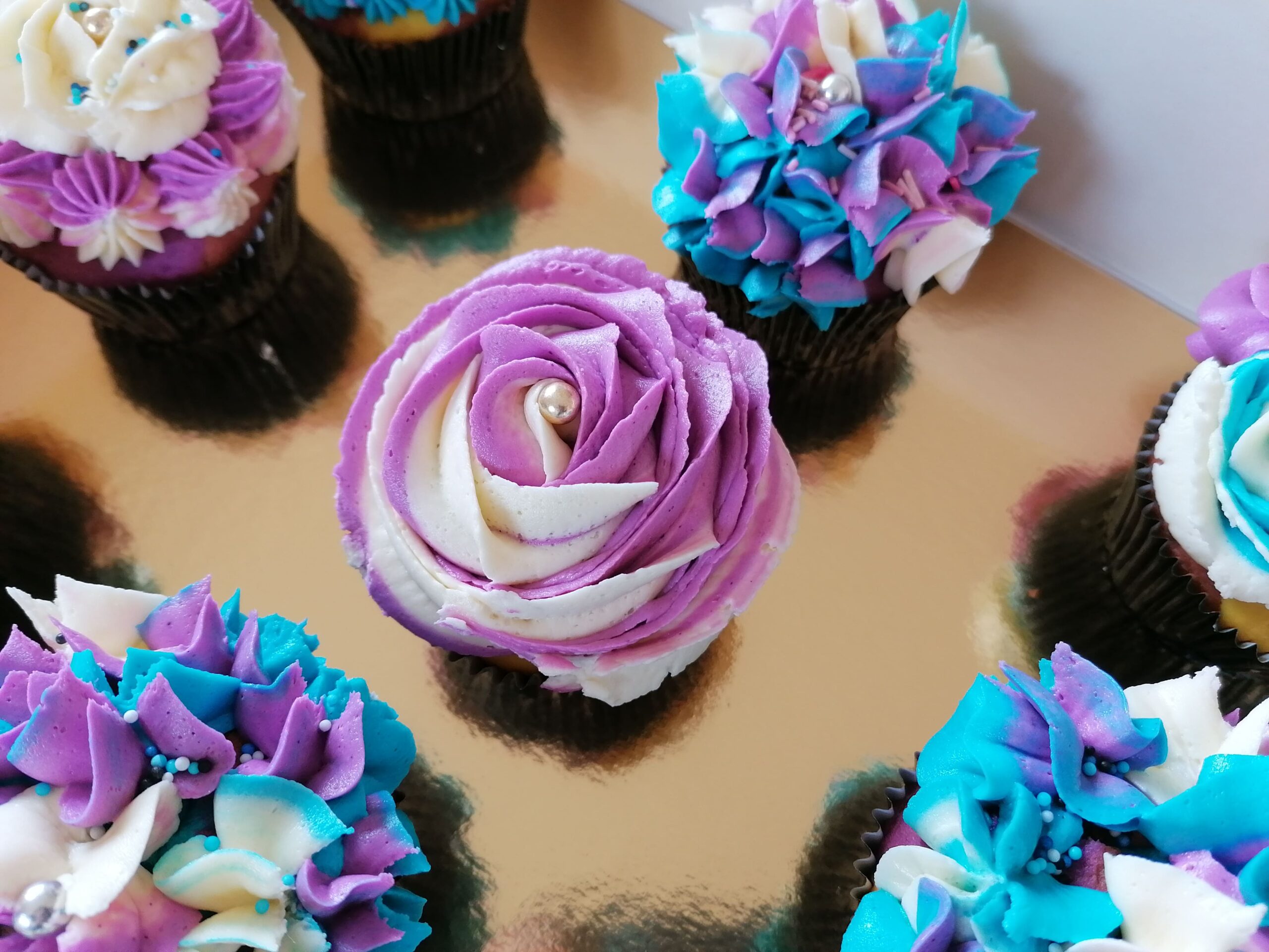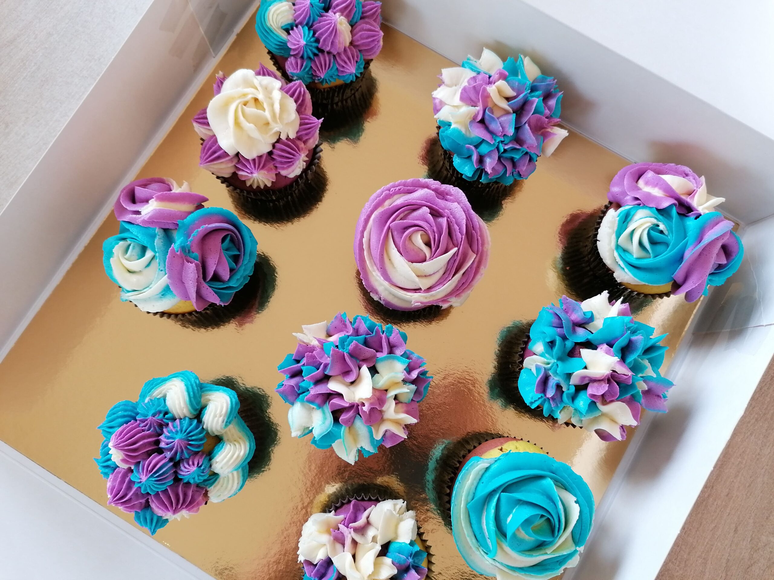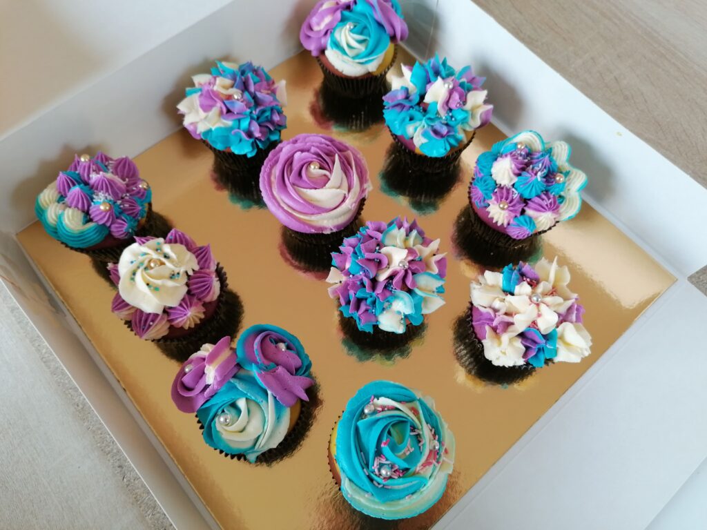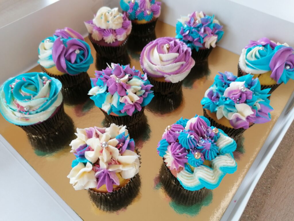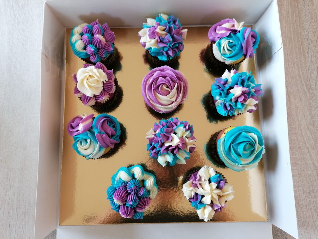 - d’imposantes rosaces blanche/bleue et blanche/mauve prenant la totalité de la surface des muffins utilisés ;