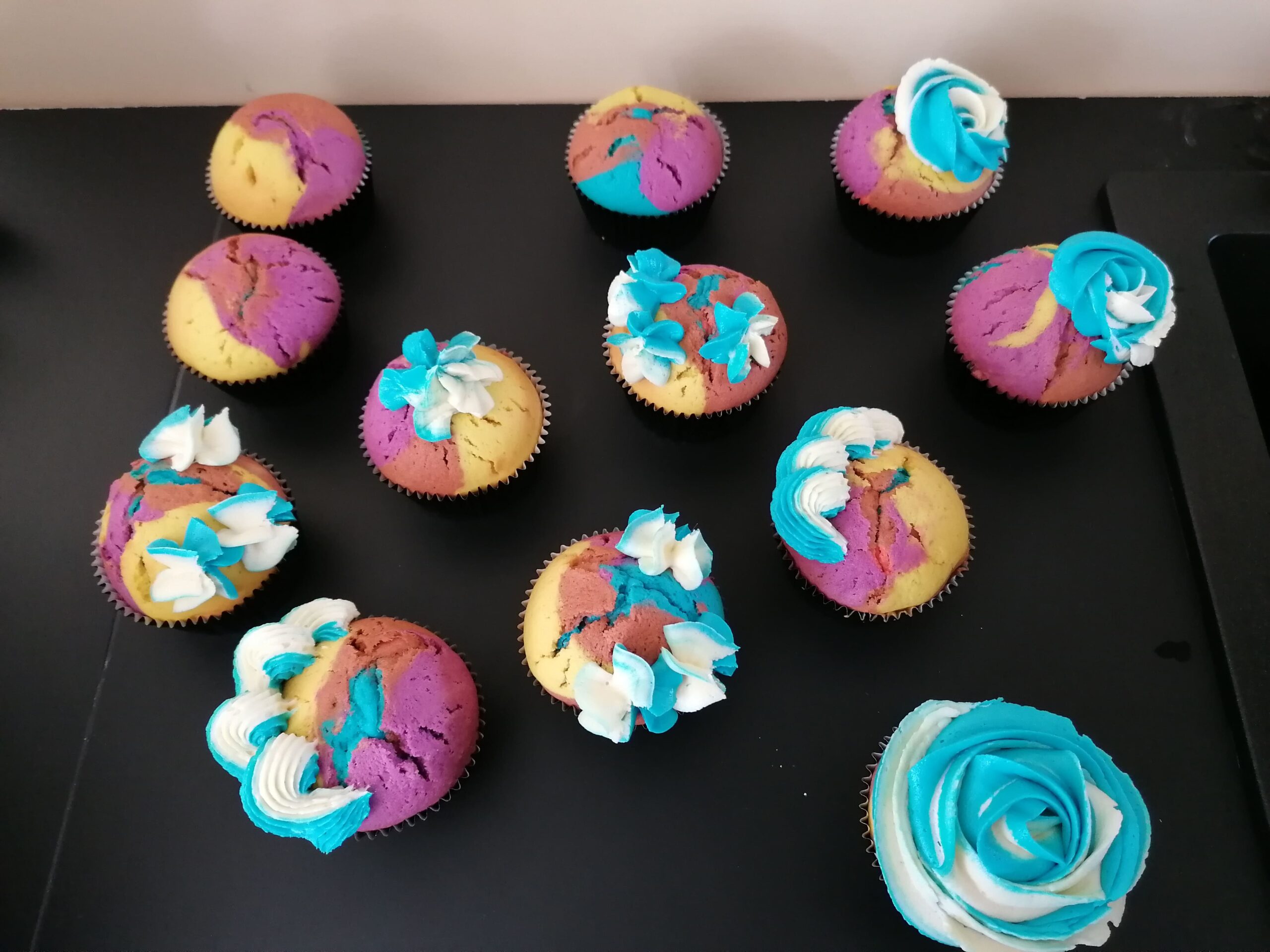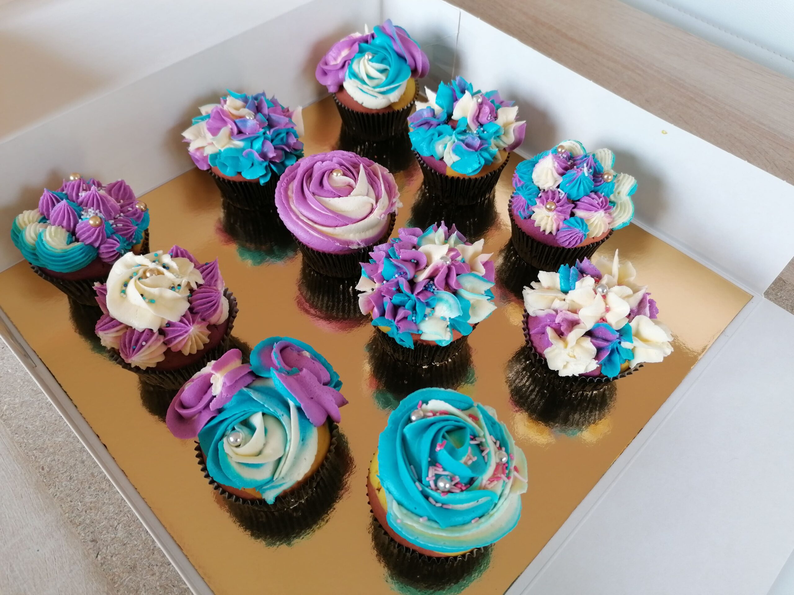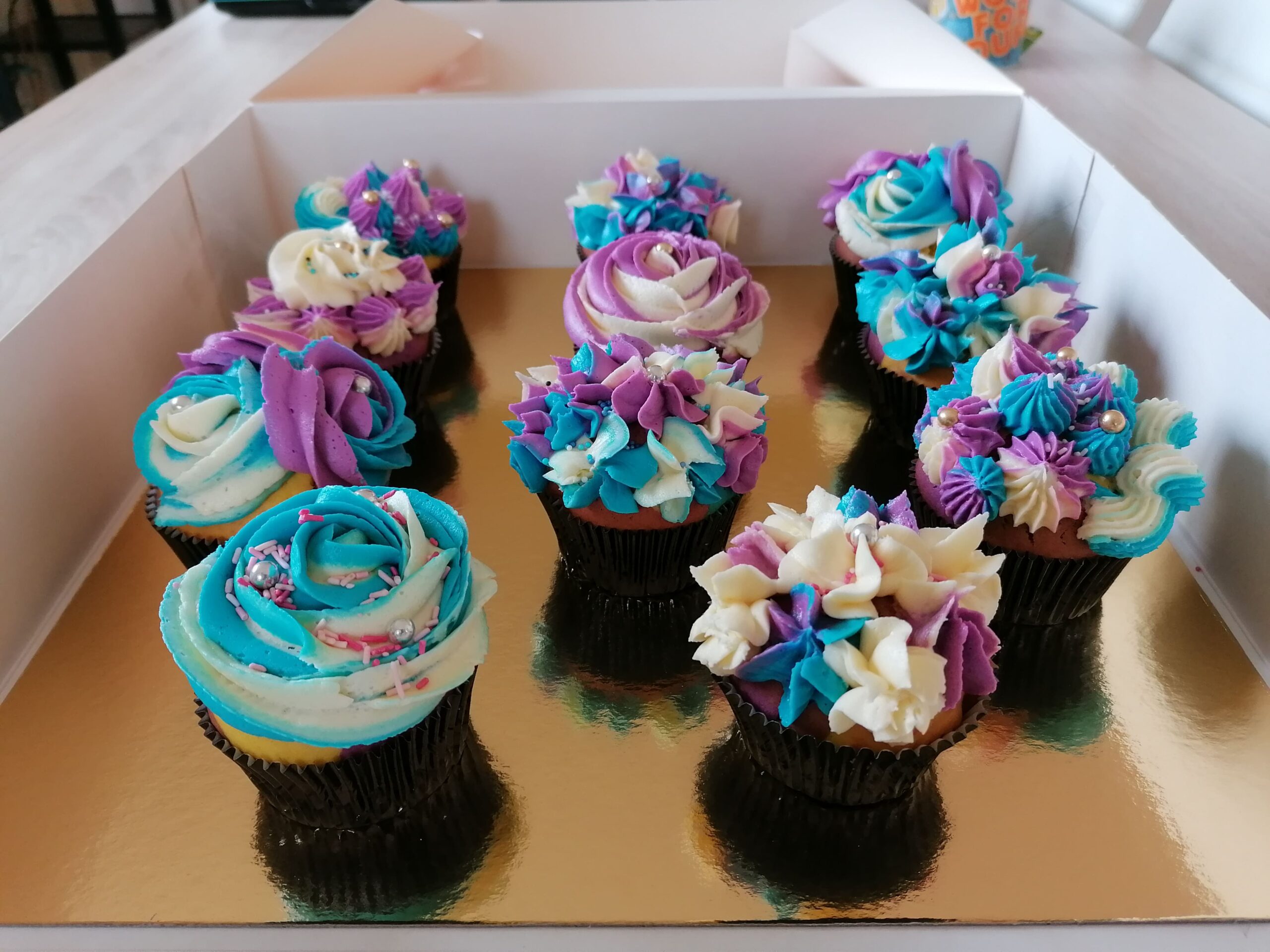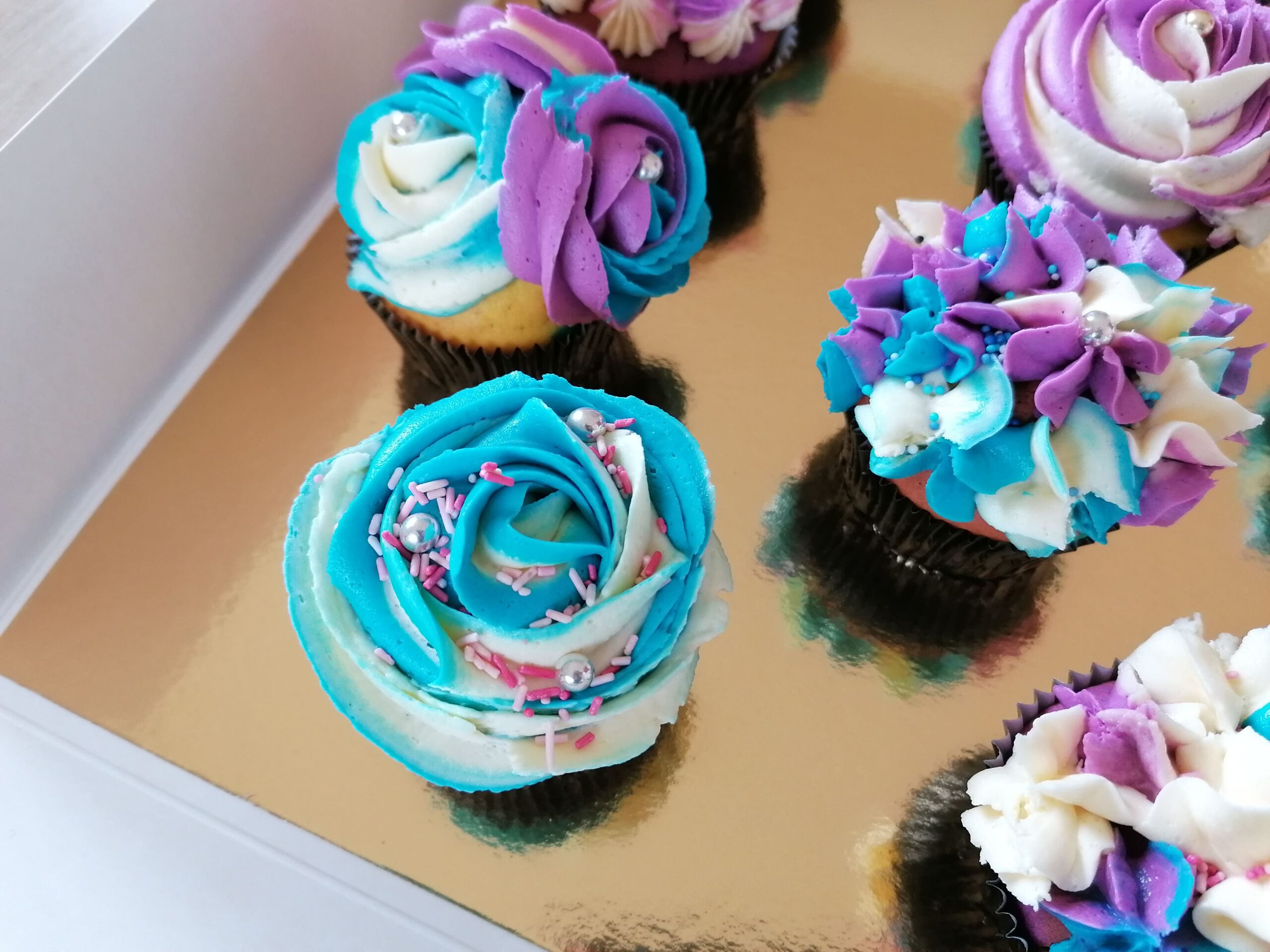 - d’imposantes rosaces blanche/bleue et blanche/mauve prenant la totalité de la surface des muffins utilisés ;