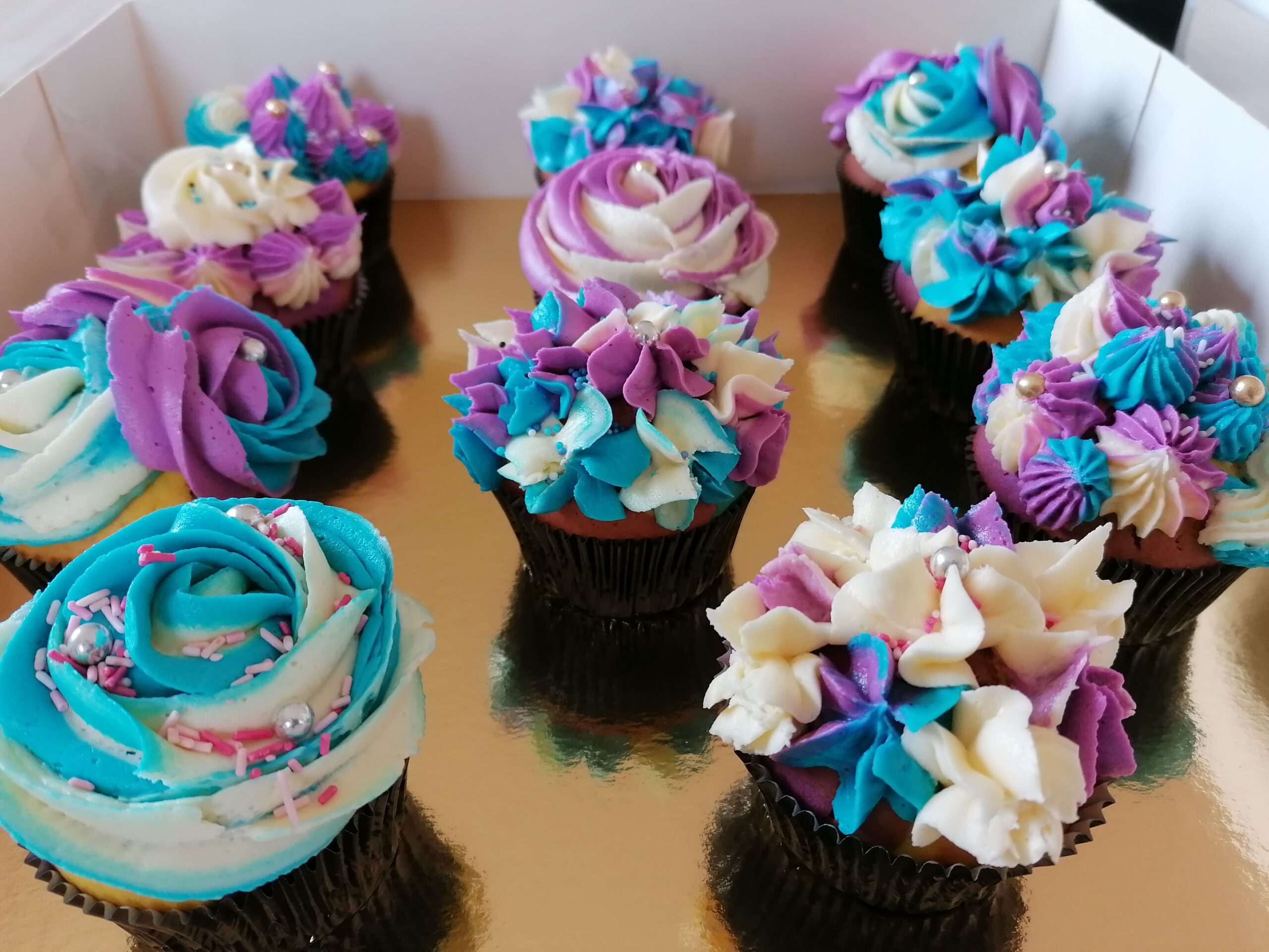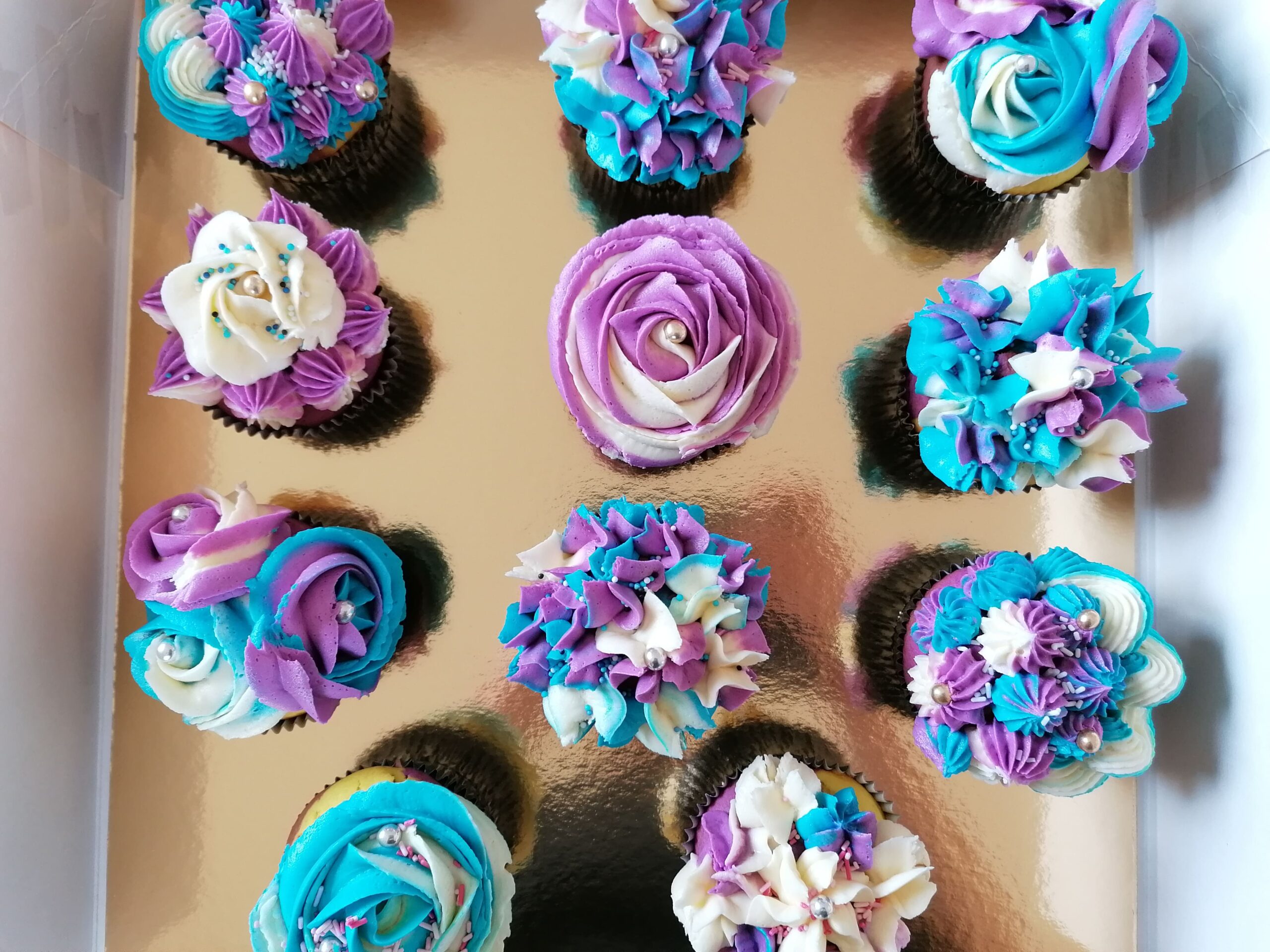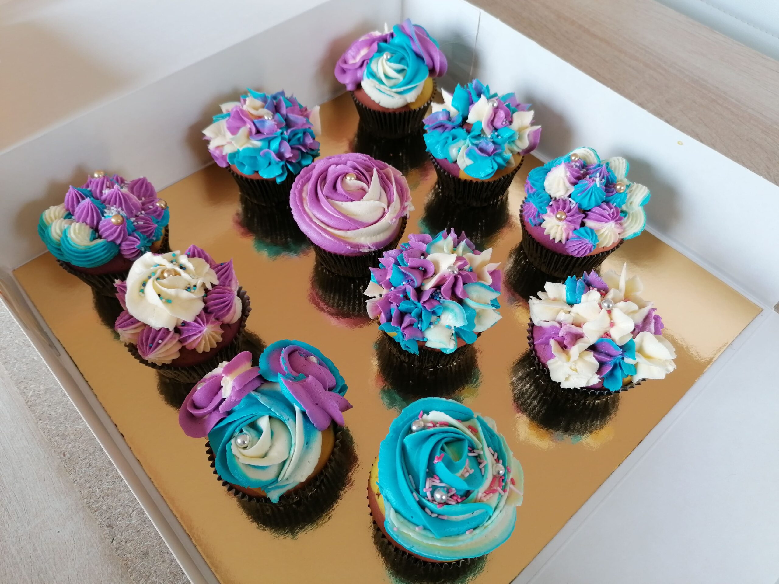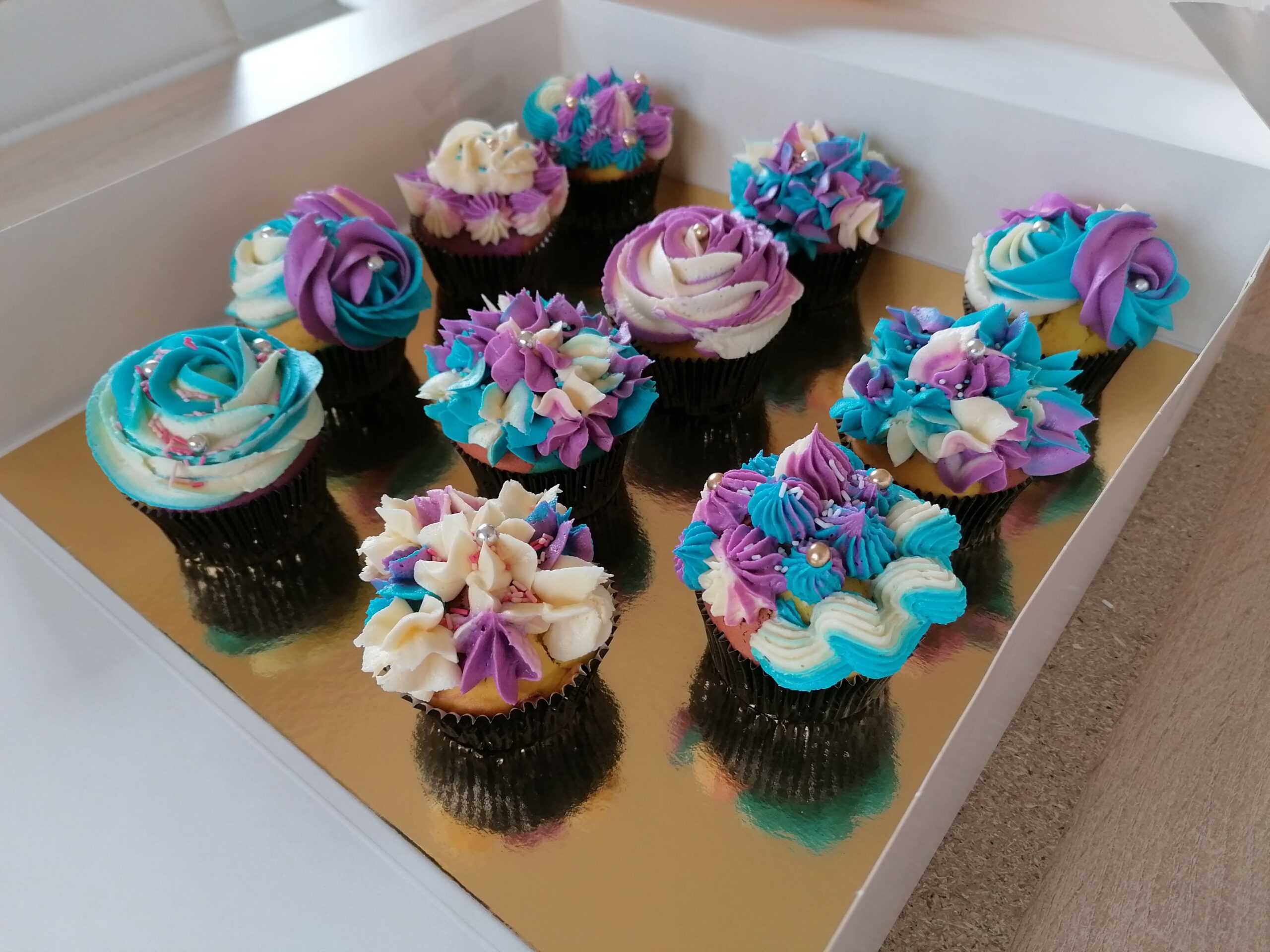 - d’imposantes rosaces blanche/bleue et blanche/mauve prenant la totalité de la surface des muffins utilisés ;
