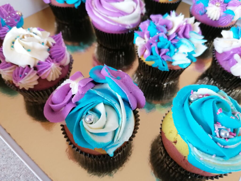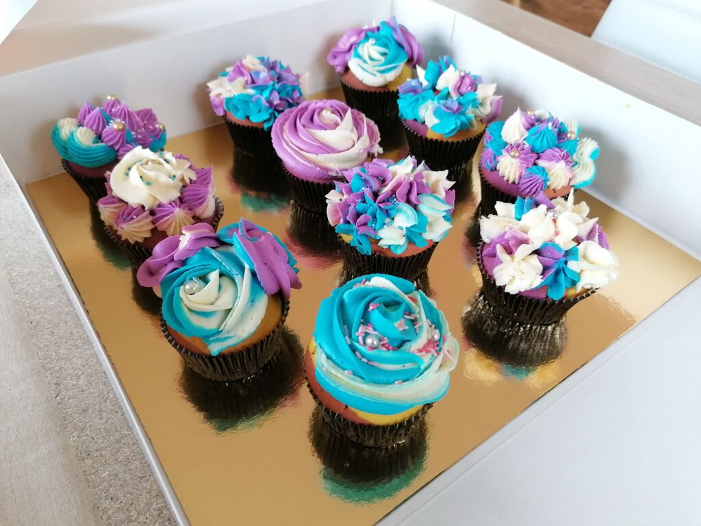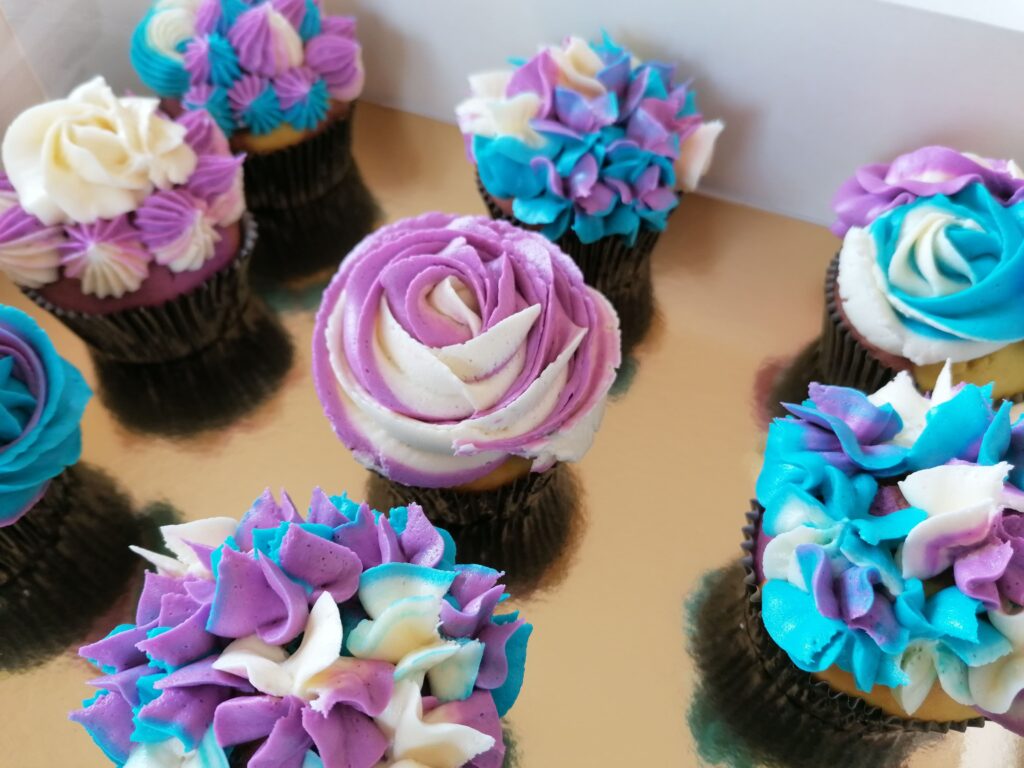 - Il est tout à fait possible, si qu’une seule poche et/ou douille de disponible, de glacer chacun des muffins avec la poche garnie du boudin blanc/bleu, en laissant la place nécessaire aux autres décors prévus le cas échéant sur chacun des muffins, avant de le retirer une fois terminé, de nettoyer l’extrémité de la poche mais aussi la douille afin de ne pas mélanger les couleurs des différents boudins qui pourraient se retrouver et gâcher le glaçage final, pour y placer le second boudin de coloration blanche/mauve, et ainsi de suite….