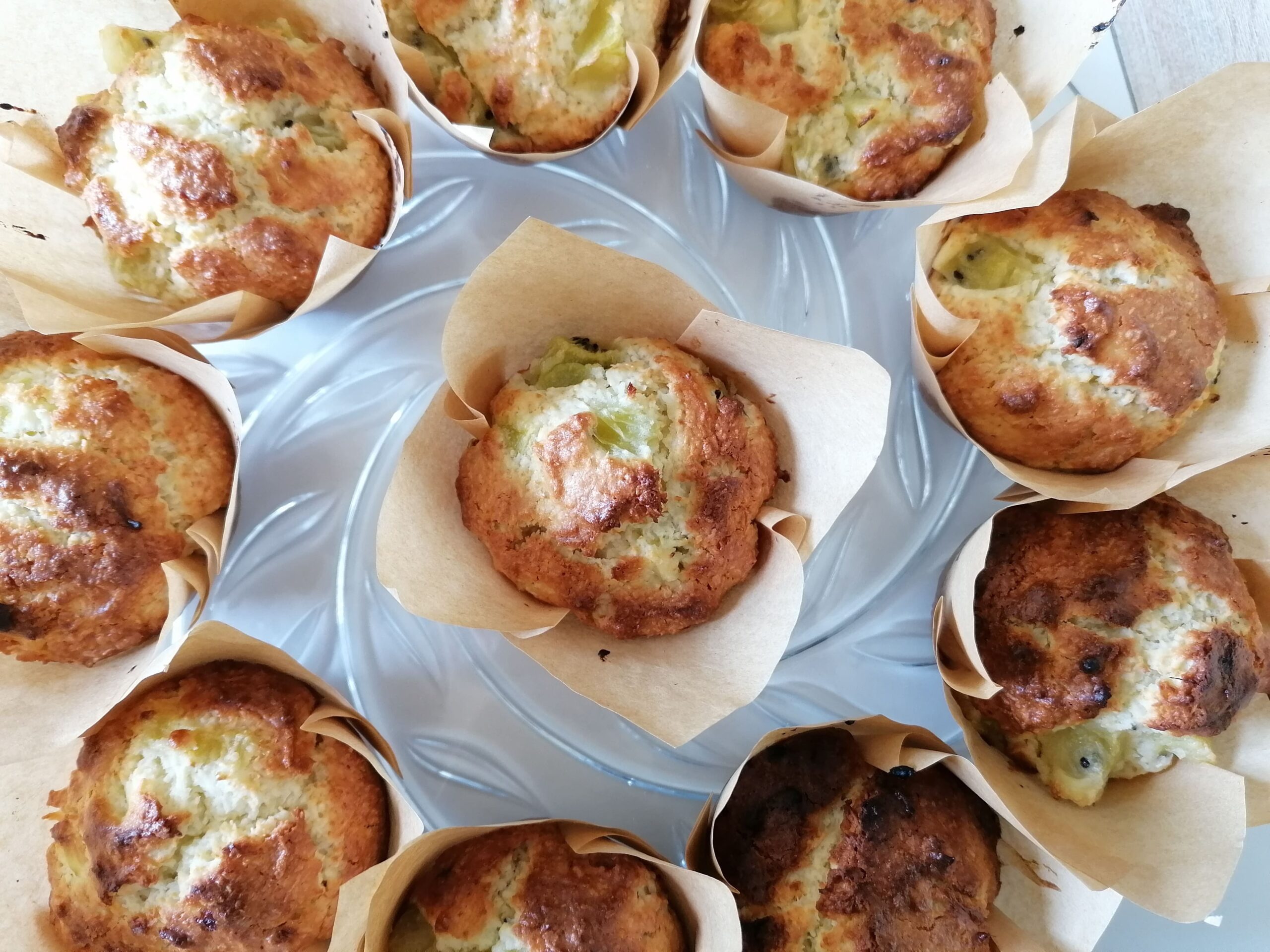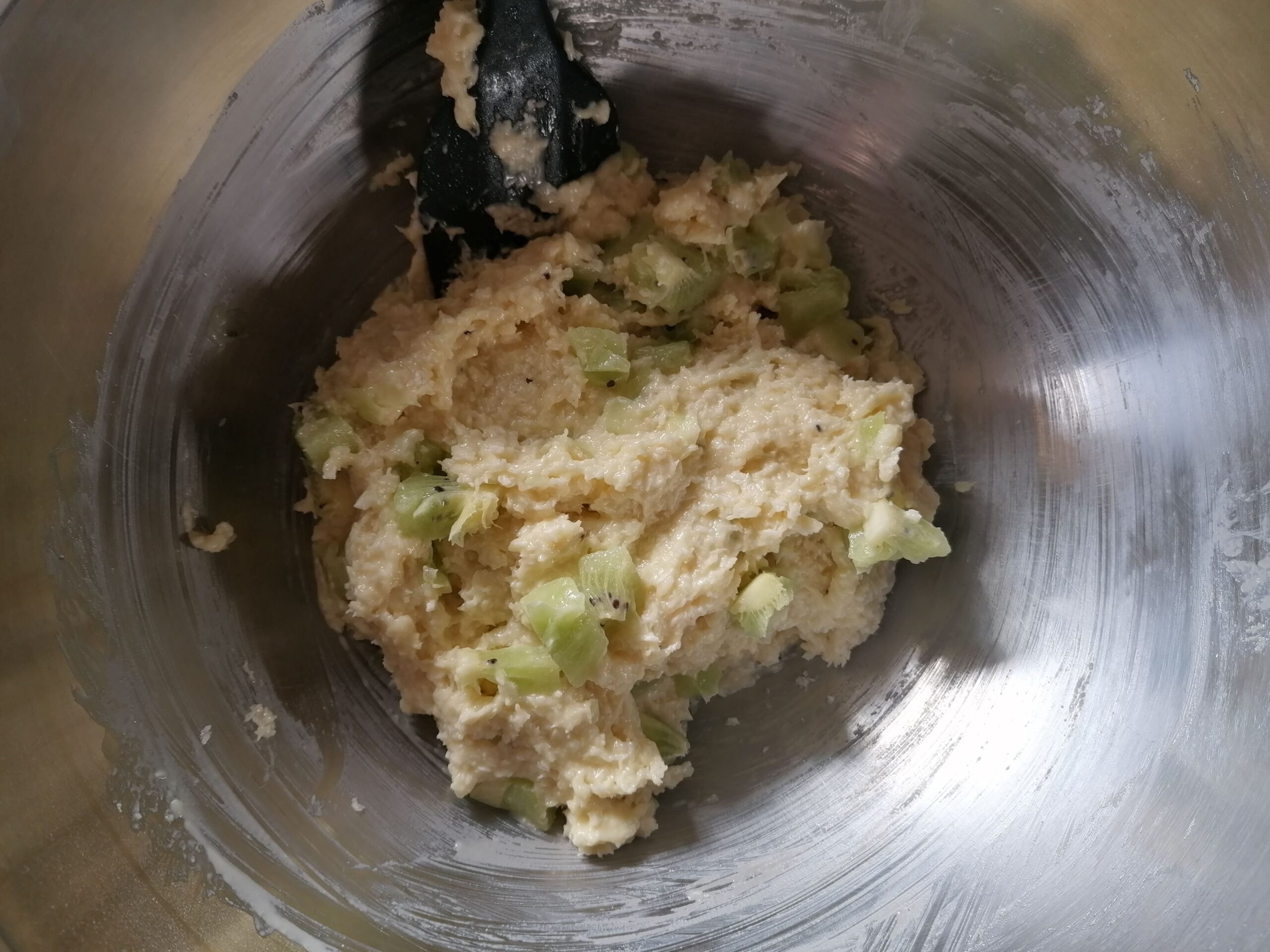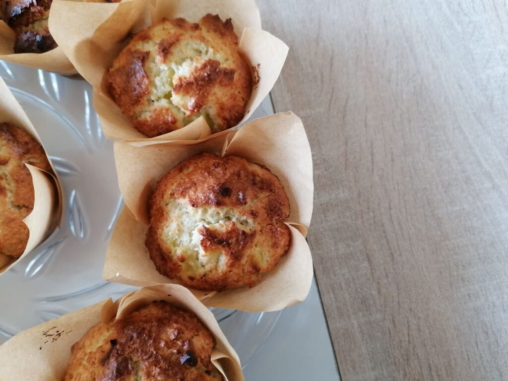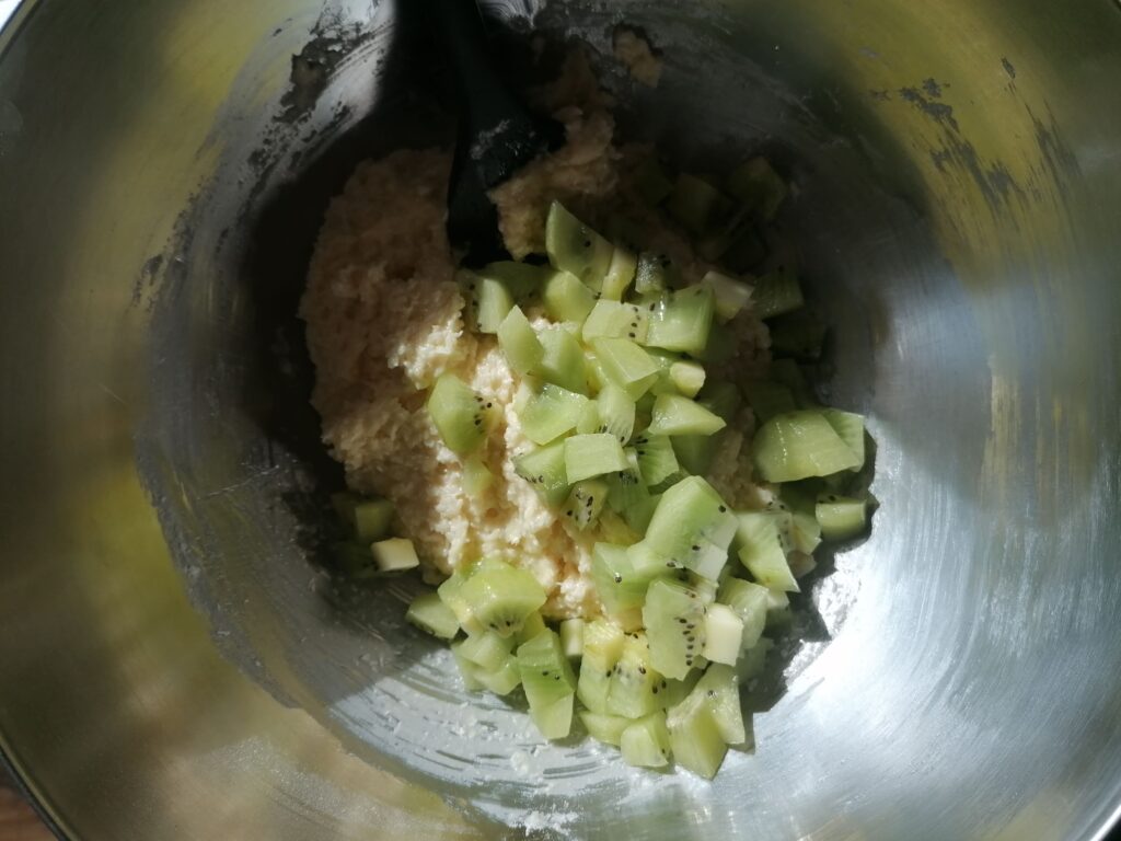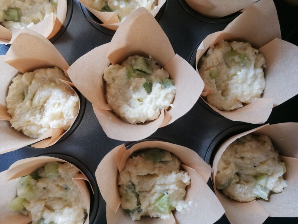 - Réaliser la pâte à muffins en ajoutant la noix de coco râpée dans les matières sèches, en remplaçant le lait entier par de la crème de coco, en retirant les pépites de chocolat noir et en incorporant, en fin de préparation, l’arôme coco ainsi que du kiwi coupé en morceaux plus ou moins gros, qu’ils soient frais comme ici, surgelés ou préalablement égouttés sur de l’essuie-tout s’ils sont en sirop.