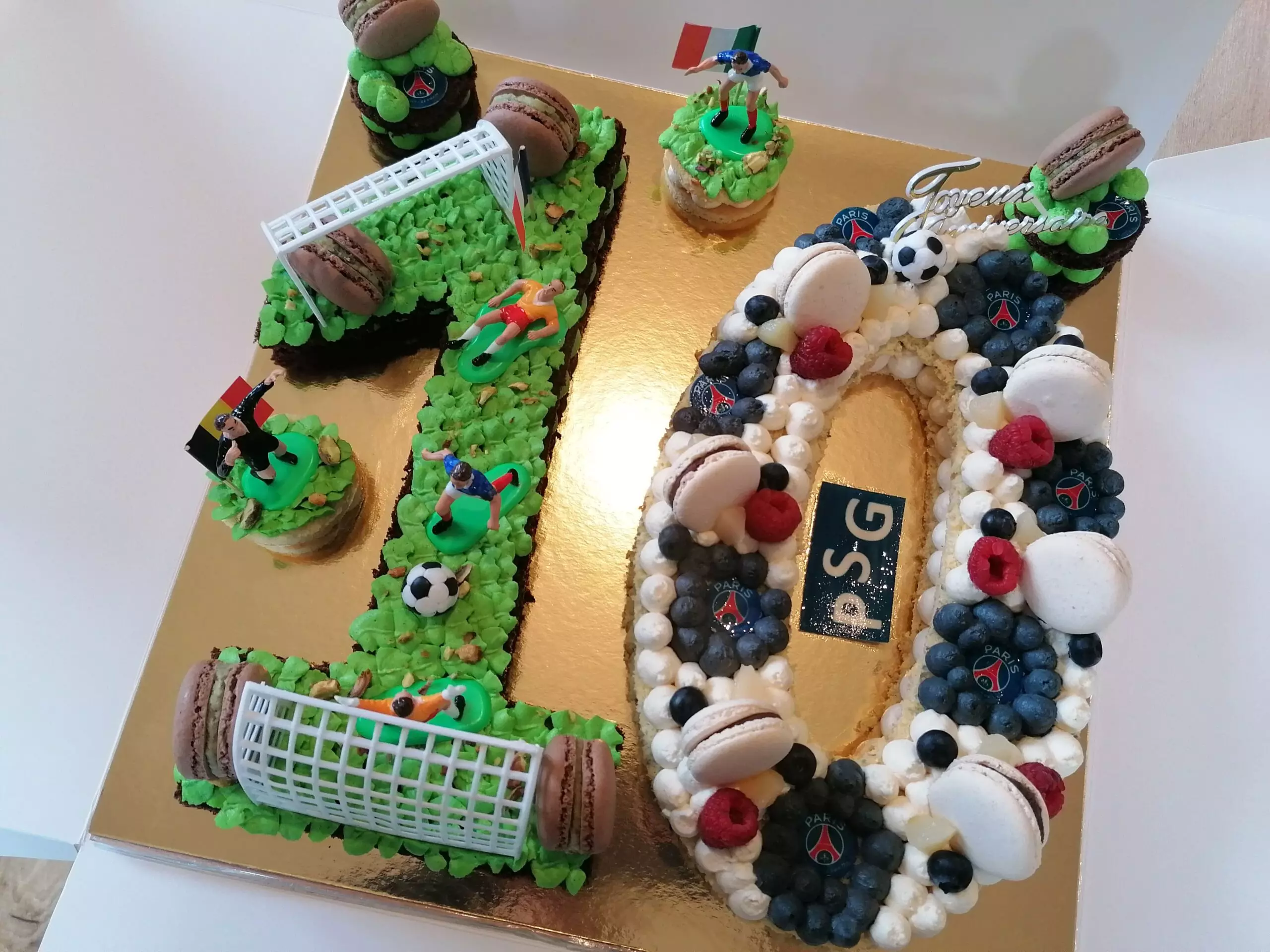 - décor final : représentation des traits d’un ballon de foot avec la garniture de base, la crème chantilly mascarpone vanille blanche restante, puis colorée en noir, décors azyme thème PSG (disques et bande), macarons choco lait framboises, fruits frais (framboises et myrtilles) et au sirop (poires), ballon de foot en pâte à sucre & décor plastique « Joyeux anniversaire »