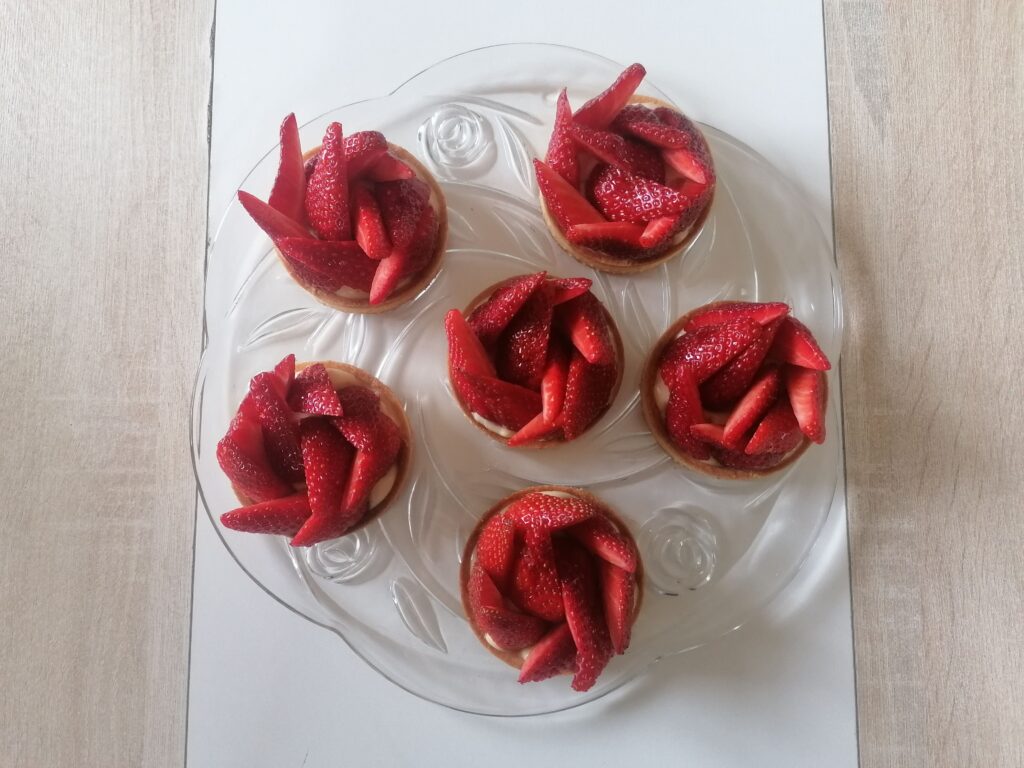 - Réaliser le décor de chacune des tartelettes en disposant, harmonieusement et délicatement, sur chacune d’entre elles des quarts de fraises de manière à masquer quasi complètement la crème pâtissière restée dessous, ce qui va permettre de protéger la garniture de l’air ambiant tout en donnant un maximum de volume aux tartelettes.